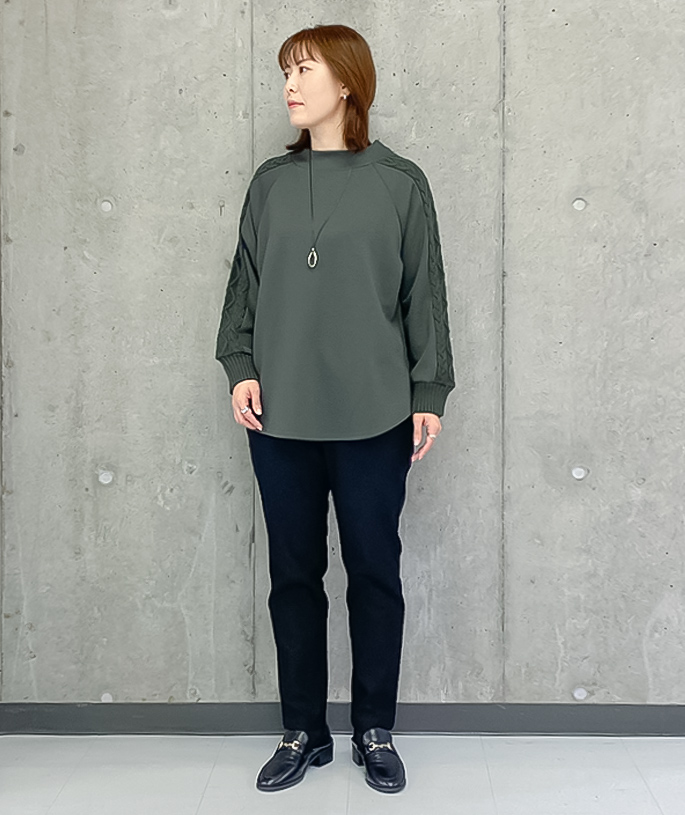 ストレッチが効いたパンツは、少し緩みがあるスリムタイプ。履きやすく、裏起毛で冬の寒さに暖かく履けるパンツです。トップスはチュニック丈を選んでヒップラインやおなか周りを覆うことで全体のシルエットがスッキリ見えします。
