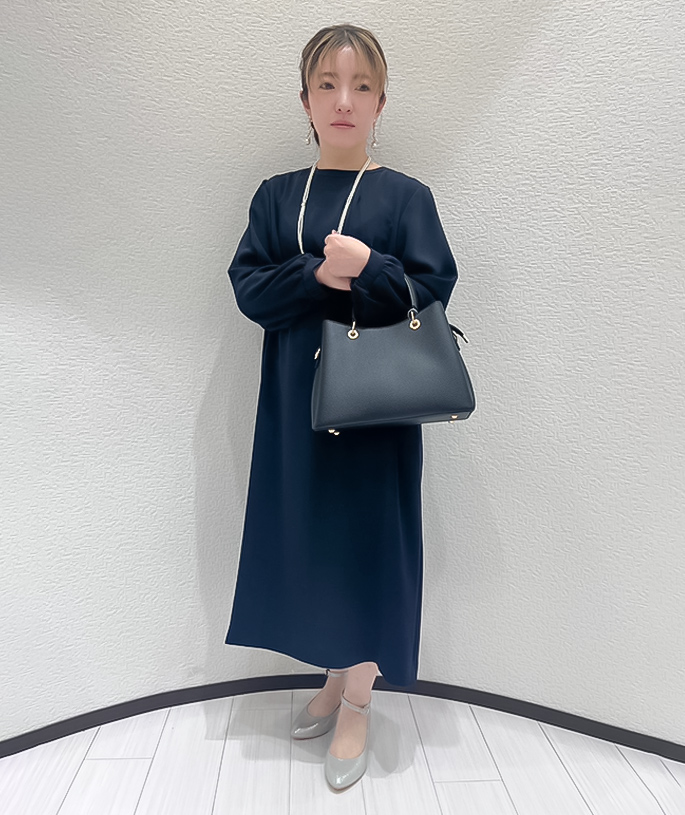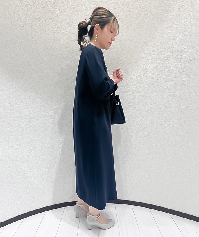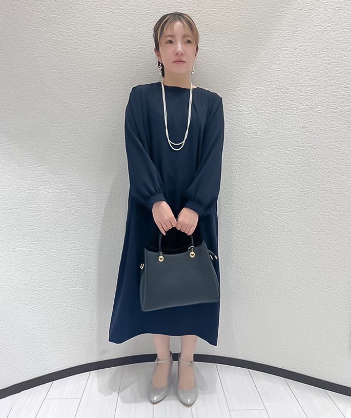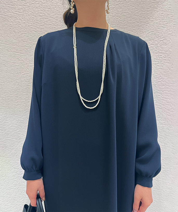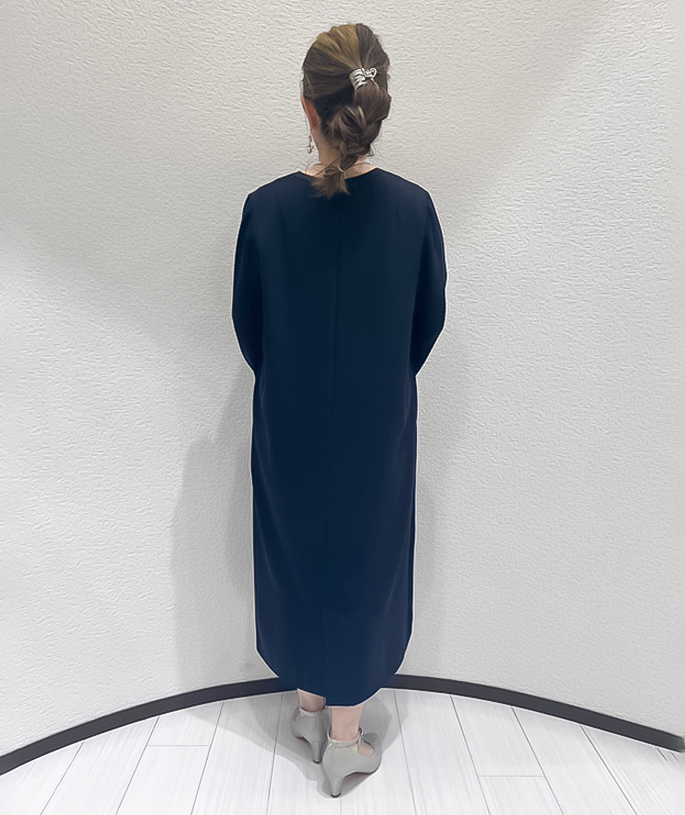 セレモニーから冠婚葬祭まで幅広く使いやすい、シルエットが綺麗でシンプルなワンピースです。左肩にタックが入っていて、程よいドレープ感があります。ブローチ付で清楚な華やかさがプラスされますが、パールのネックレスを付けるのもおすすめです。