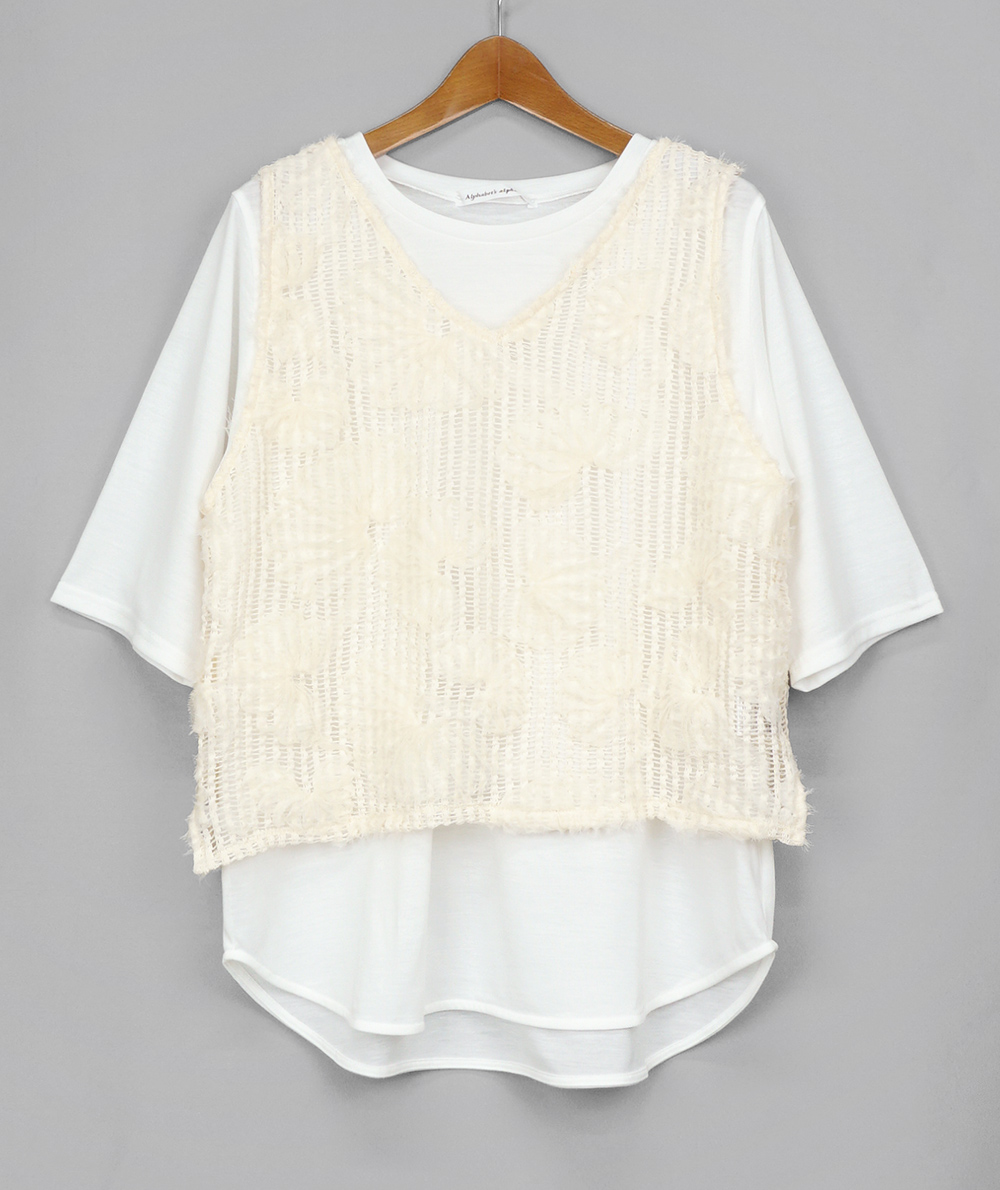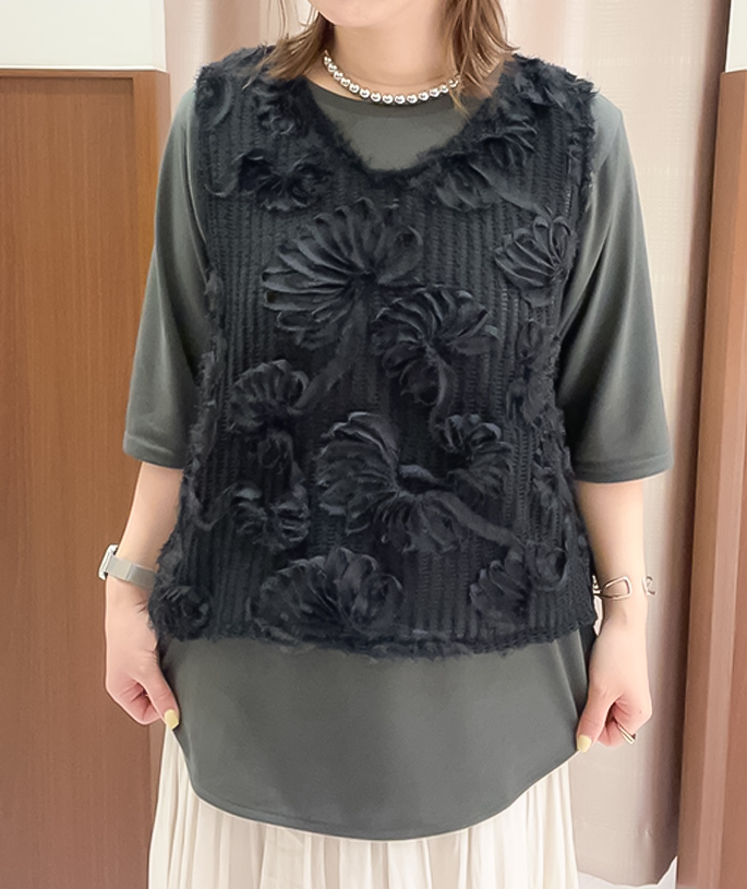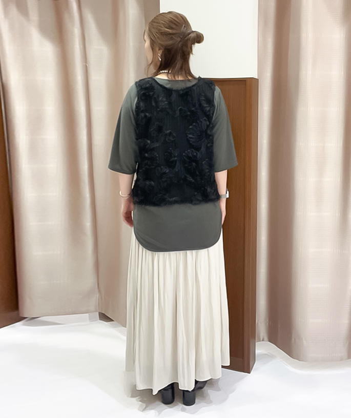 ベストとチュニックがセットになったトップスは別々でお使い頂けるアイテムです。Tシャツは長めの袖丈で、肘も隠れるので夏は1枚でも着やすいです。今はセットで着用し、上にアウターを羽織ってもコーディネートのポイントになるのでとてもおすすめな一枚です。