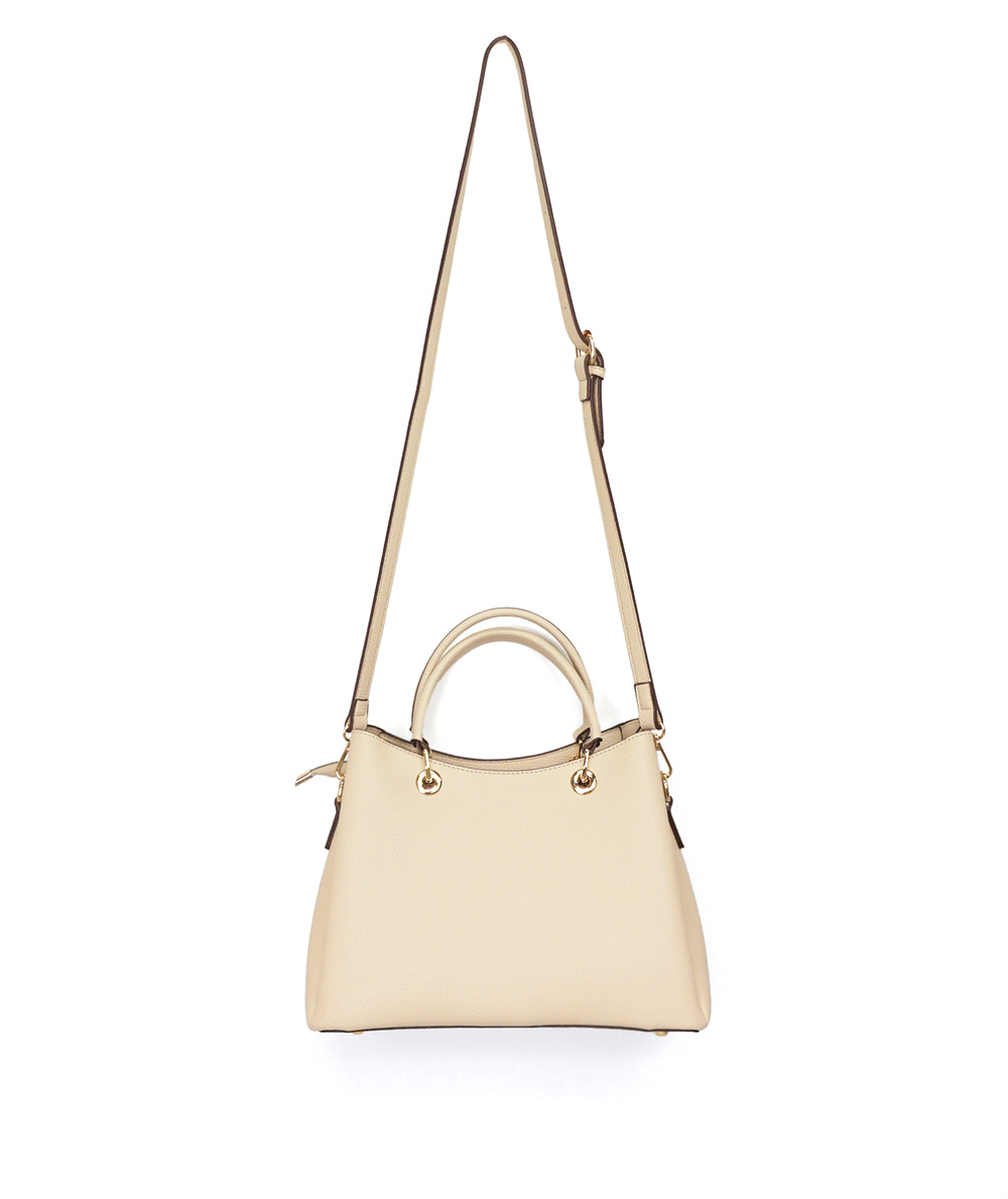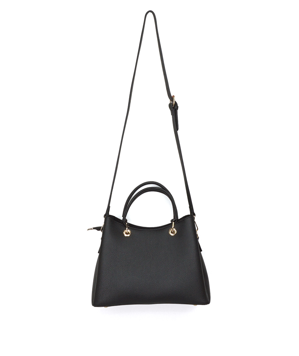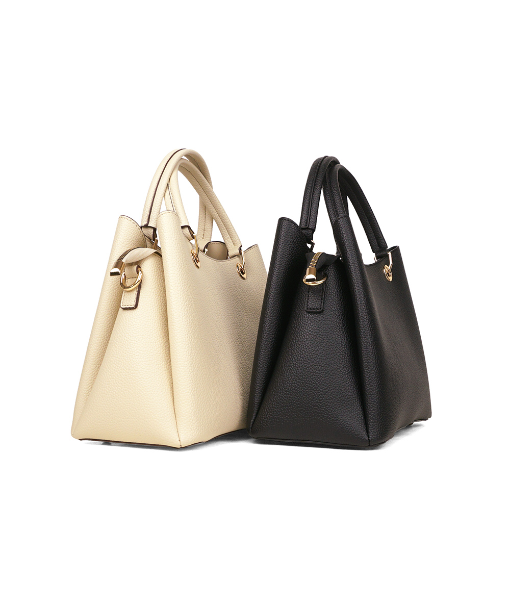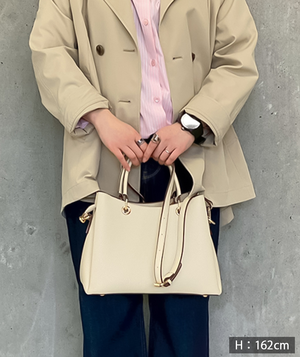 手持ちとショルダーで肩掛けにできる2way仕様のバッグ。両面にはあおりポケットが付き収納しやすくなっています。中央にはファスナーが付いていて使い勝手も良いです。シンプルなデザインでどのシーンにも、どのお洋服にも合わせやすいバッグです。