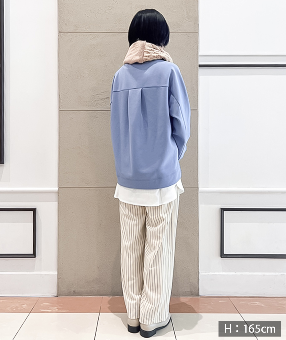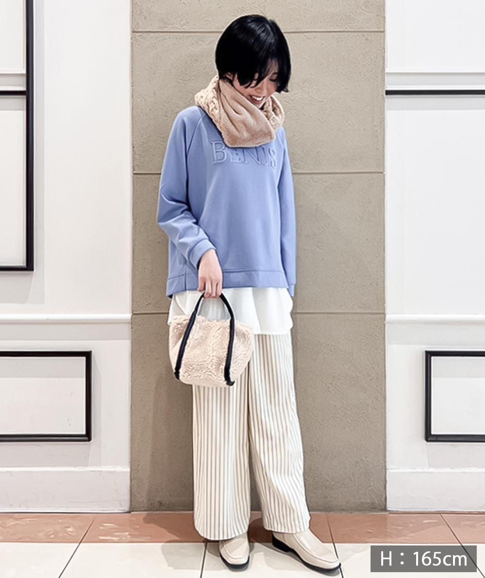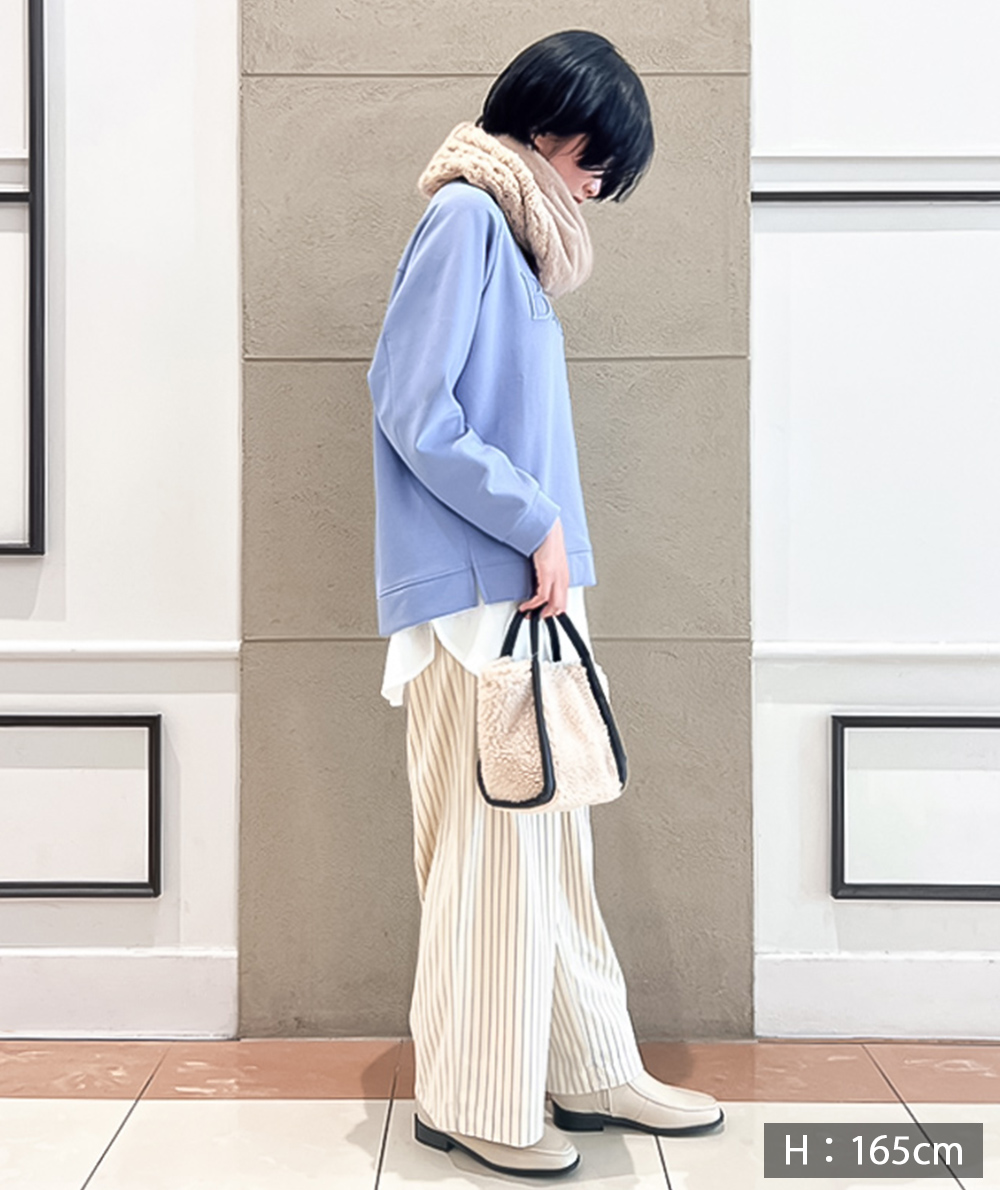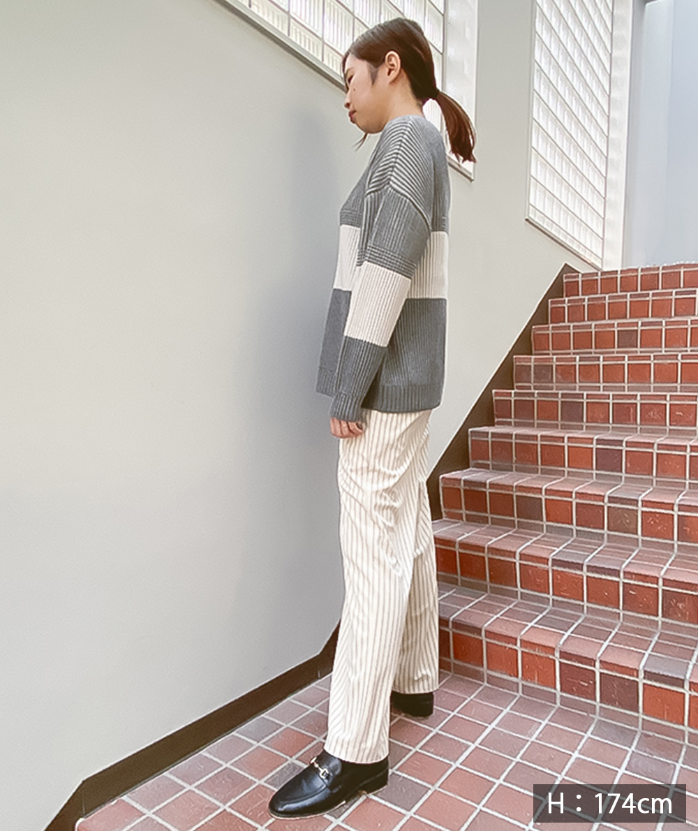 トレンドのベロア素材にストライプがプリントされたパンツが登場。ストンと落ちるストレートシルエットは身体のラインを拾わないので◎カジュアルなスウェットやニットと相性が良く、程良い光沢があるのでラフになり過ぎません。オーバーサイズなトップスと合わせていただくのもバランスが取りやすくておすすめです。