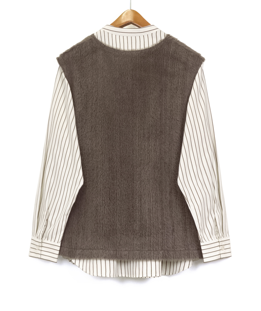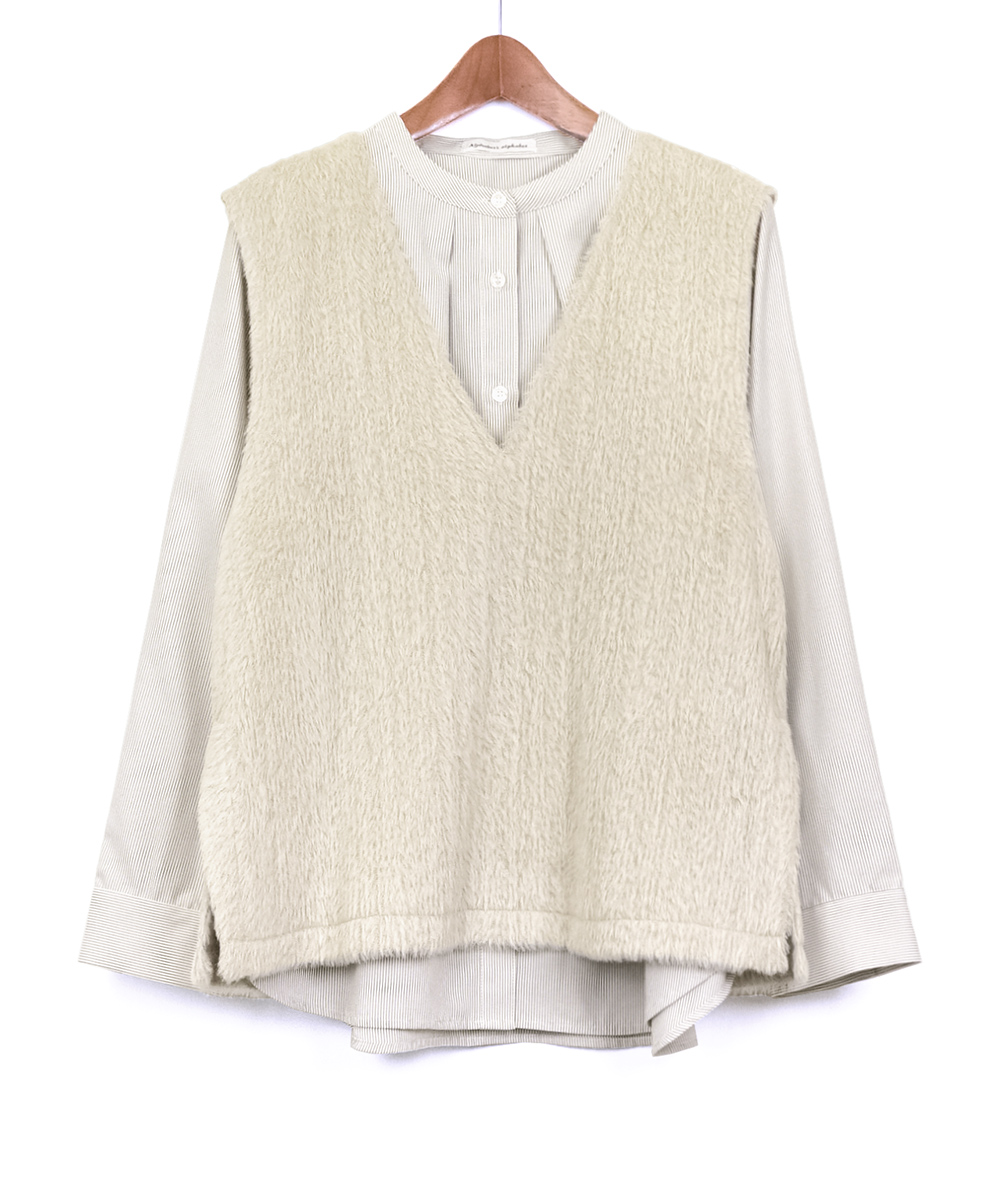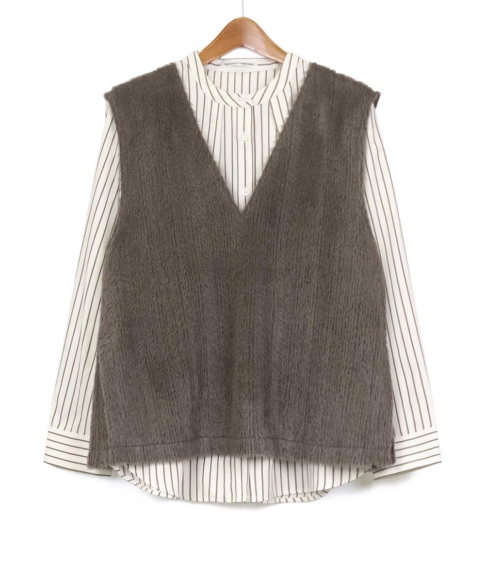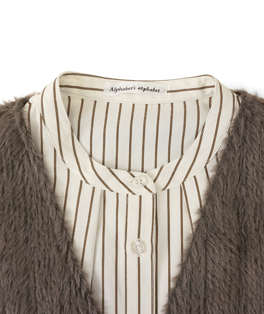 バンドカラーに仕立てたブラウスに、今っぽさのあるファー素材を使用したベストをレイヤードしたセットアイテム。ブラウスはストライプ柄を採用し、見た目以上にスッキリ感のあるルックス。ベストは軽い着心地でブラウスと合わせれば一気にトレンド感がUP。お手持ちのアイテムとのレイヤードスタイルも楽しめる着回しがきくアイテムです。
