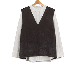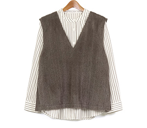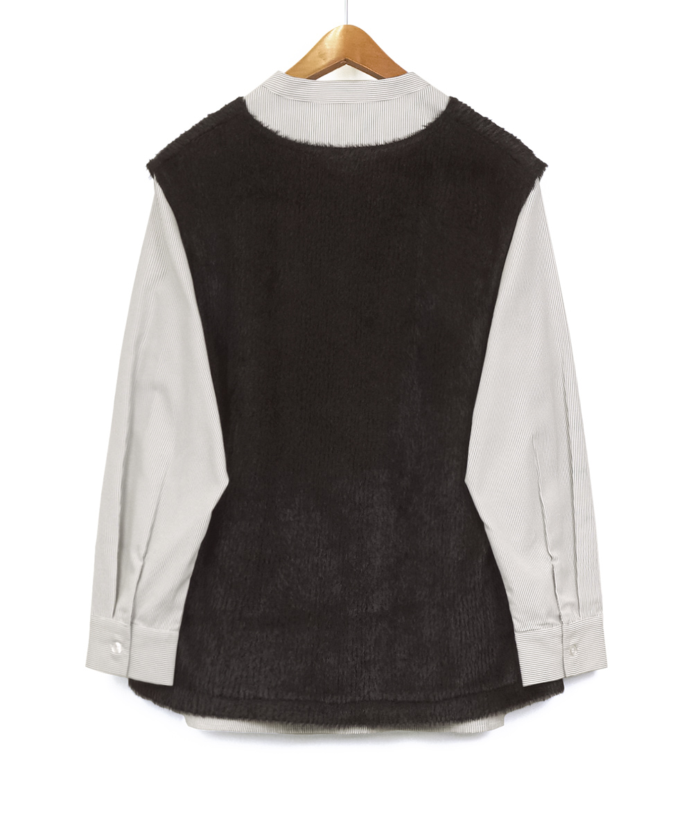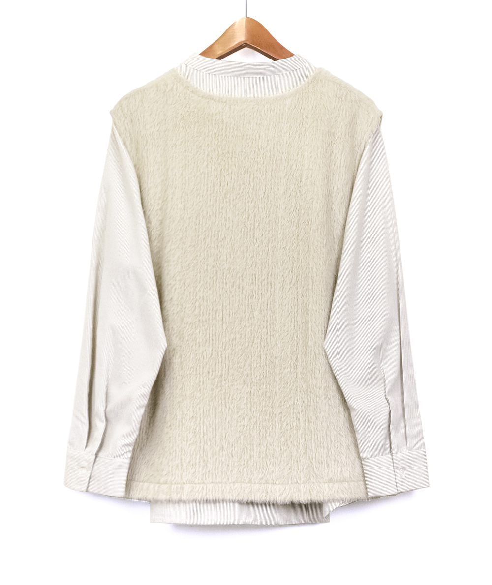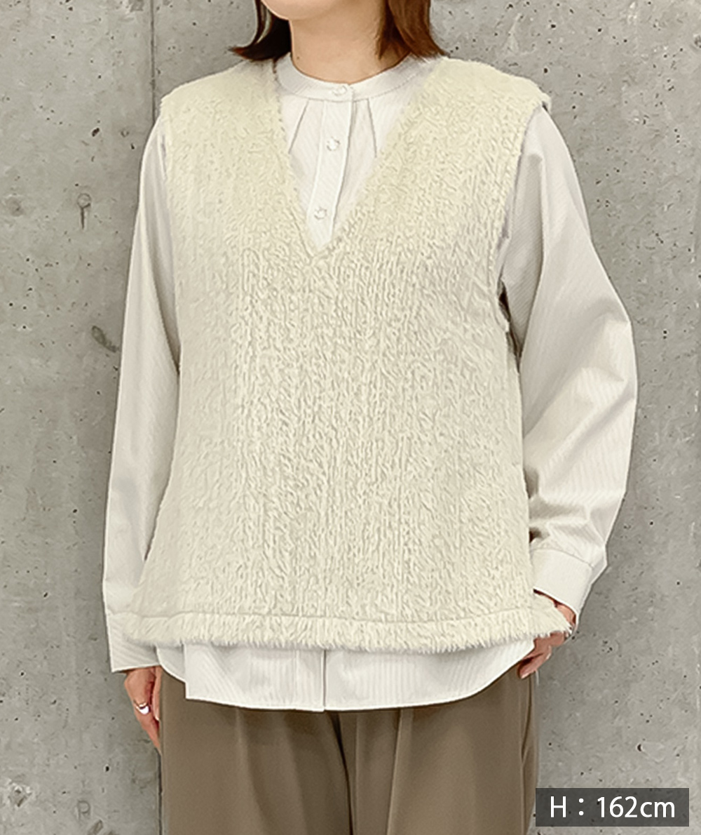 バンドカラーに仕立てたブラウスに、今っぽさのあるファー素材を使用したベストをレイヤードしたセットアイテム。ブラウスはストライプ柄を採用し、見た目以上にスッキリ感のあるルックス。ベストは軽い着心地でブラウスと合わせれば一気にトレンド感がUP。お手持ちのアイテムとのレイヤードスタイルも楽しめる着回しがきくアイテムです。