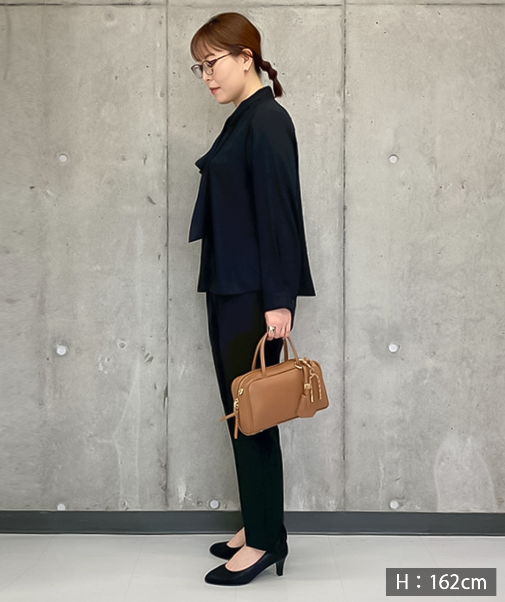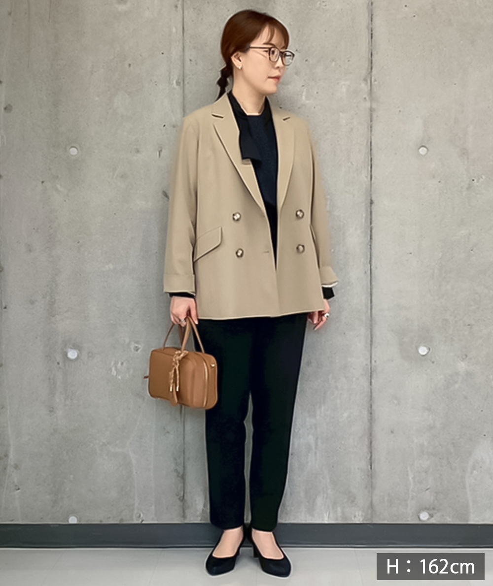 伸縮性のある生地で仕上げたMサイズのテーパードパンツ。センタープレスできれいな縦ラインを作り、スタイリッシュに決まる仕上がりです。ストレッチ感があるので履き心地良く、お仕事でも活躍します。単品使いはもちろん、同素材のキーネック8分袖ジャケット(商品番号:022415008)Vネックジャケット(商品番号:022415009)と合わせた着こなしもおすすめです。