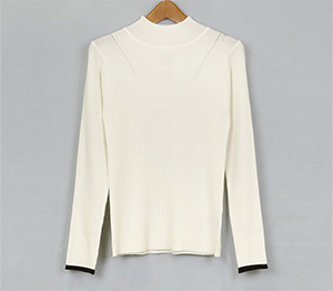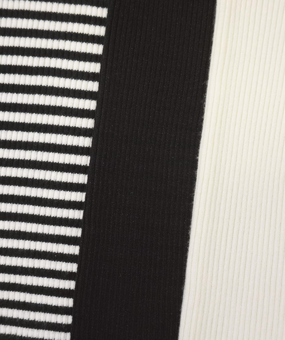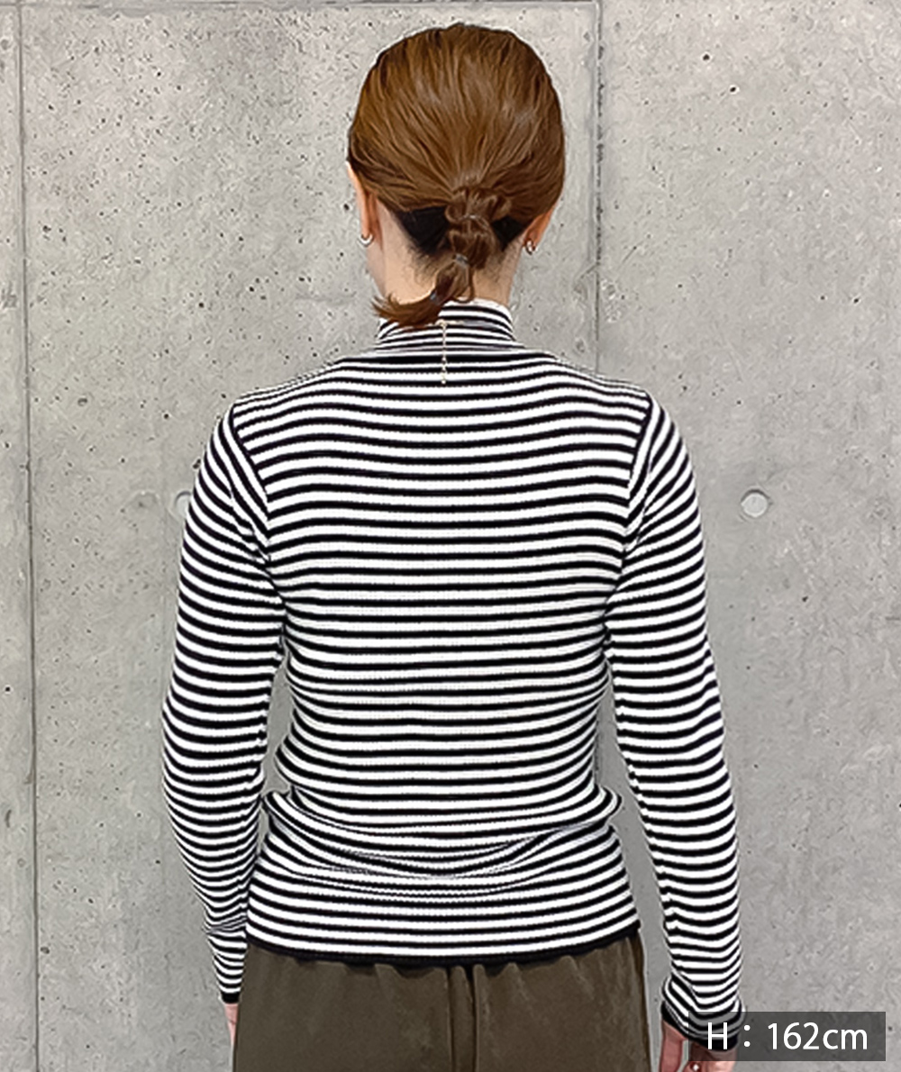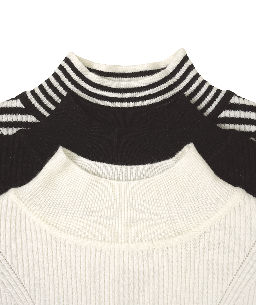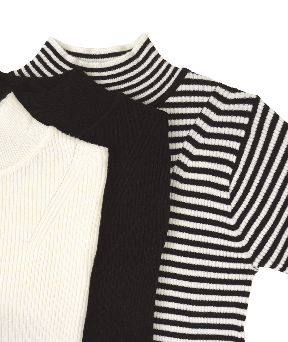 インナーにもメインアイテムにもなるハイネックのリブニット。袖口が配色でさりげなくラメが入っています。(ブラックはオールラメになります)ハイネックも高すぎず、着やすいのも嬉しいポイントです。柔らかな肌ざわりでストレスなく着用できます。ベスト・ジャンスカのインナーや、1枚着としても着用でき、着回しのきくアイテムです。