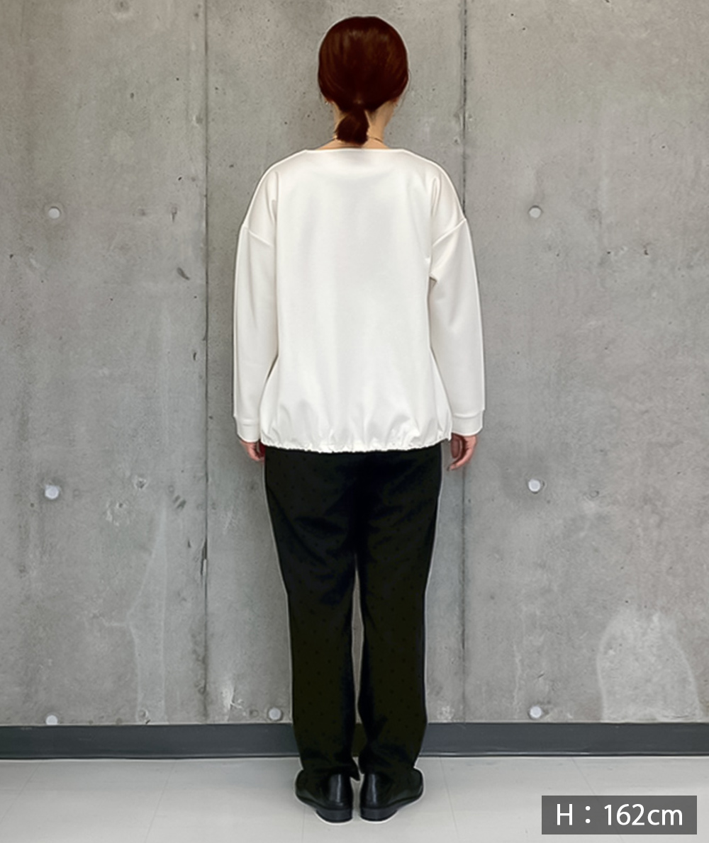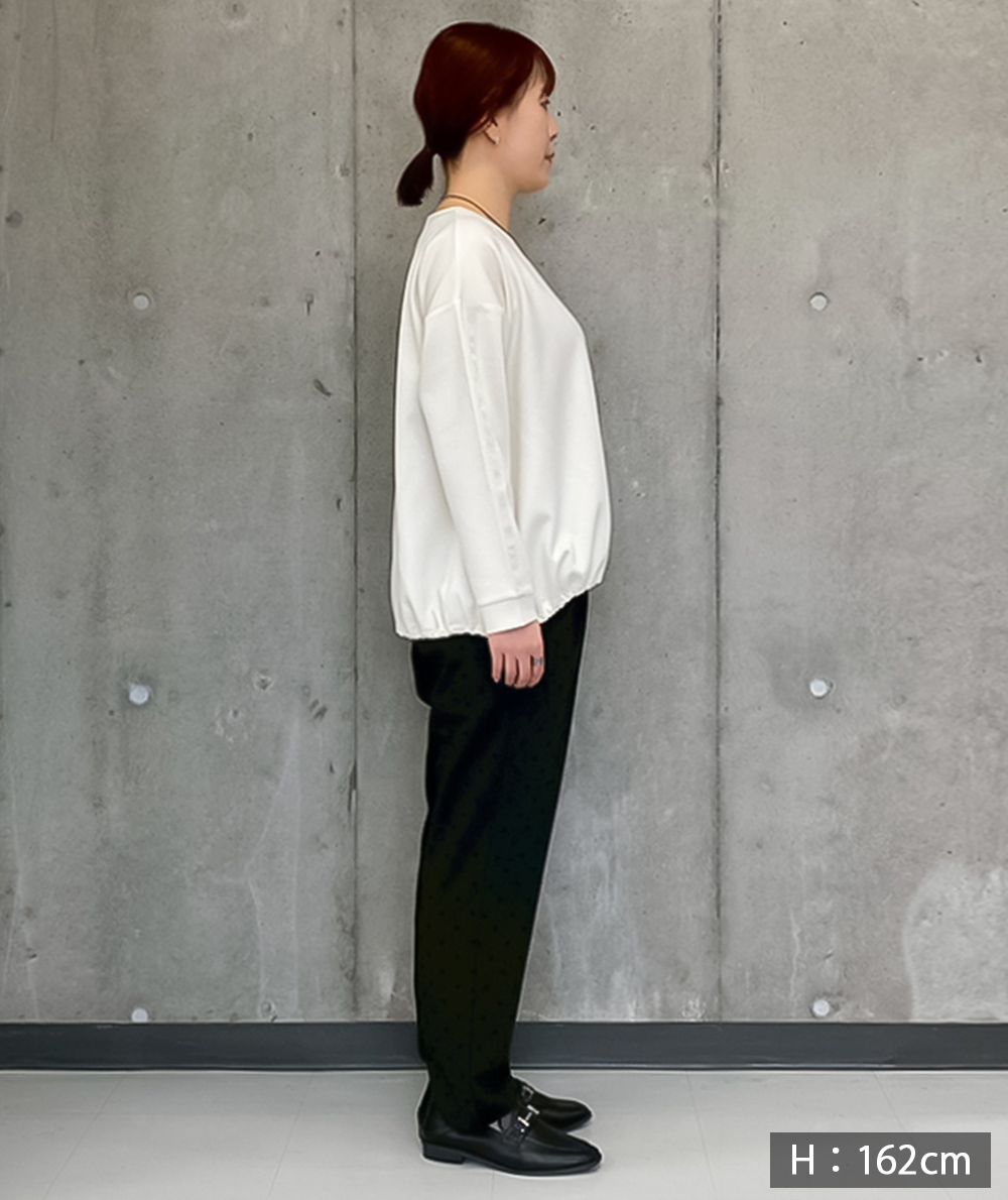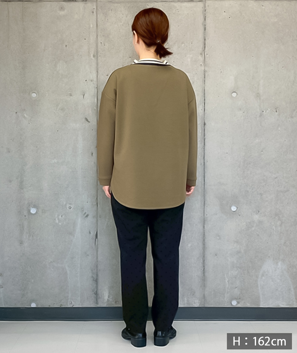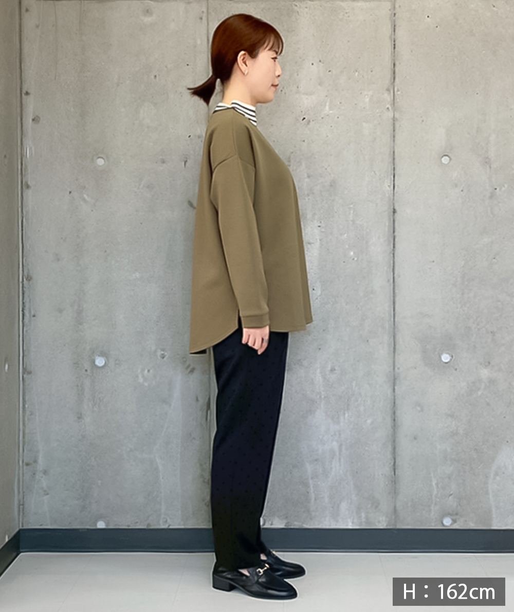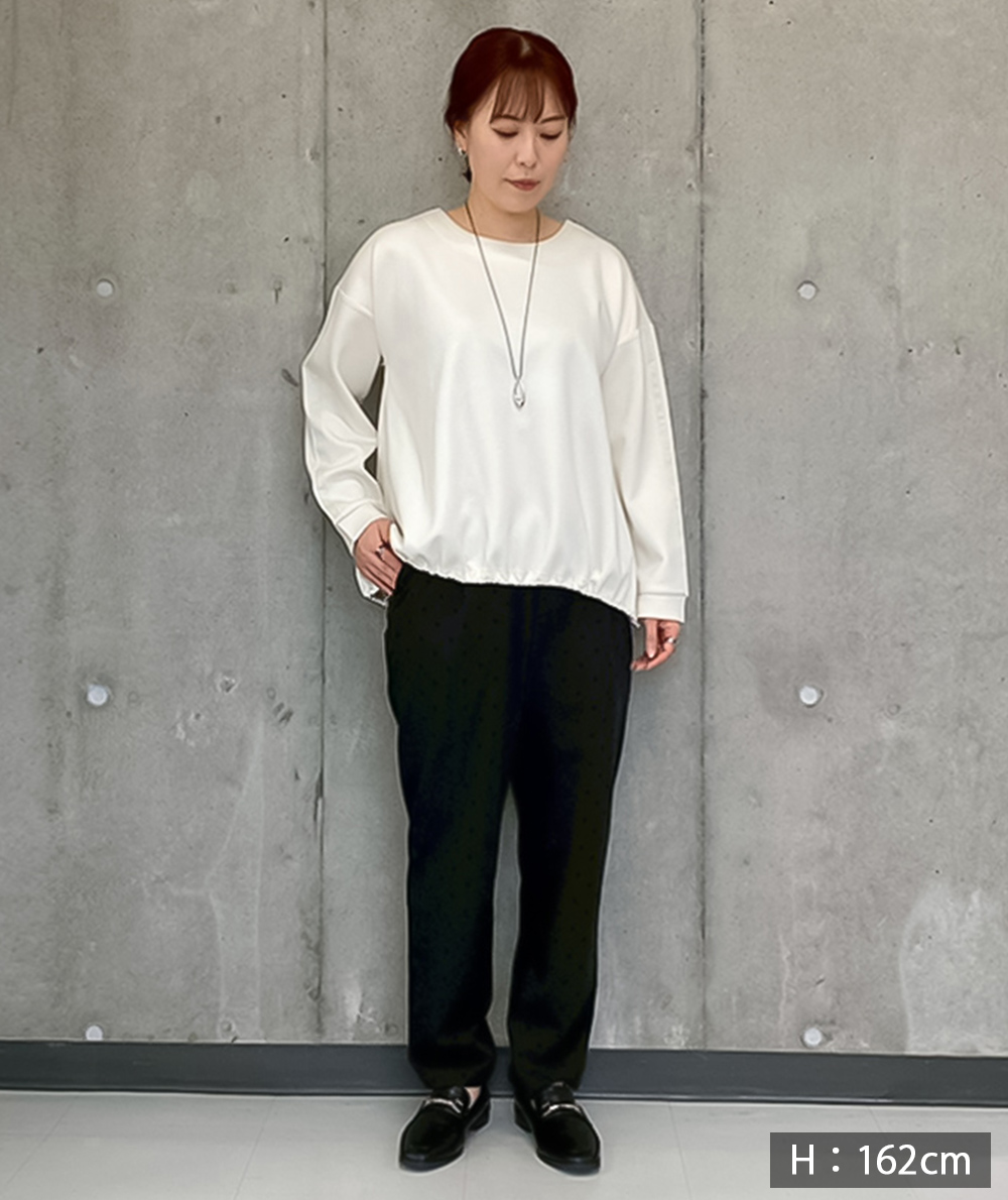 コーディネートに華を添える万能なドット柄のテーパードパンツ。大きさや間隔にこだわった立体感のあるフロッキードットを、秋冬らしいTR生地(ポリエステルとレーヨンを合わせた素材)にのせています。ウエストは脇前から後ろにかけてゴム仕様で楽なはき心地。カジュアルにもきれいめにも合わせやすい1本です。
