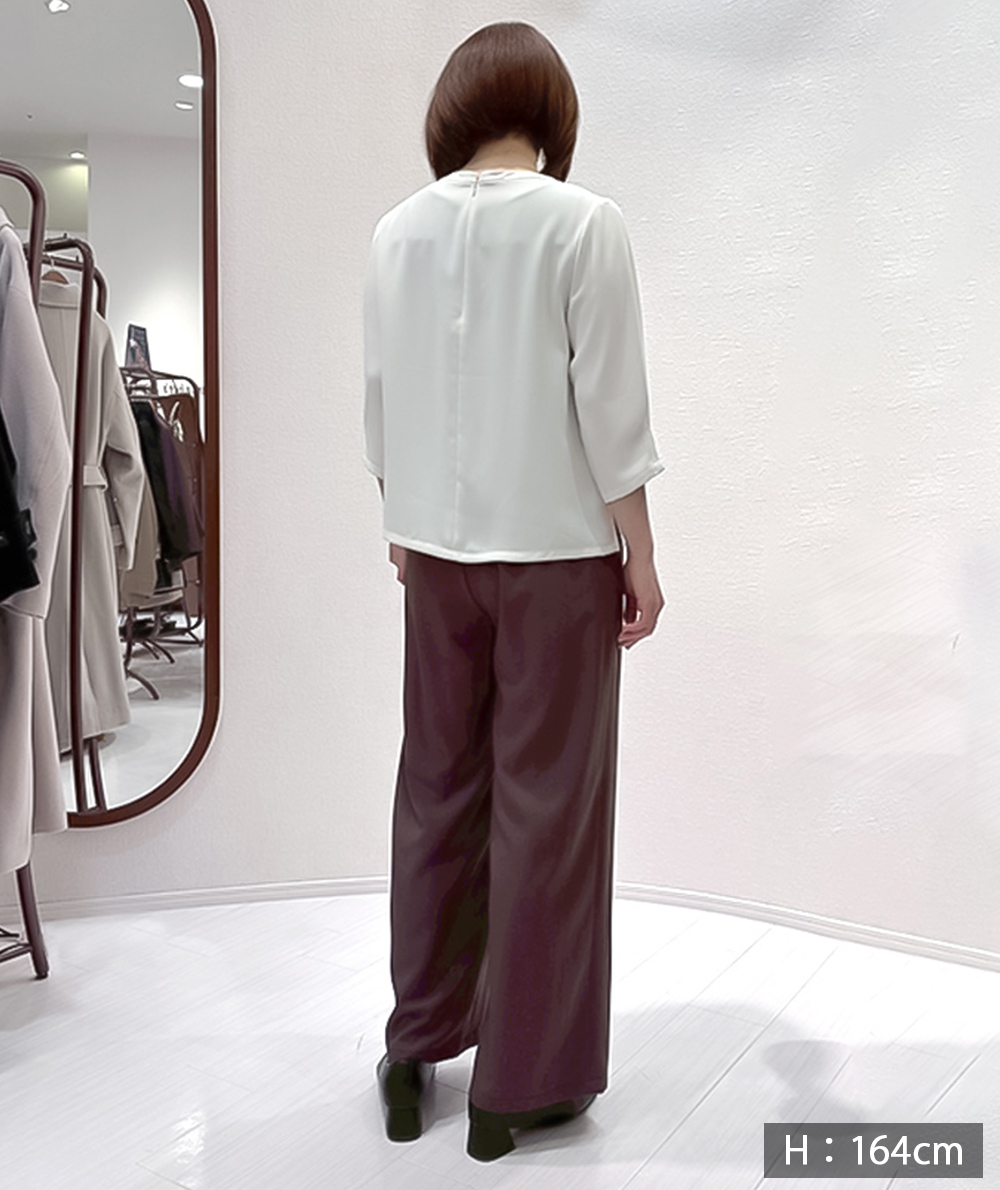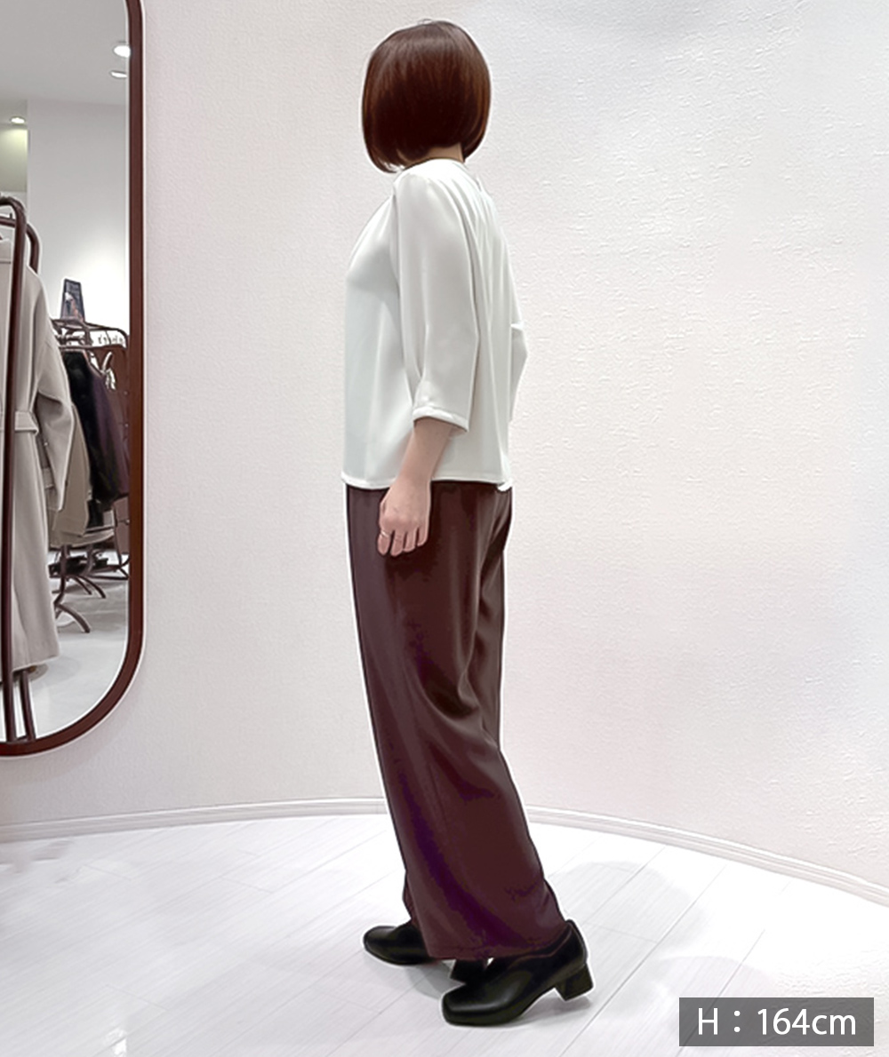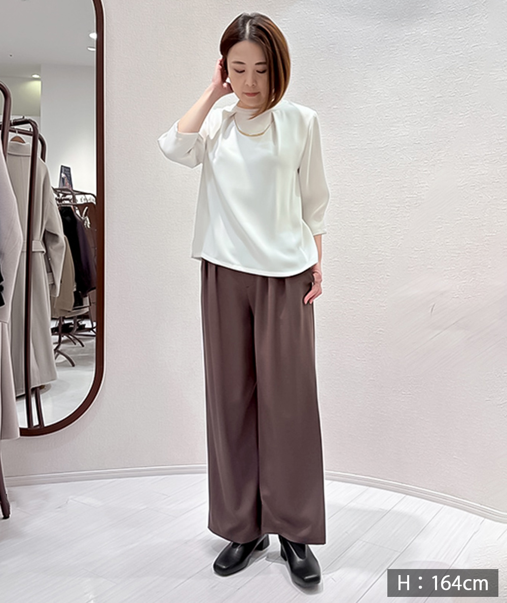 フロントに施したツータックがすとんと落ちるきれいなシルエットを演出してくれるワイドパンツ。ゆったりと脚のラインを拾わないシルエット。ウエストは脇前から後にかけてゴム仕様ではき心地抜群です。ブラウン・ブラックは同素材の脇ベルトVネックジャケット(商品番号:022515062)とセットアップでの着用も可能です。