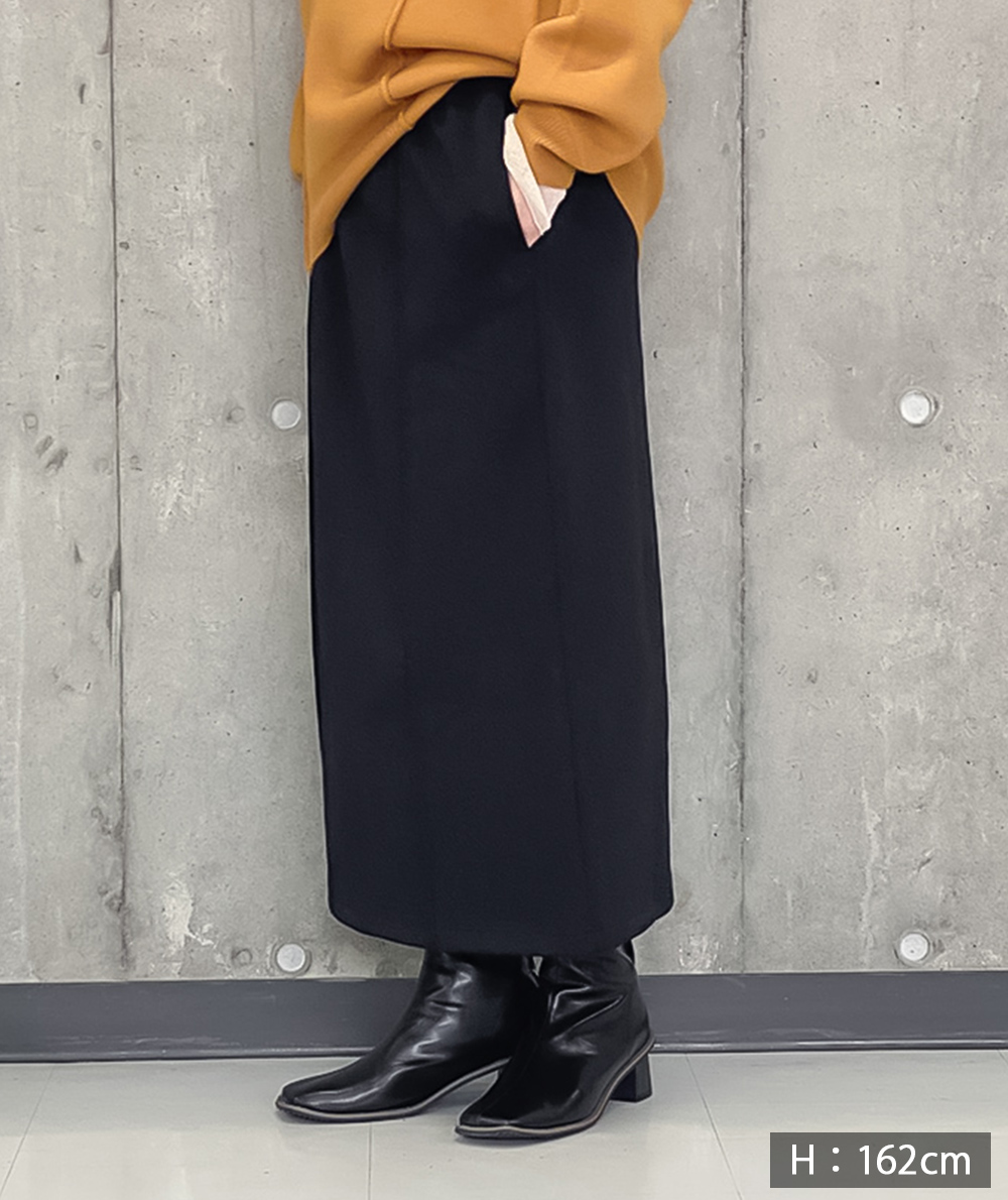 オンオフ兼用に重宝するシンプルなデザイのIラインスカートはタイトすぎないフィット感が、上品さの中にほどよいラフさを演出してくれます。ウエストはゴム仕様でイージーな着心地ながら、内紐がついているのでお好みのサイズ感に調整可能なのも嬉しいポイントです。程よい厚みと伸縮性のある素材ではき心地も抜群です。