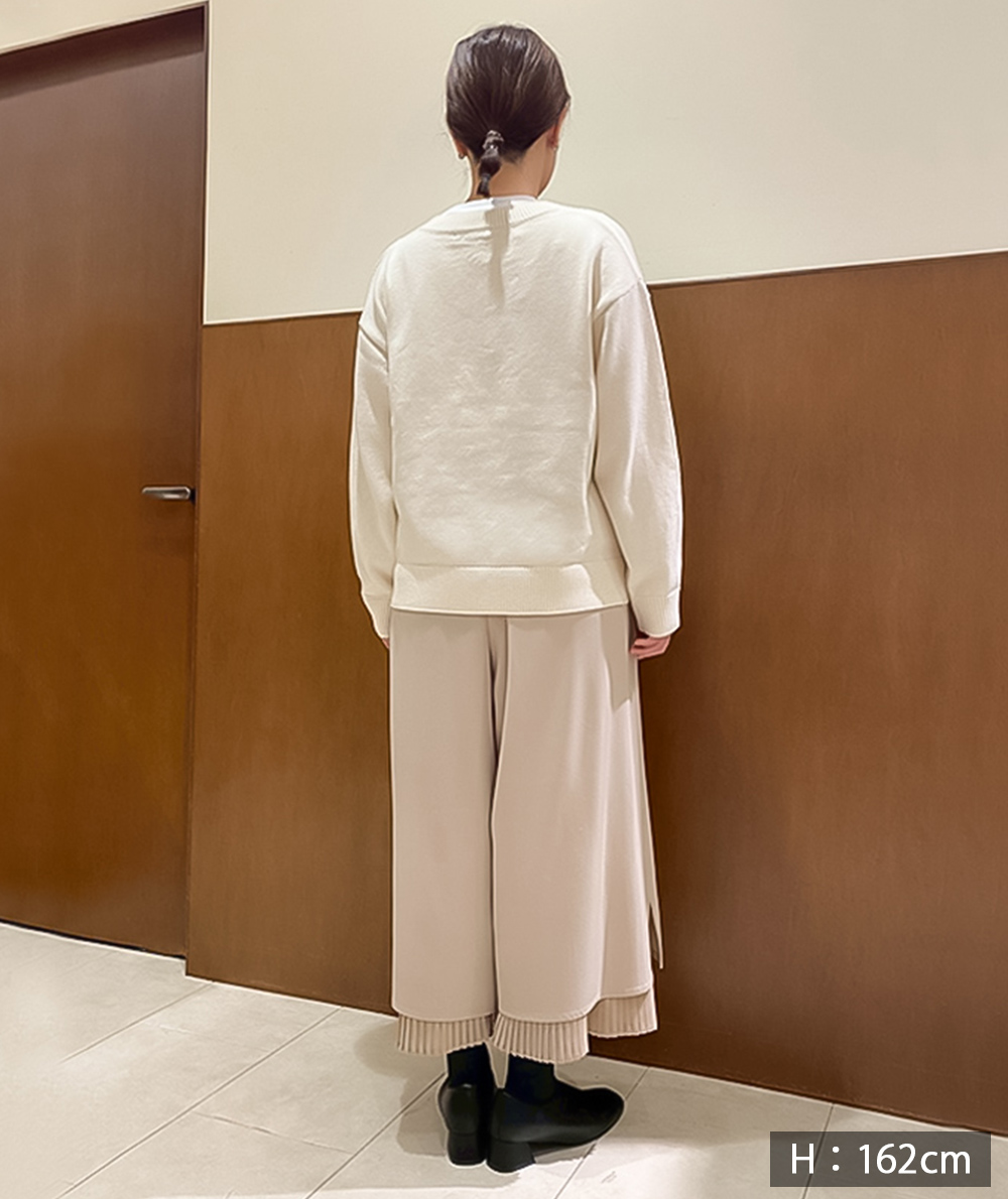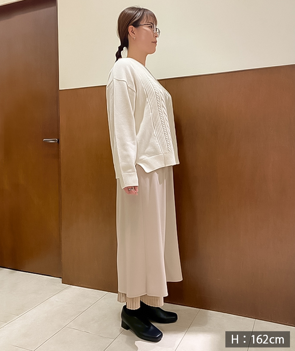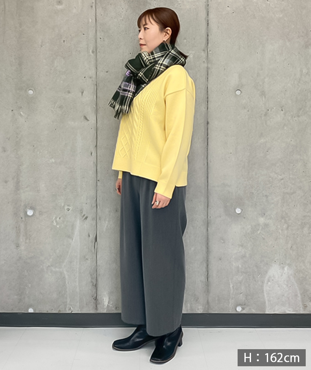 ケーブル柄が着映えするニットをご用意しました。軽くて程よくもちっとしたタッチが魅力。程よい厚みで寒い時期に着るのにぴったり。スカートにもパンツにも合うバランスのよい着丈で合わせやすいです。