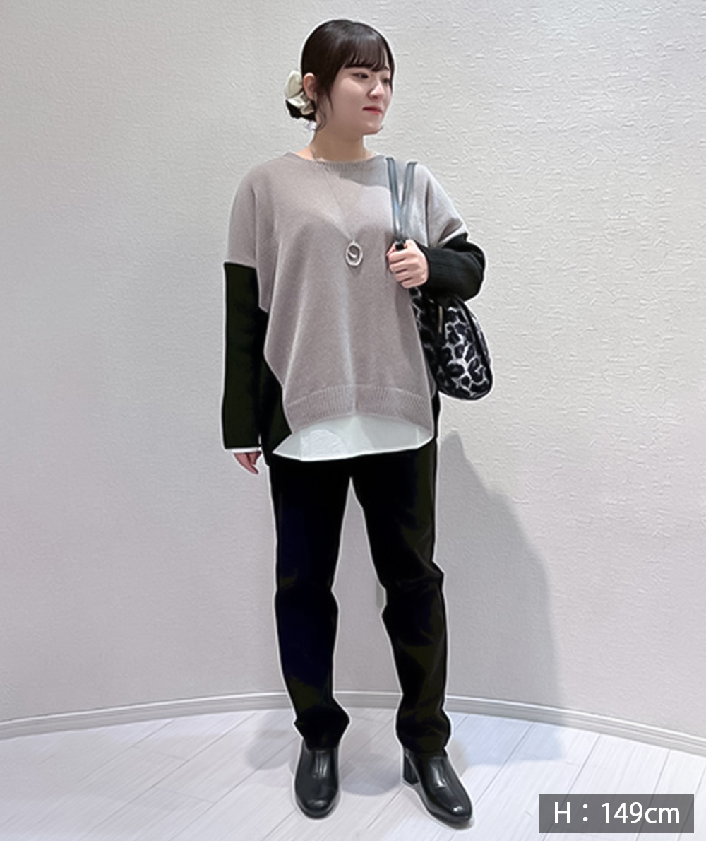 前身頃に暖かみのあるモール素材を使用し、配色デザインにしたニット。身幅はゆったりシルエットで後ろ丈が長く、さりげなく腰回りをカバーしてくれます。厚すぎないので着ぶくれせず気軽に着用できます。