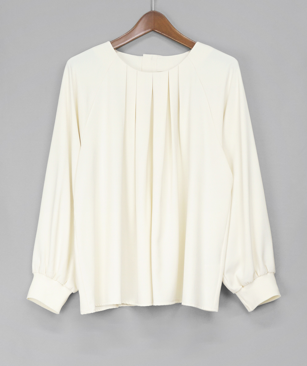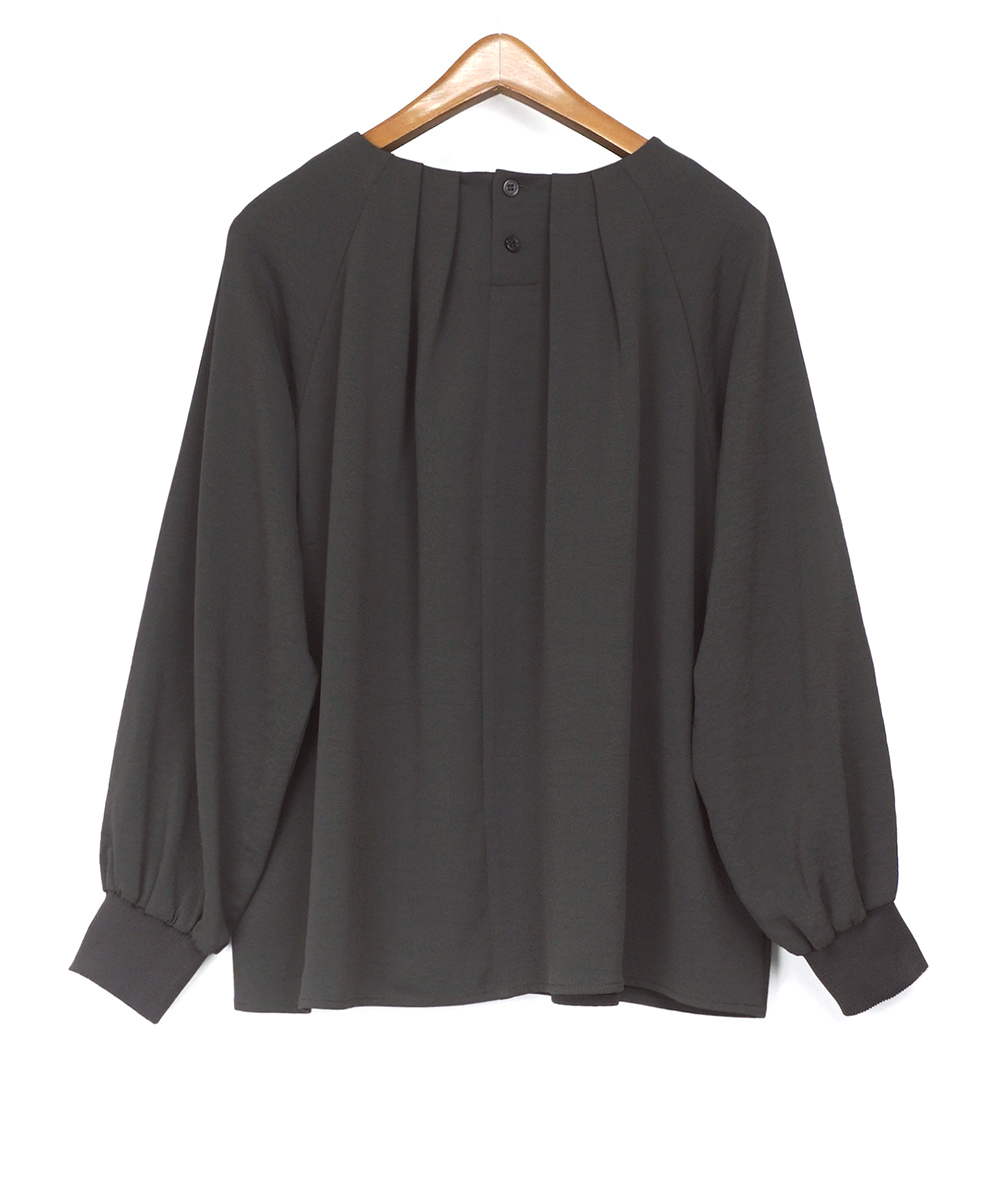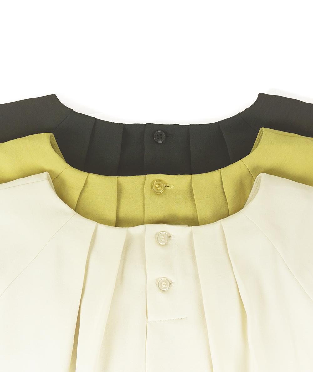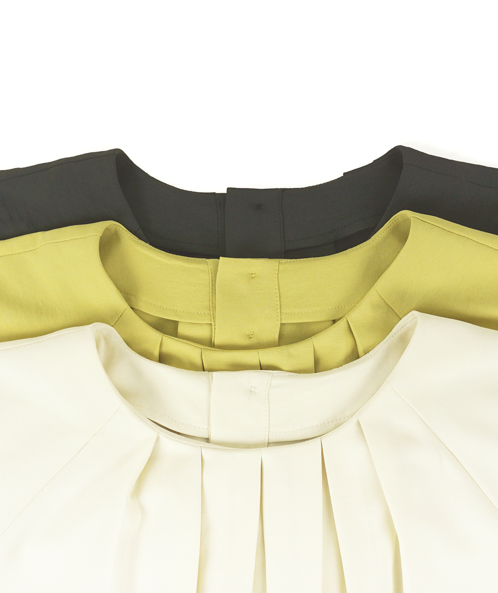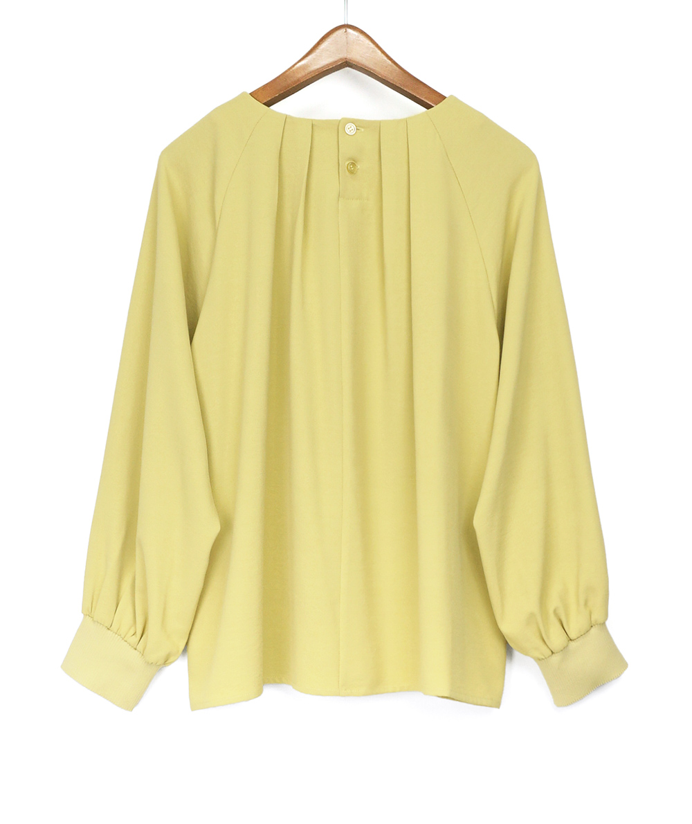 ヴィンテージポリ素材の表情のある生地を使用したブラウスは、オリジナルカラーの展開。衿はふんだんにタックをとり、華やかな印象ながらも身体のラインをひろわないシルエット。袖口はリブを編み立てているので、たくし上げてボリューム袖にする事も可能です。肩回りがゆったりしているラグランスリーブで着心地が良いところと、カーディガンやジャケットのインにも合わせやすい柔らかい素材感も魅力です。