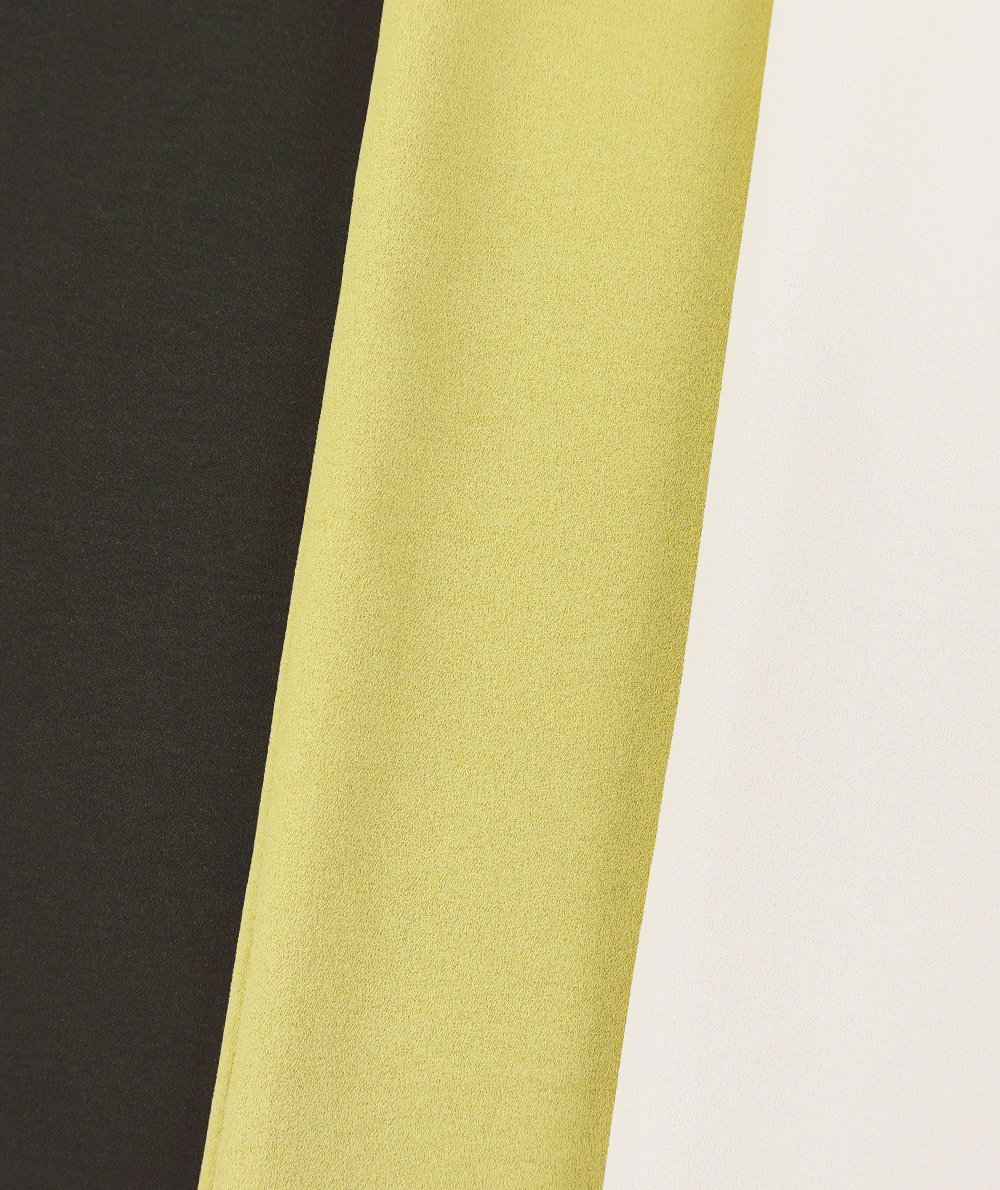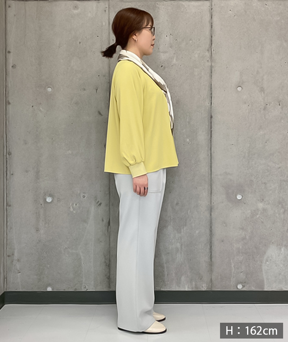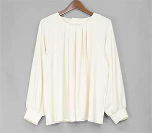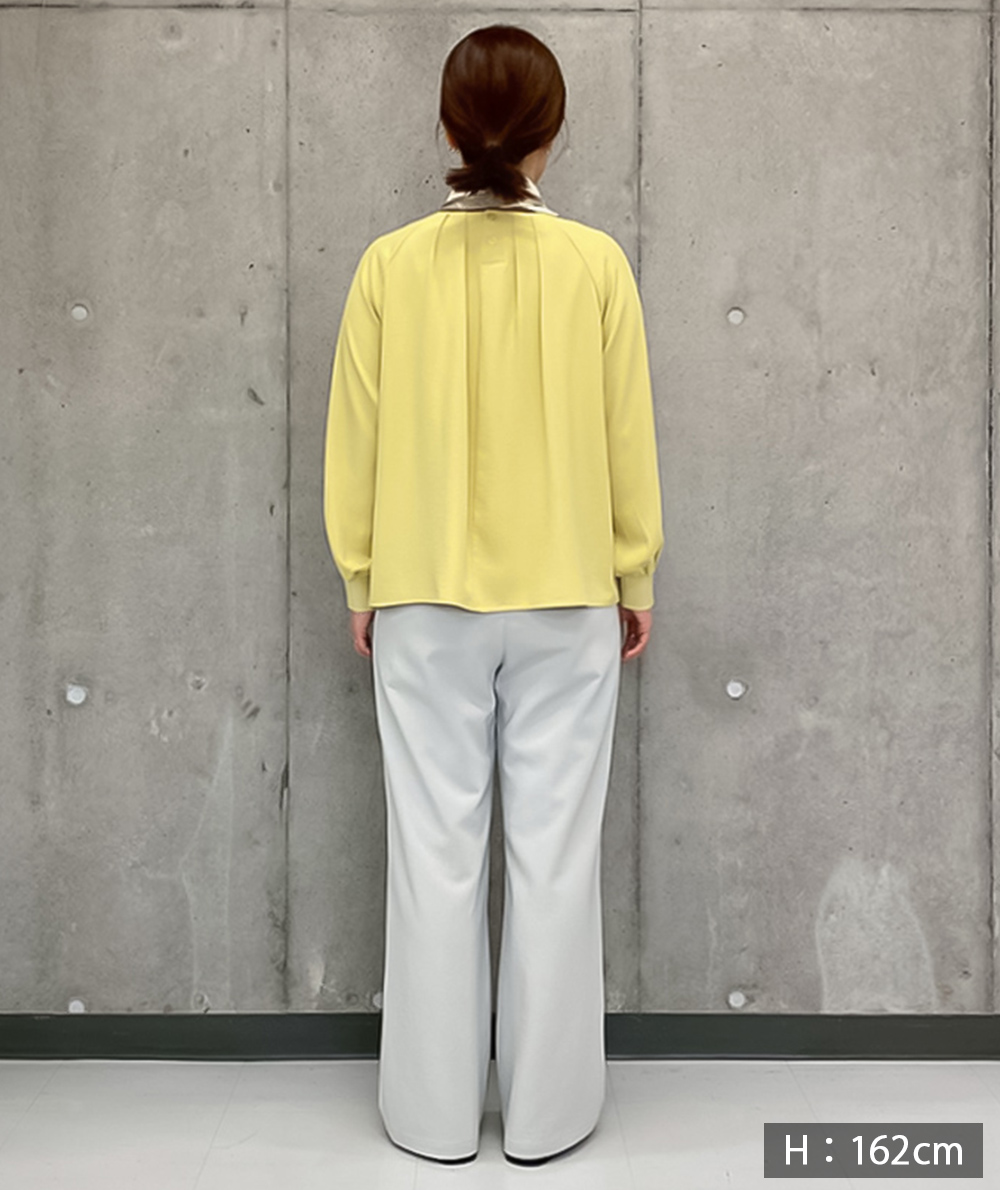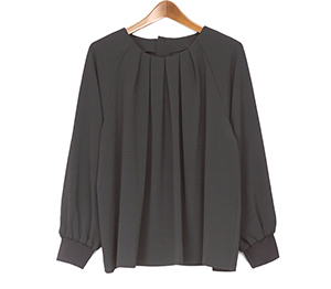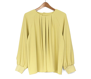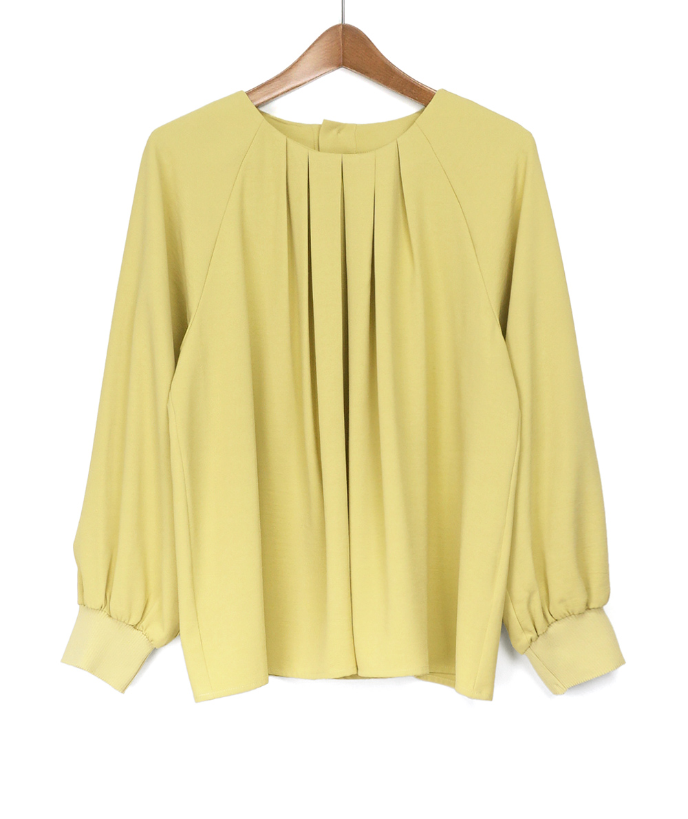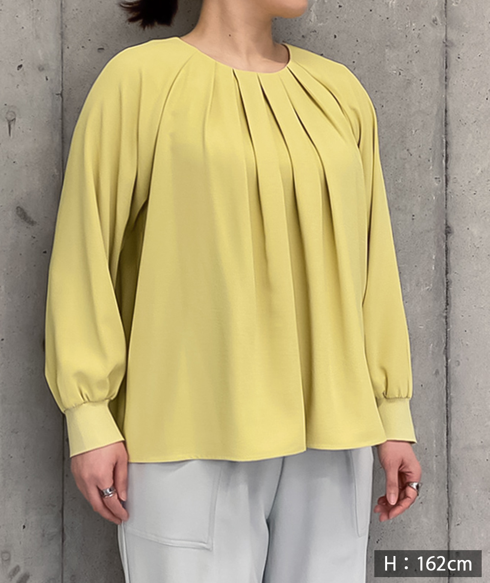 ヴィンテージポリ素材の表情のある生地を使用したブラウスは、オリジナルカラーの展開。衿はふんだんにタックをとり、華やかな印象ながらも身体のラインをひろわないシルエット。袖口はリブを編み立てているので、たくし上げてボリューム袖にする事も可能です。肩回りがゆったりしているラグランスリーブで着心地が良いところと、カーディガンやジャケットのインにも合わせやすい柔らかい素材感も魅力です。