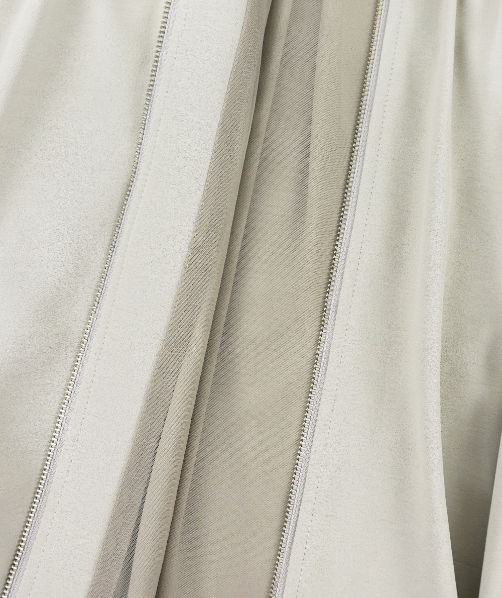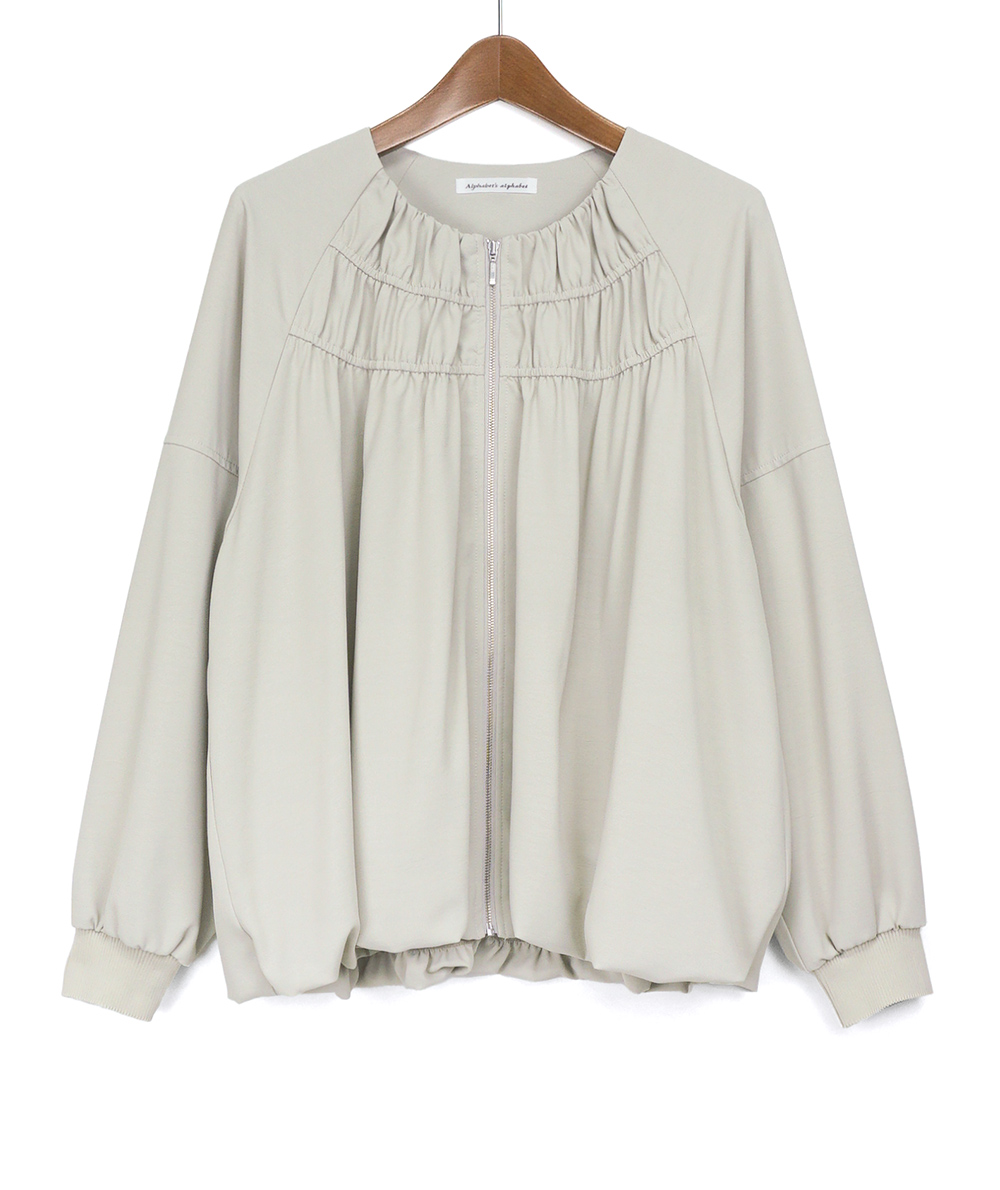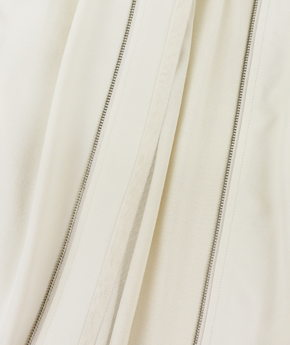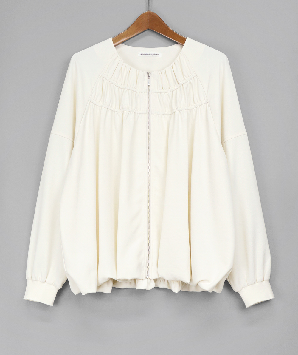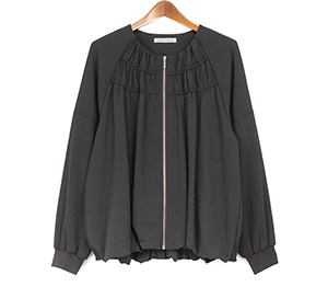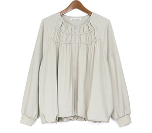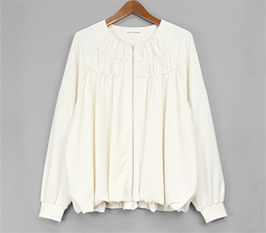 落ち感がありながら表情のある素材を使用した軽いZIPブルゾン。軽い素材なのでブラウスのような感覚で着用できます。裾はバルーンシルエットで気になる腰回りを自然にカバーしてくれます。袖口はリブ仕様でたくし上げる事もできるので長く着用していただけるところも魅力です。