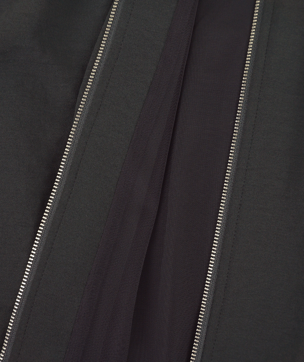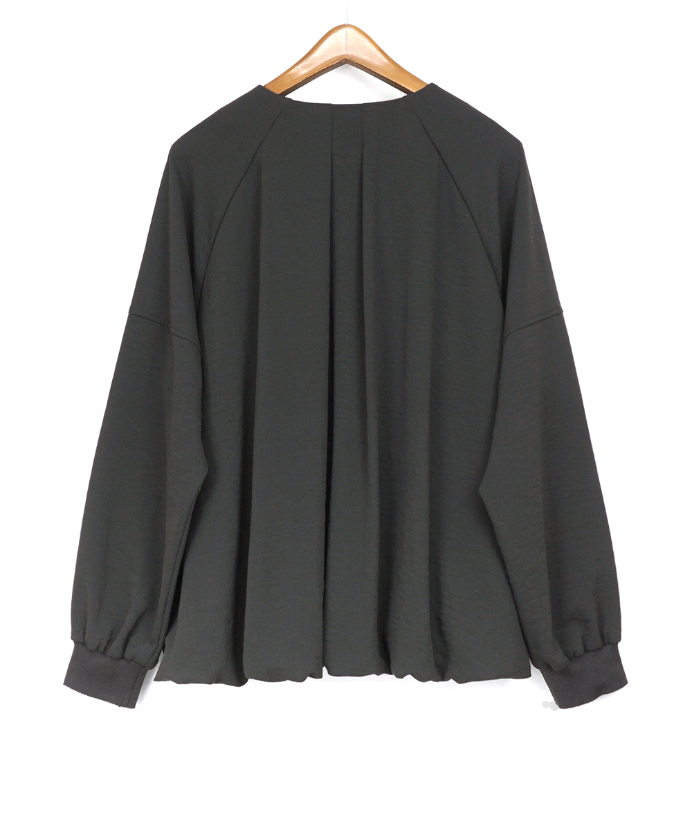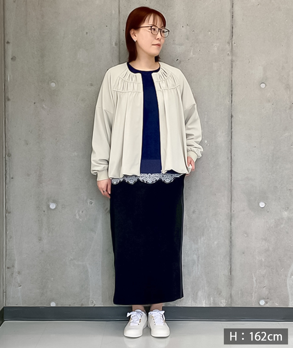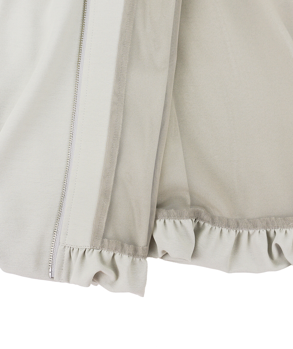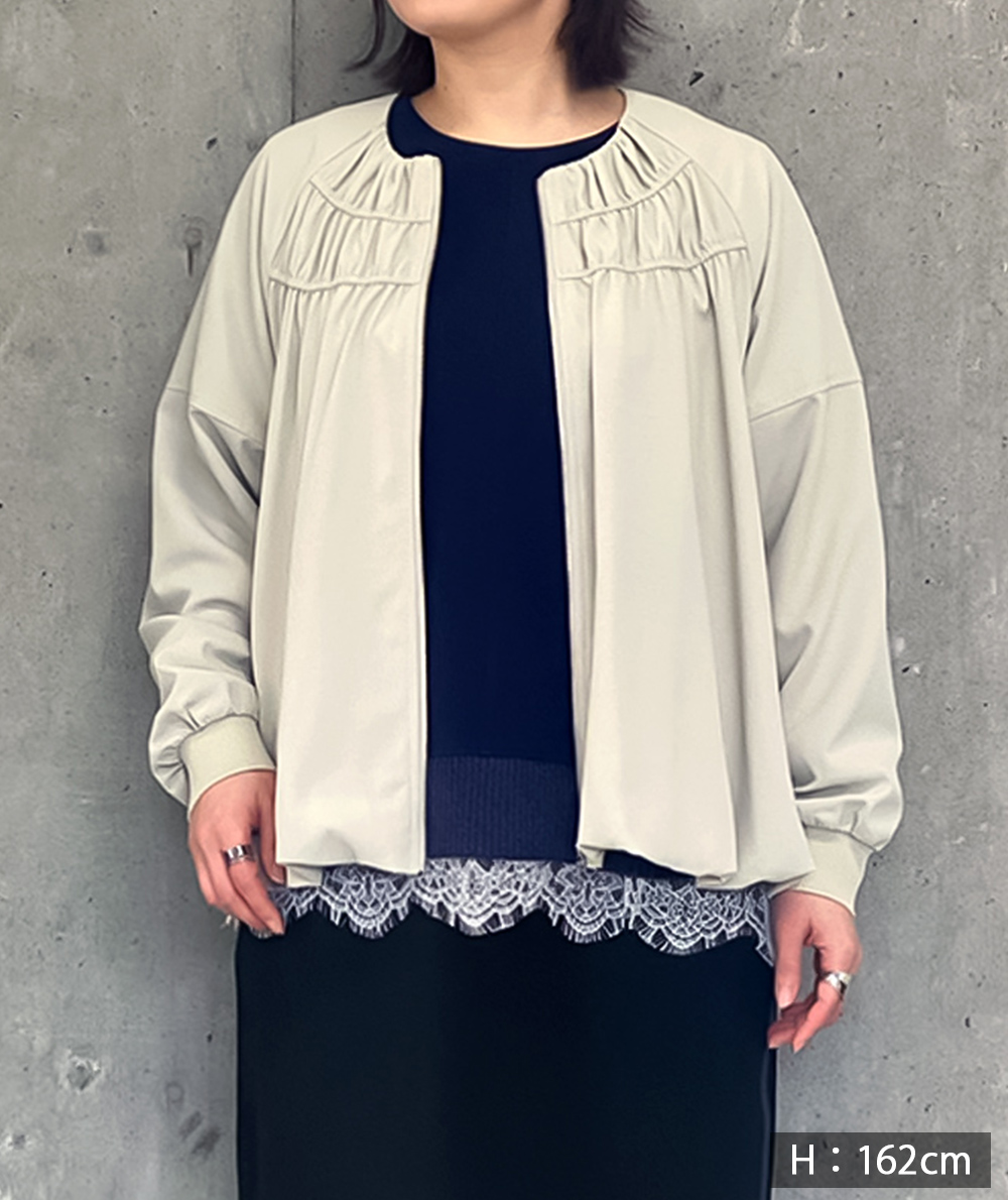 落ち感がありながら表情のある素材を使用した軽いZIPブルゾン。軽い素材なのでブラウスのような感覚で着用できます。裾はバルーンシルエットで気になる腰回りを自然にカバーしてくれます。袖口はリブ仕様でたくし上げる事もできるので長く着用していただけるところも魅力です。