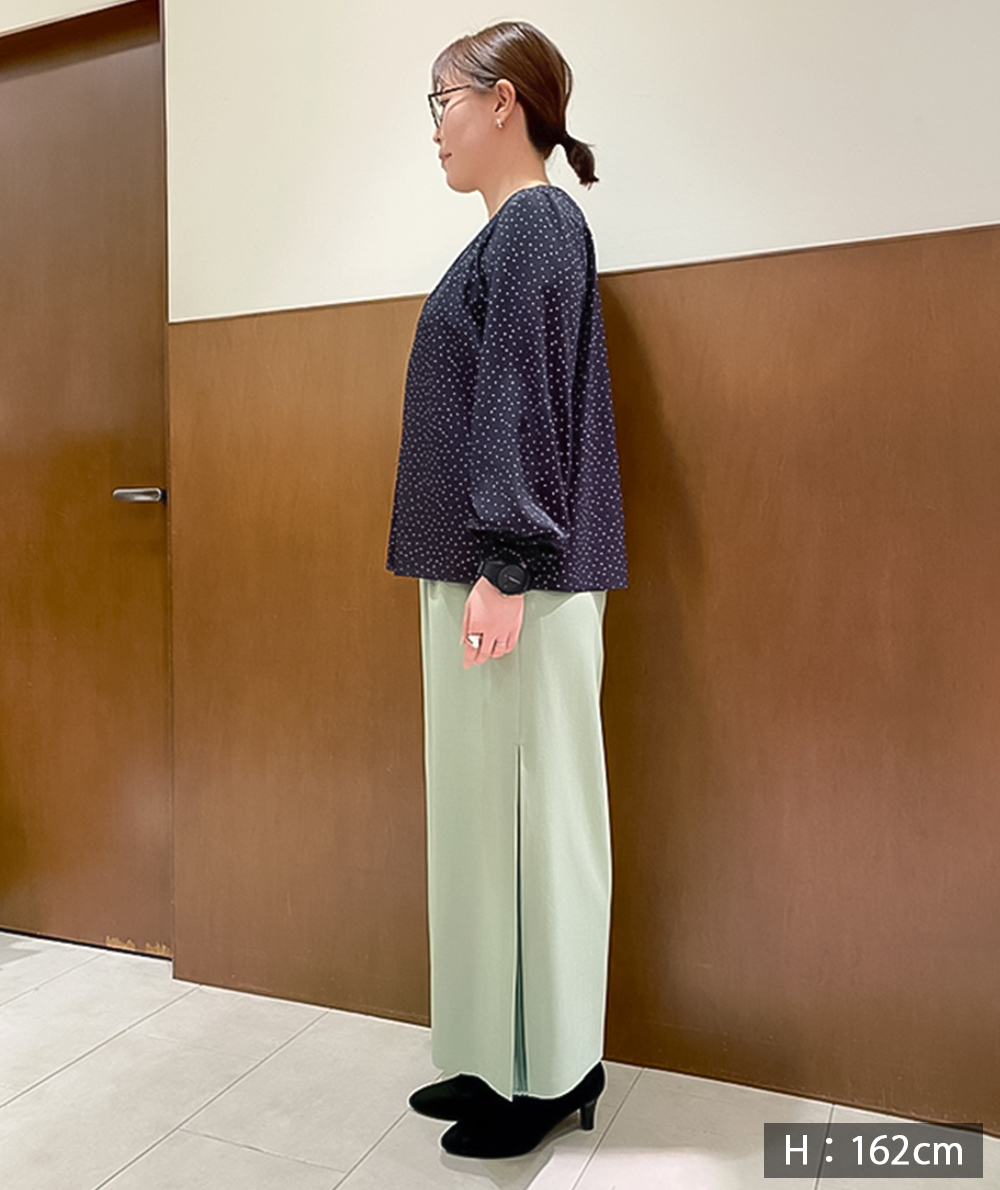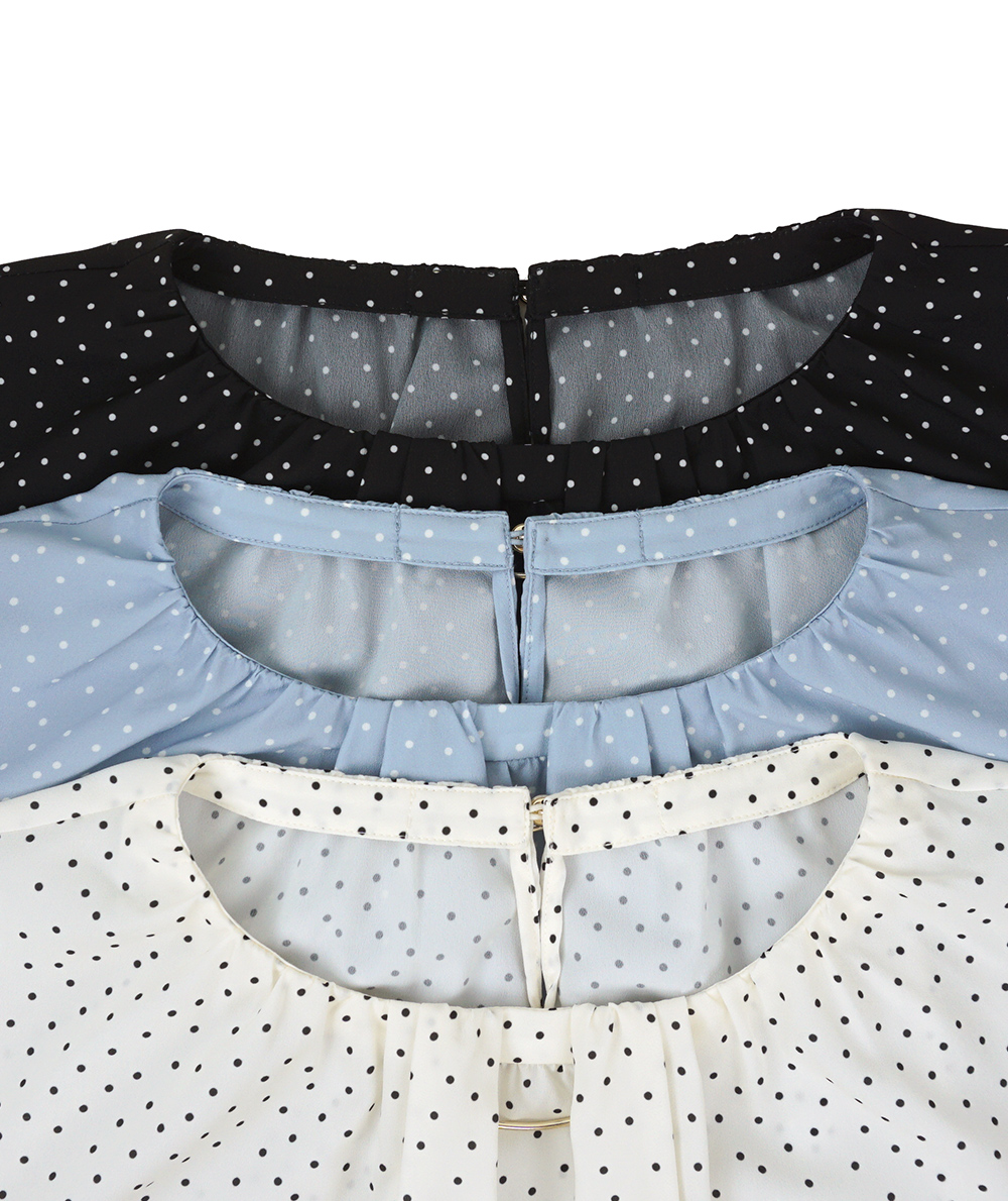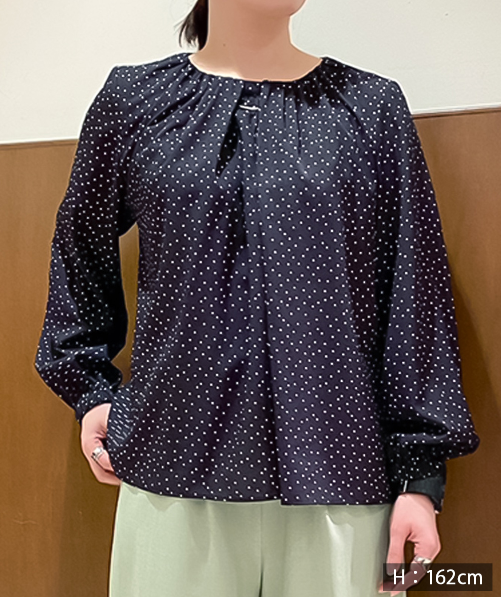 首元にアクセントを添えるメタルバーがポイントのドットプリントブラウス。メタルバーは取り外し可能でシンプルなブラウスとしても使える嬉しい2WAY仕様です。身体のラインを拾いにくいゆったりとしたシルエットで、体型カバーを叶えつつ上品な落ち感を演出してくれます。メタルバーの輝きを活かし、シンプルなスラックスやスカートを合わせた王道のオフィスコーデもおすすめ◎きれいめな素材感なので、ジャケットやカーディガンのインナーとしてもシーズンレスに活躍します。セレモニースタイルにもおすすめです。