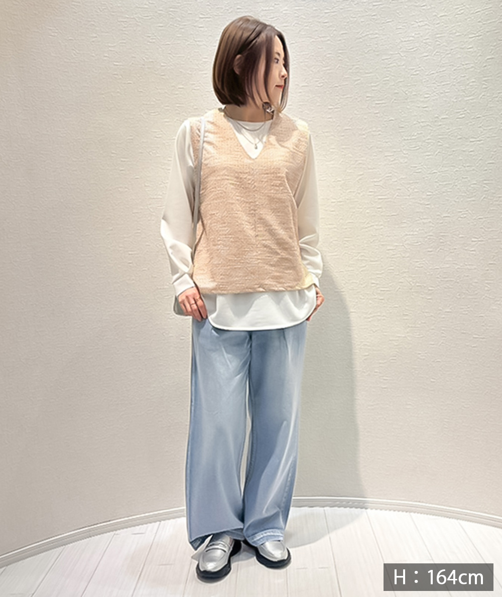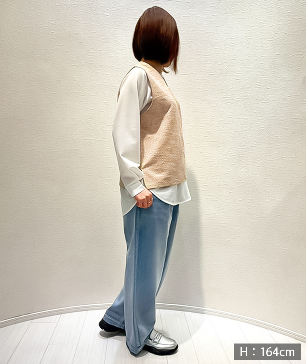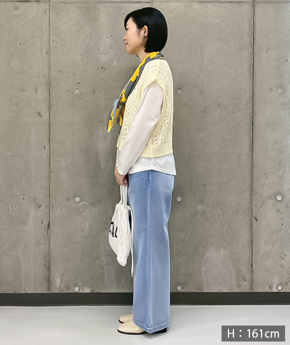 程よいワイドシルエットのイージーデニム。総ゴム+紐ウエストでリラックスしたはき心地と着脱のしやすさを両立。ヒップにゆとりを持たせ、フロントのタックが立体感を生み、足のラインを拾わない設計で自然に体型カバーが叶う一着です。ラグランデニムジャケット(商品番号:022615004)とセットアップで着用できます。