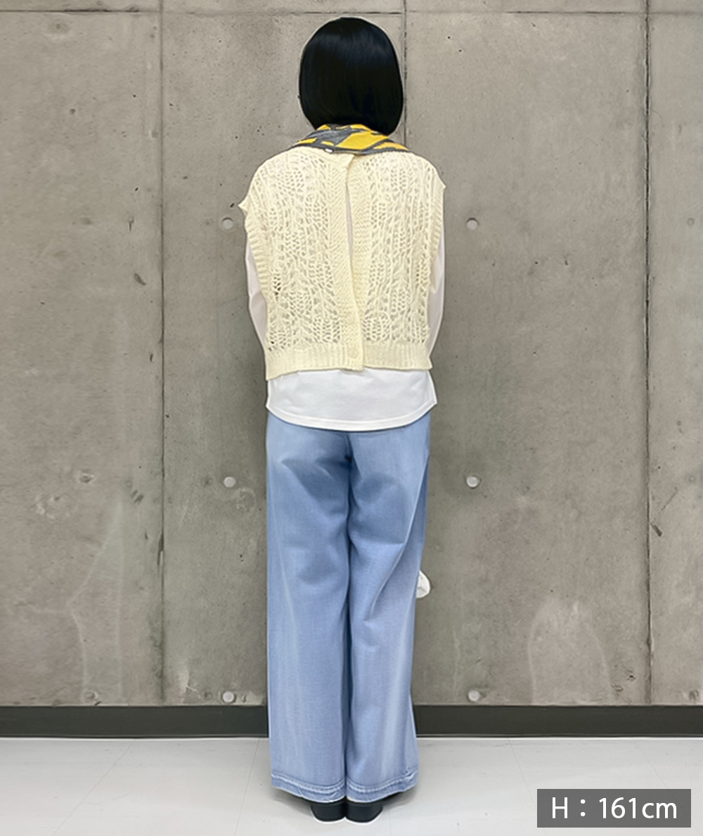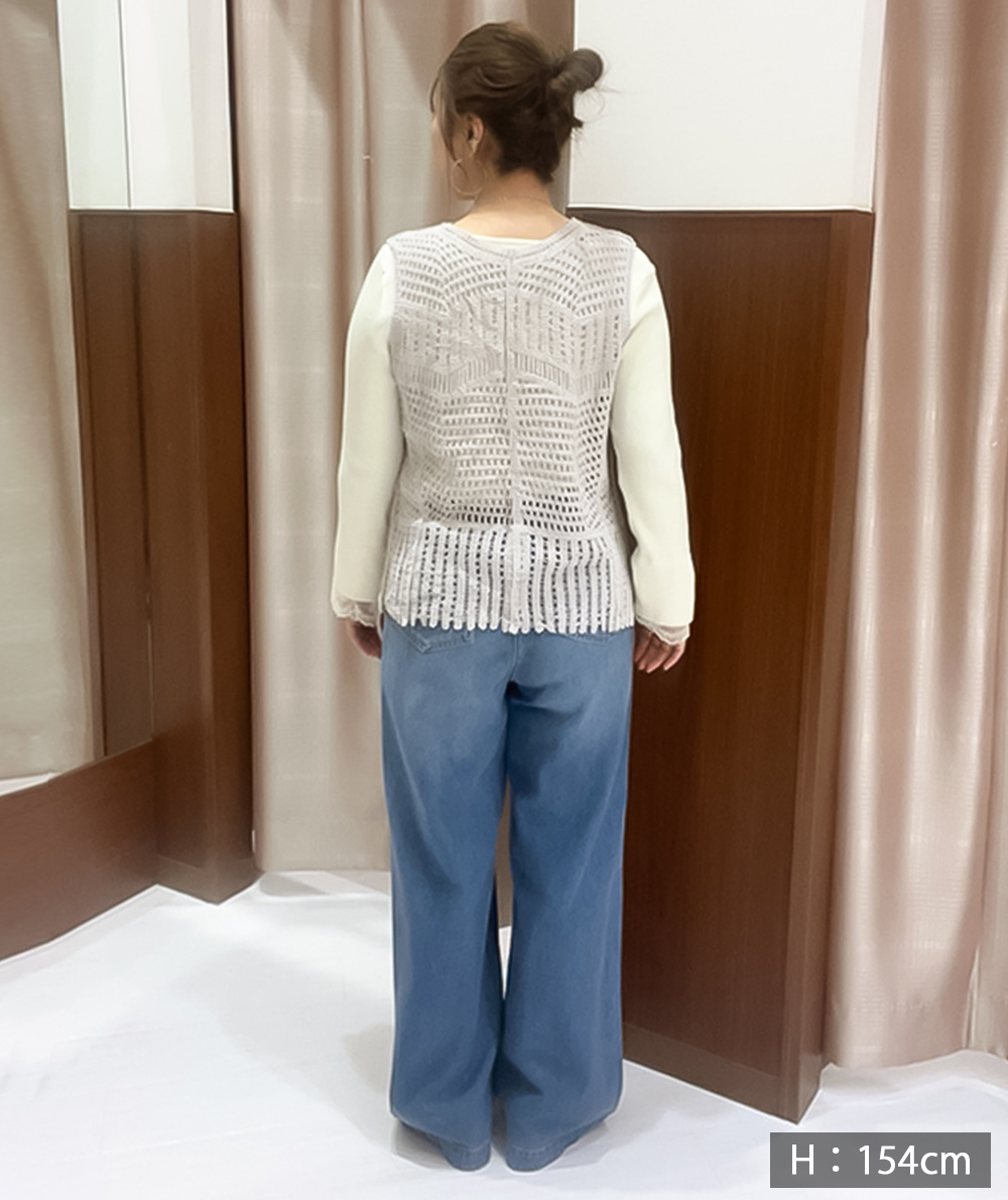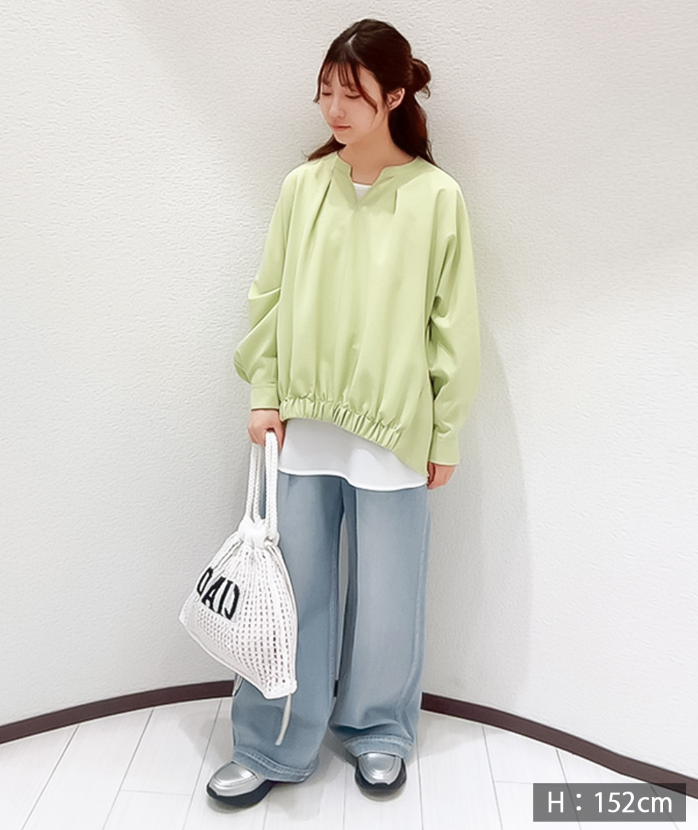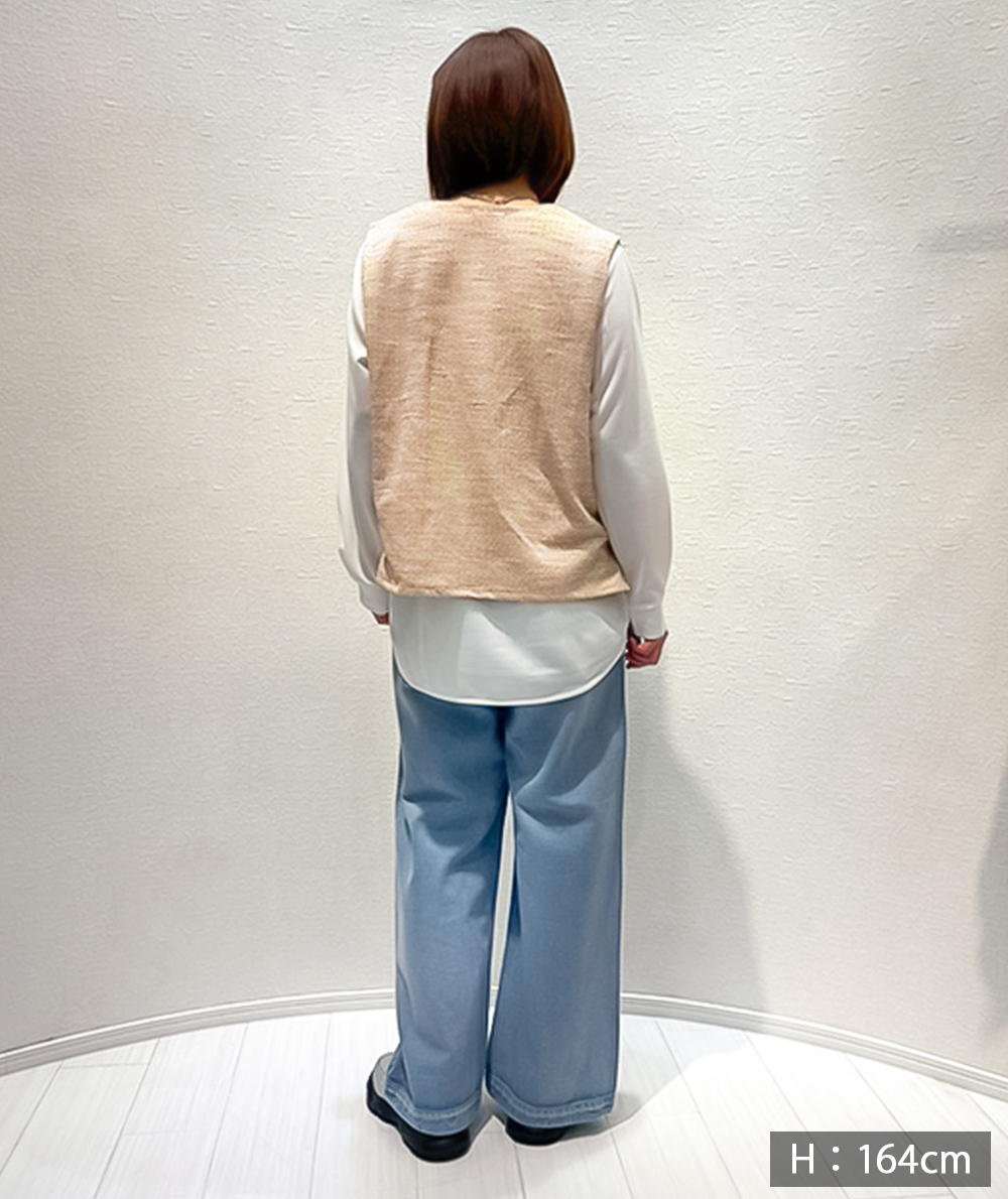 程よいワイドシルエットのイージーデニム。総ゴム+紐ウエストでリラックスしたはき心地と着脱のしやすさを両立。ヒップにゆとりを持たせ、フロントのタックが立体感を生み、足のラインを拾わない設計で自然に体型カバーが叶う一着です。ラグランデニムジャケット(商品番号:022615004)とセットアップで着用できます。