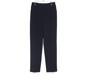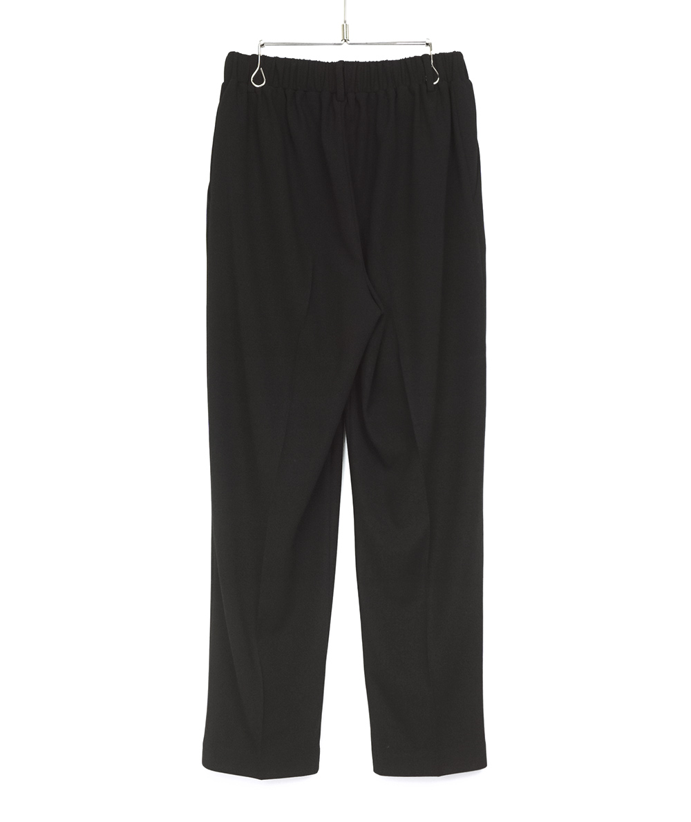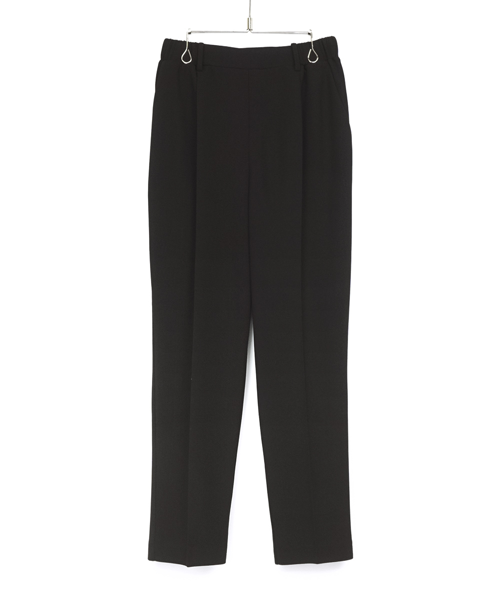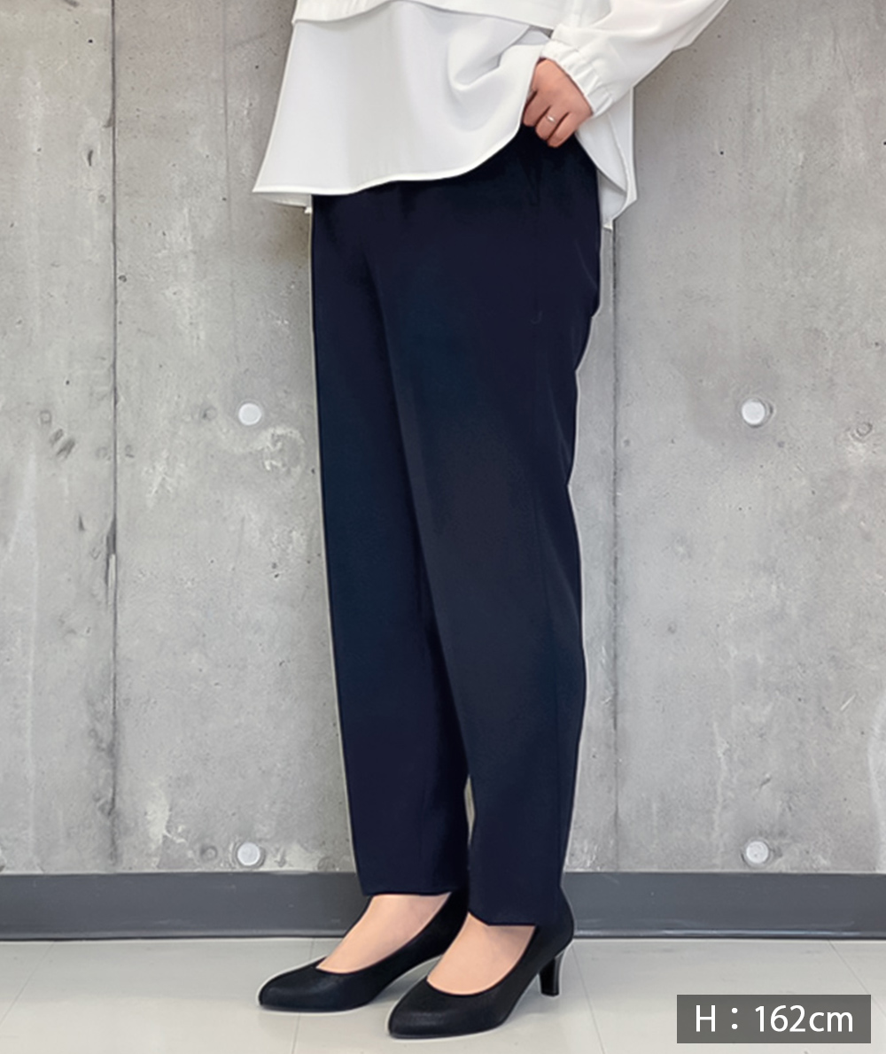 スッキリとしたシルエットとセンタープレスが上品な印象のテーパードパンツ。ストレッチの効いた生地とゴム仕立てのウエストにより、リラックスしたはき心地でデイリーユースもしやすい一着です。腰回りにゆとりを持たせつつ、膝下を細く設定することで細見えを叶え、スタイルアップ効果も。チュニックやボリュームのあるトップスとも好相性で、オンオフ問わず活躍します。お仕事着としてはもちろん、セレモニーシーンやお子様とのお出かけにもおすすめです。
