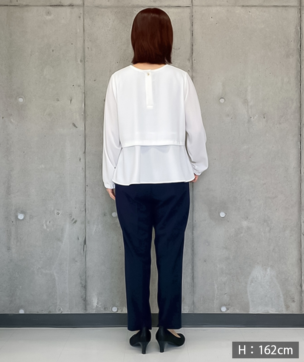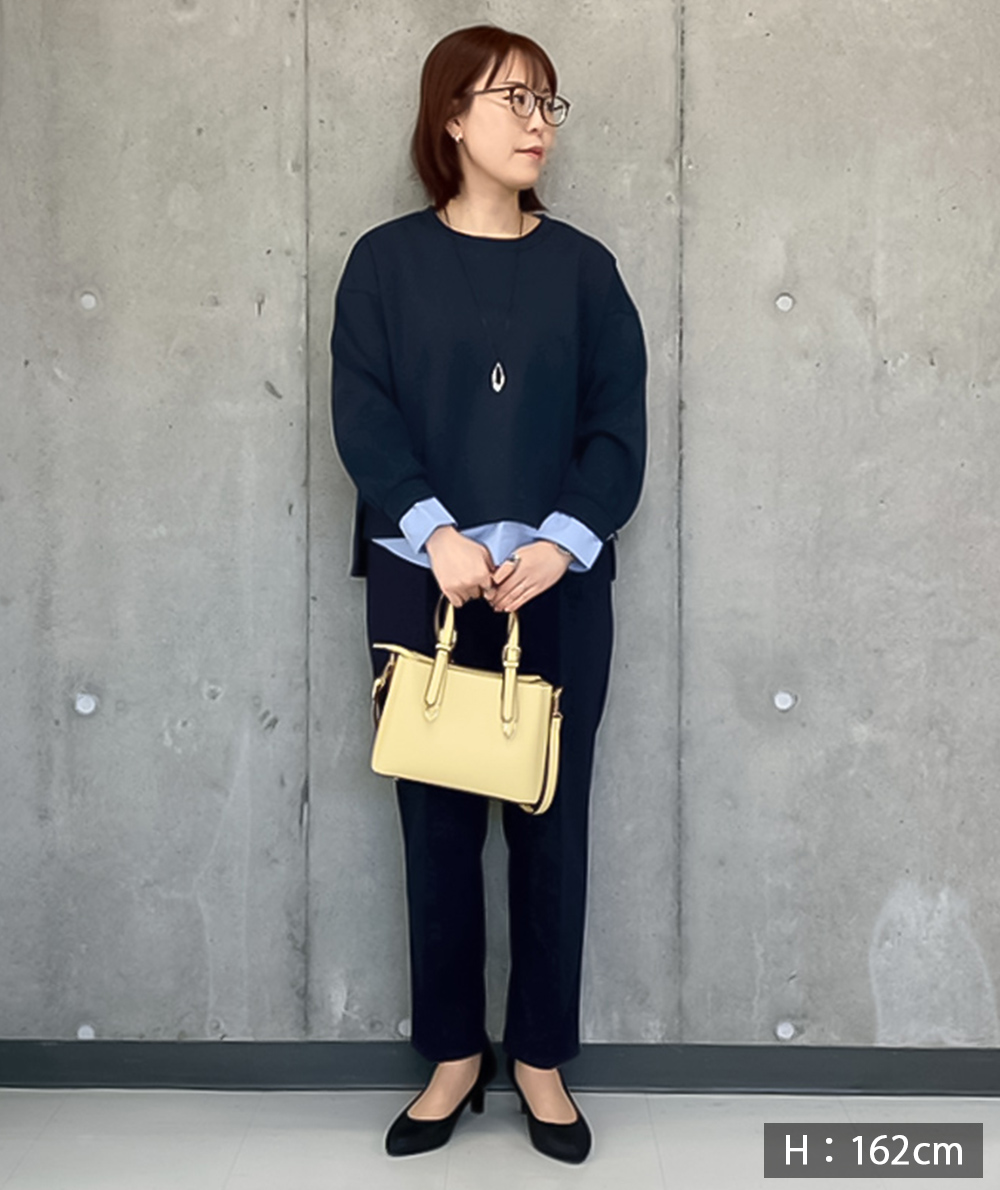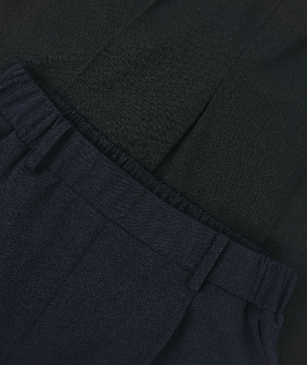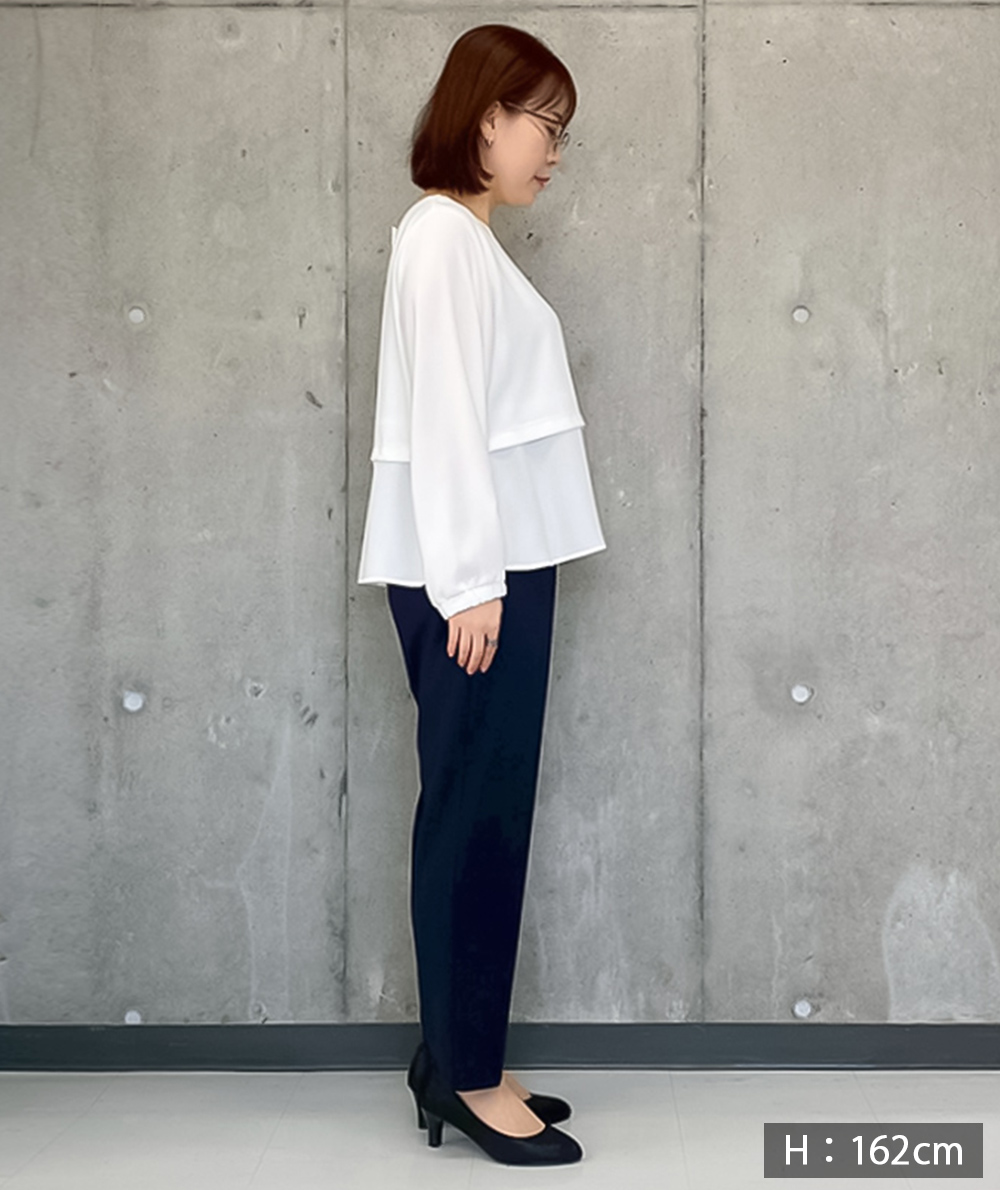 スッキリとしたシルエットとセンタープレスが上品な印象のテーパードパンツ。ストレッチの効いた生地とゴム仕立てのウエストにより、リラックスしたはき心地でデイリーユースもしやすい一着です。腰回りにゆとりを持たせつつ、膝下を細く設定することで細見えを叶え、スタイルアップ効果も。チュニックやボリュームのあるトップスとも好相性で、オンオフ問わず活躍します。お仕事着としてはもちろん、セレモニーシーンやお子様とのお出かけにもおすすめです。