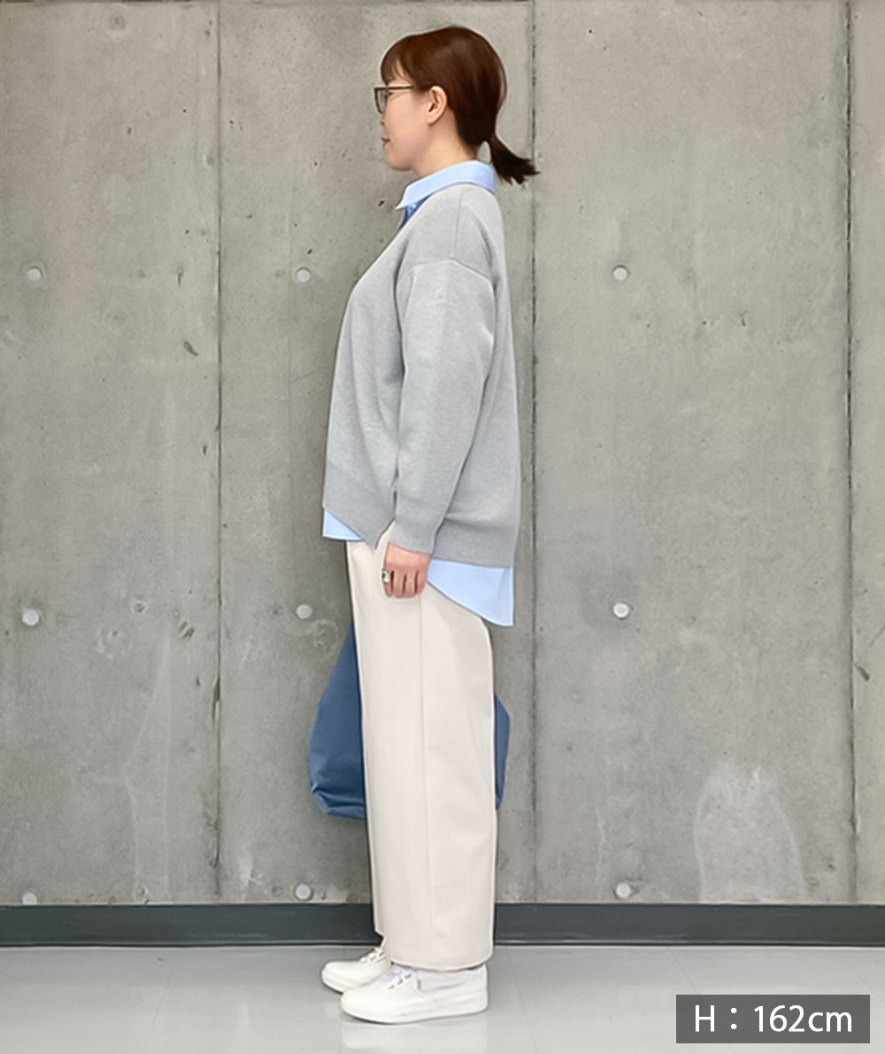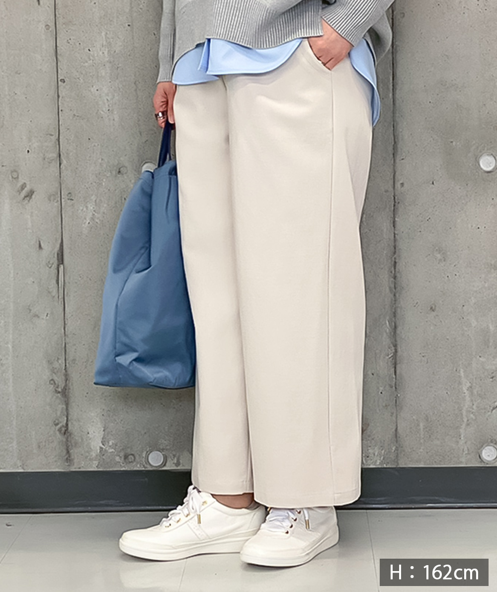足首位の丈感で小柄さんにもおすすめなワイドパンツ。シルエットは広がりすぎないセミワイド。配色で切り替えたウエストのデザインがポイントでスタイリングにトレンド感をプラスしてくれます。