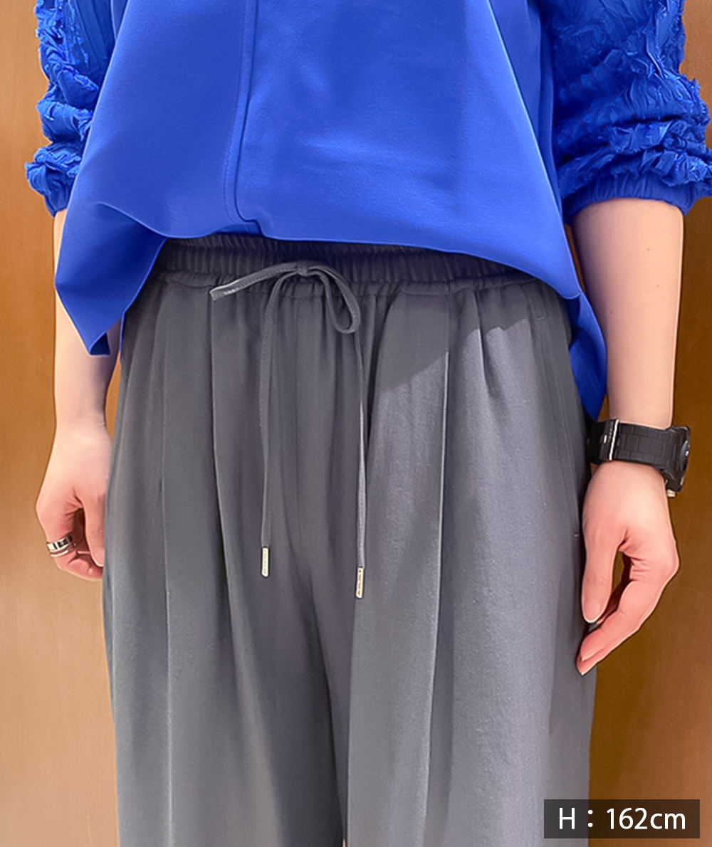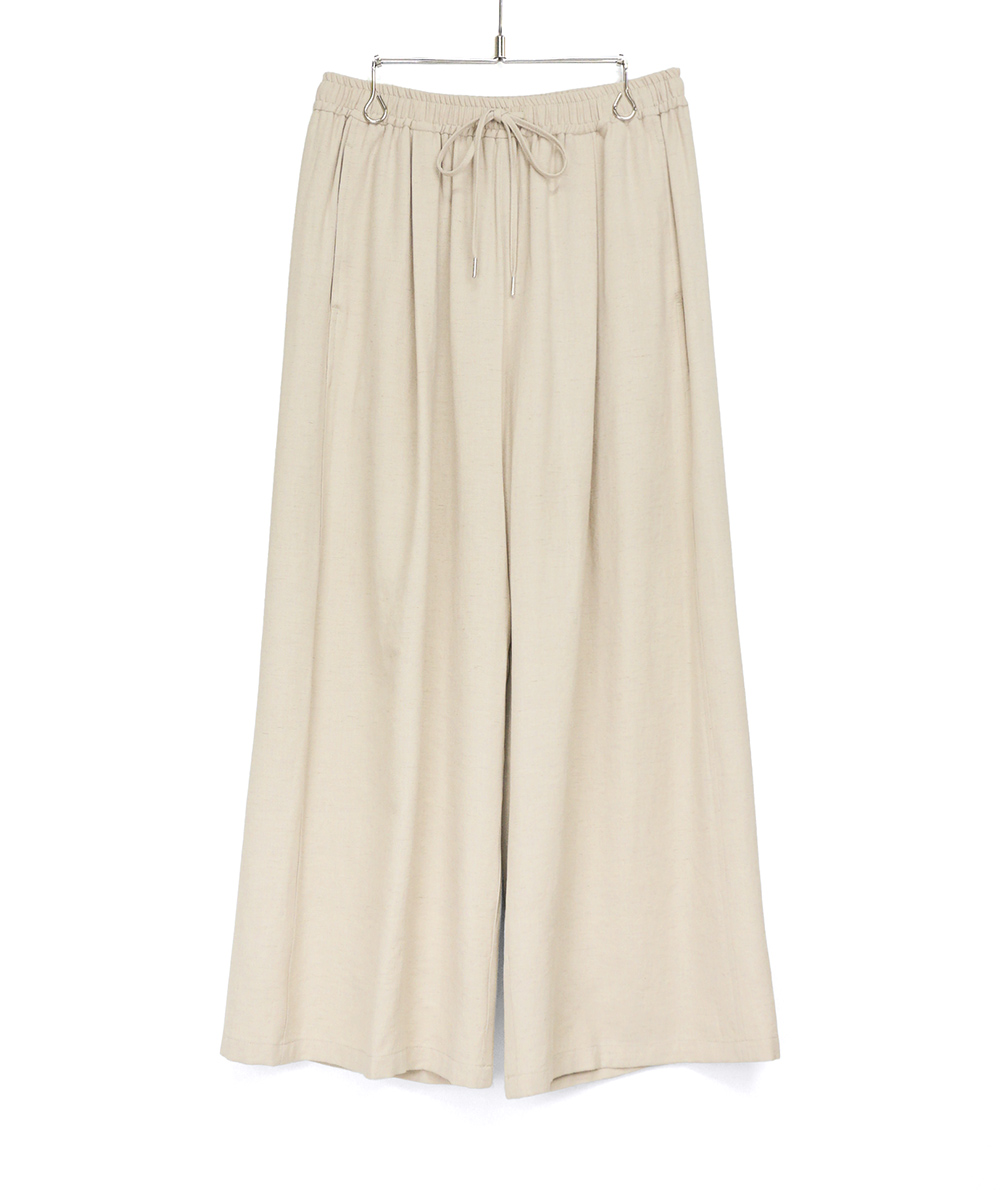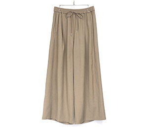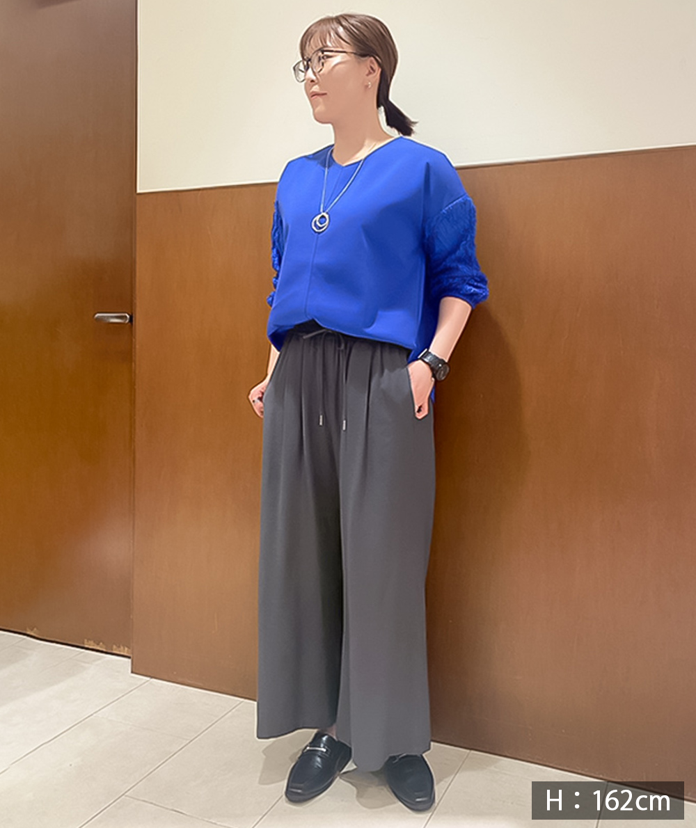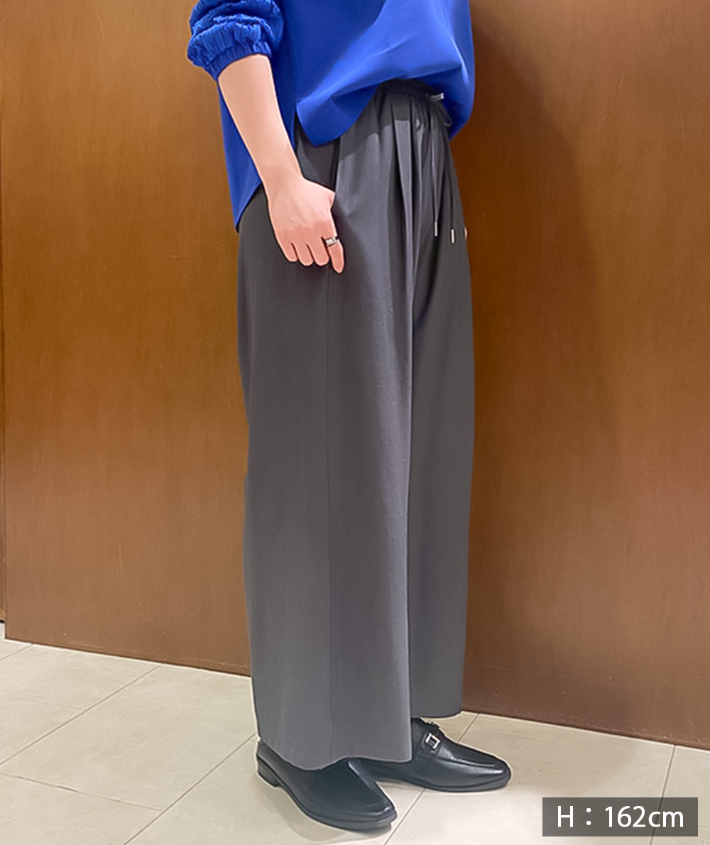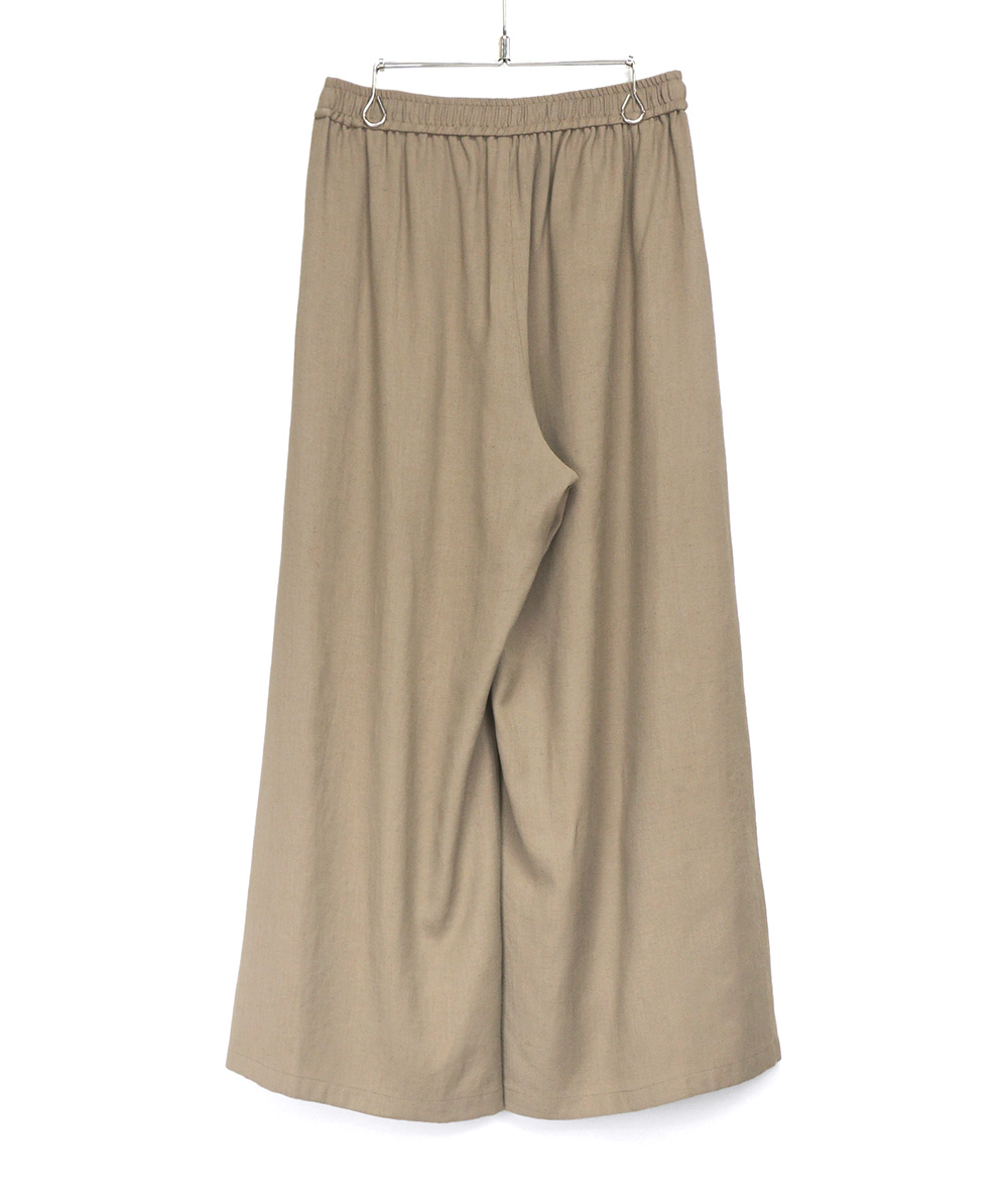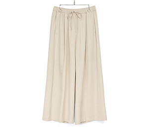 麻調の落ち感ある素材で仕立てたフレアワイドパンツは、ナチュラルな風合いと上品さが魅力の一枚です。程よい落ち感で美しいシルエットを生み出し、動くたびに女性らしい印象を与えてくれます。脇前の切り替えデザインで足長効果も期待できます。ウエストは総ゴム仕様になっており、締め付け感がなくリラックスして着用できます。Tシャツを合わせてもラフになりすぎず、程よくきちんと感のあるコーディネートが叶います。裾バルーンライトブルゾン(商品番号:022611028)とセットアップでの着用もおすすめです。