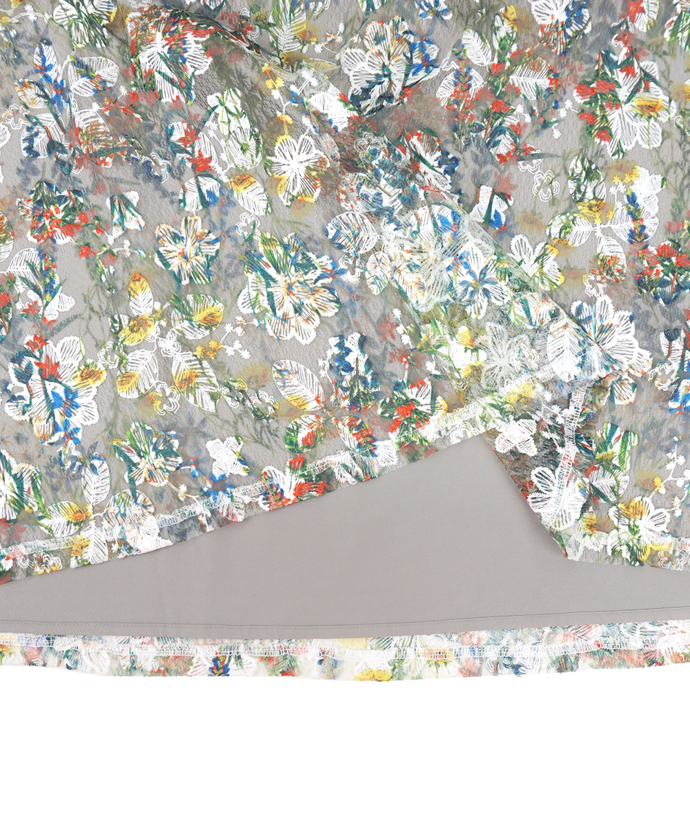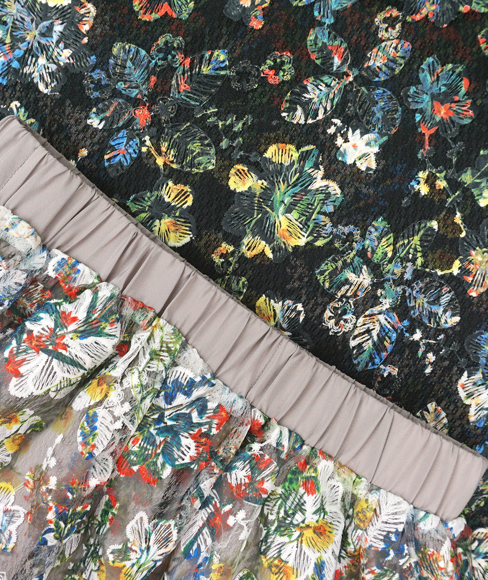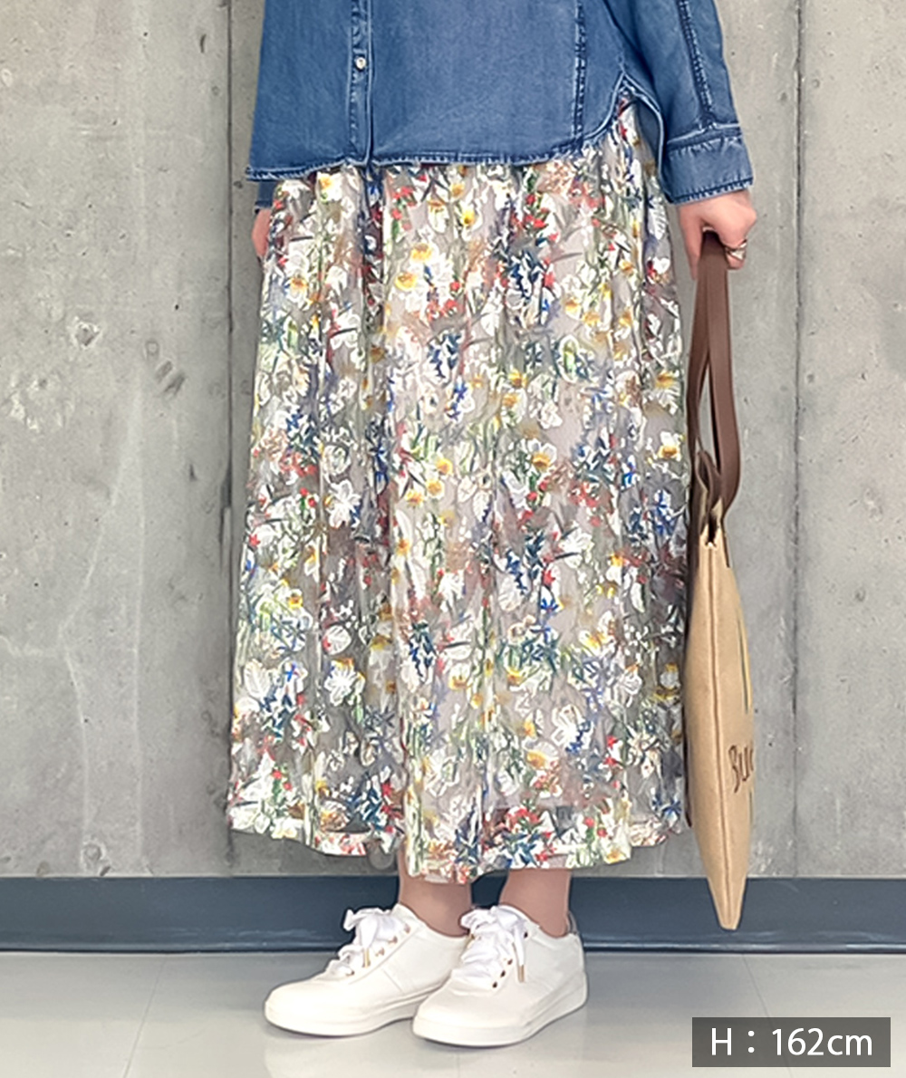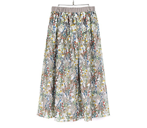 刺繍の上にフラワープリントを施した見栄えするスカートは1枚で華やかになるアイテムです。程よいボリューム感でニットやカットトップスと合わせたデイリースタイルにもおすすめです。