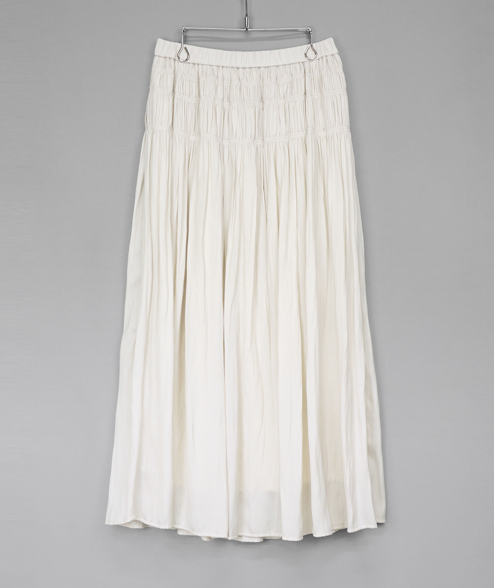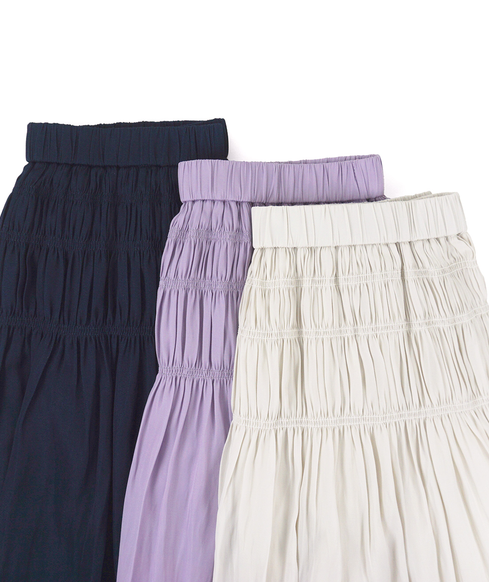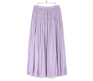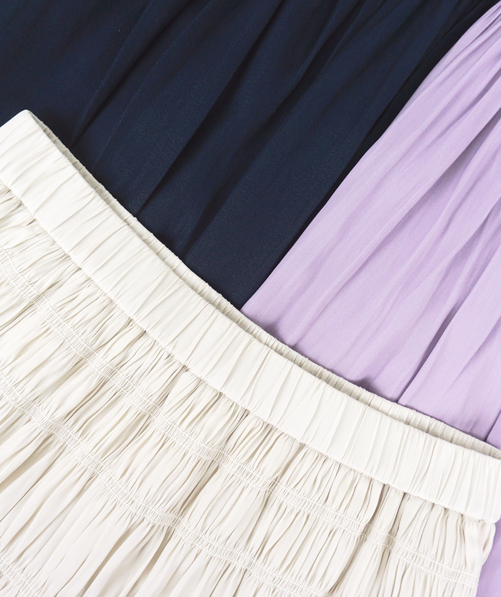 人気のカッセンロングスカートやトレンド感のあるシャーリング使いがポイントです。柔らかい素材なので広がりすぎず軽やかですっきりとしたシルエット。シンプルなTシャツやニットを合わせるだけでコーディネートが華やぐ存在感のある一枚です。
