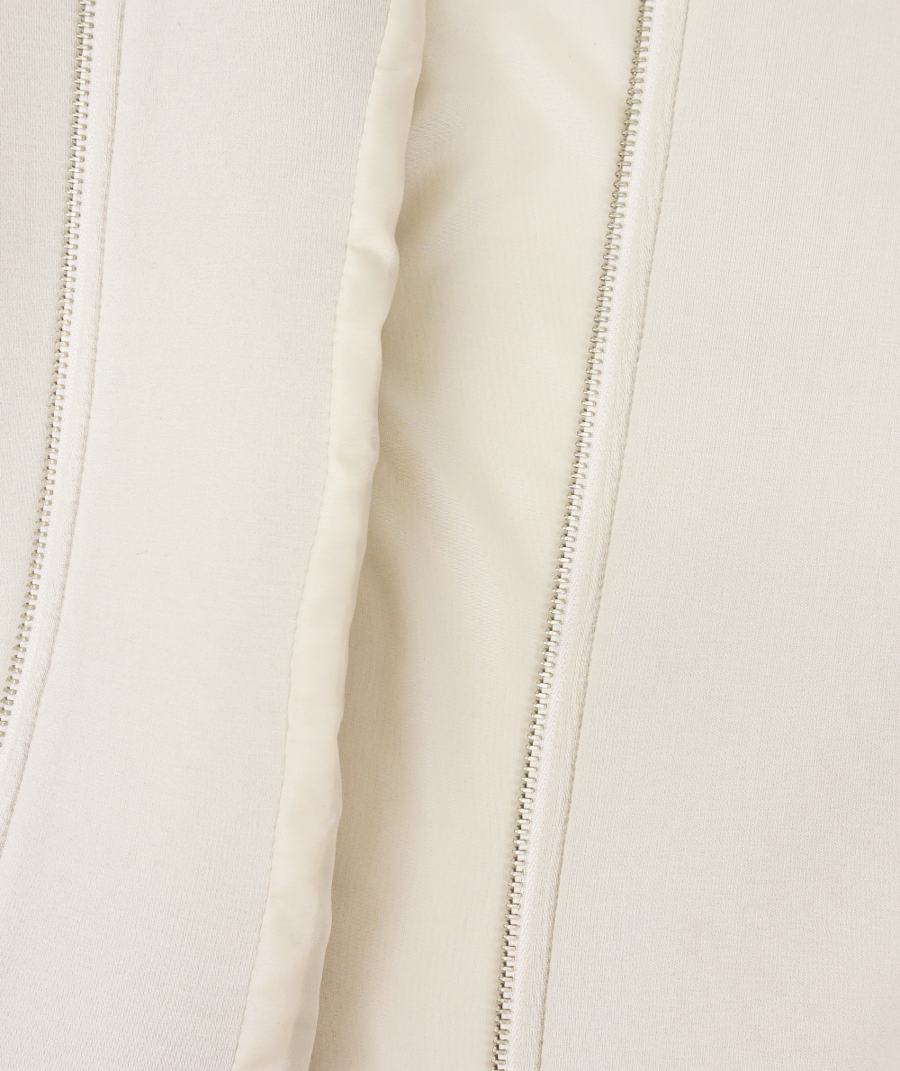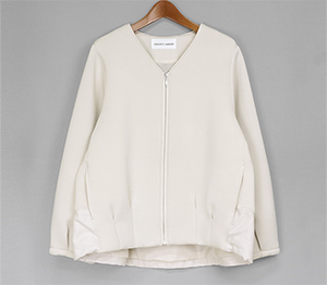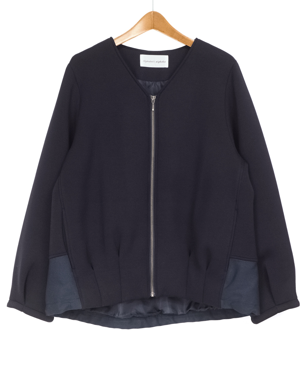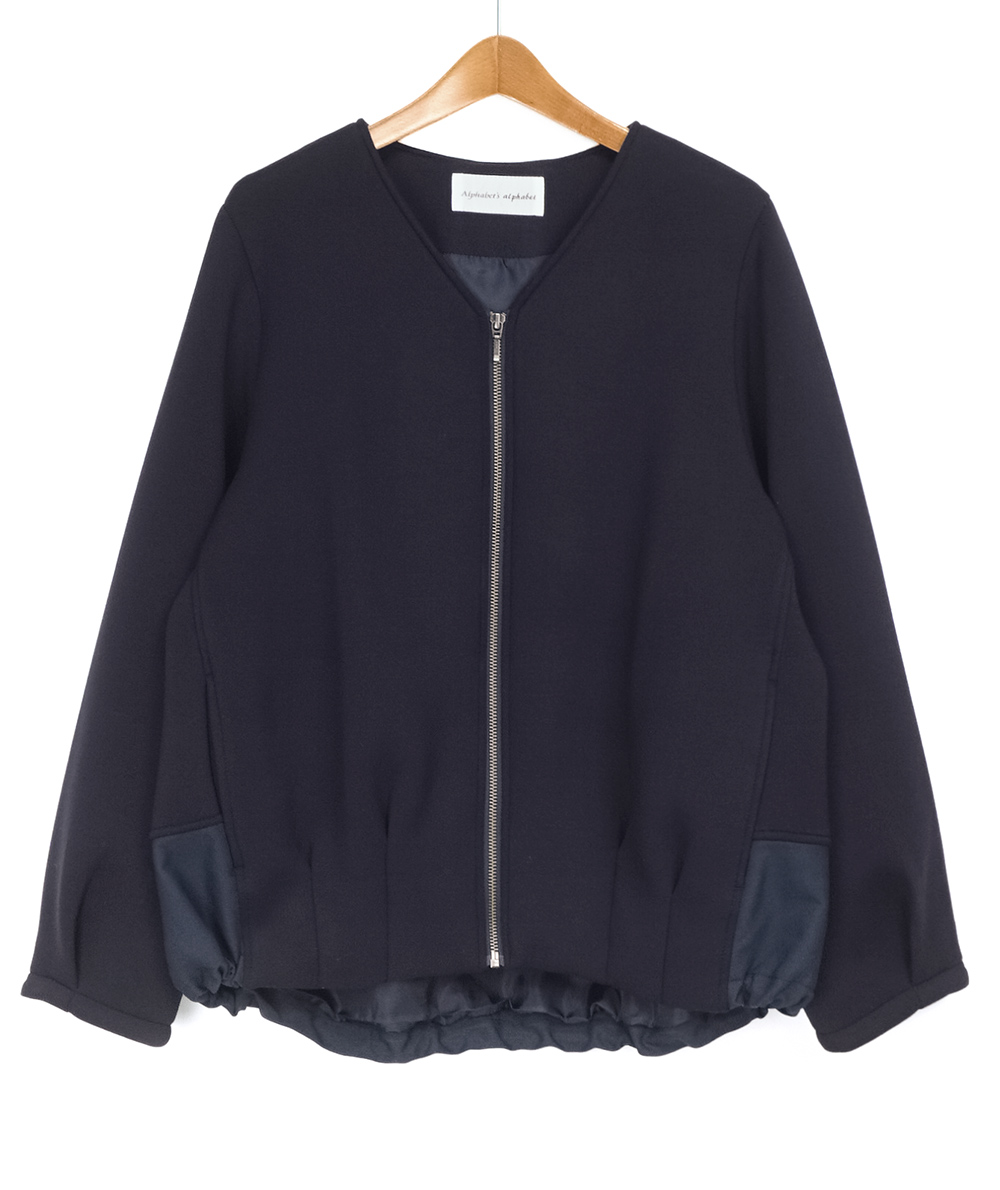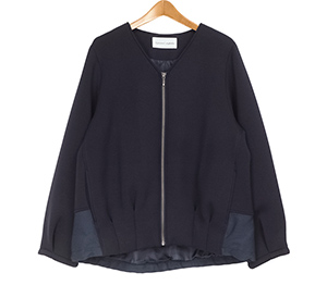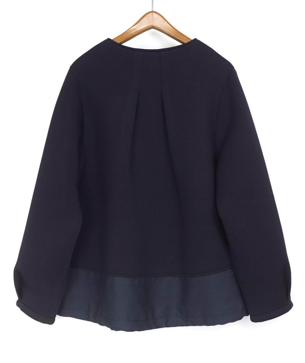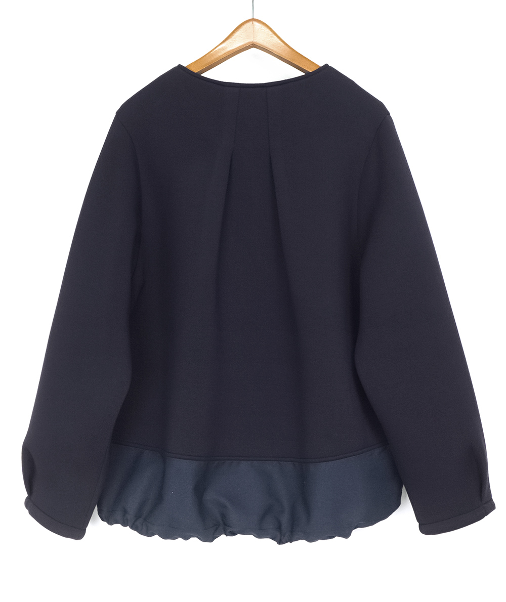 タックデザインでスッキリ見えるダンボールニットと同色系布帛ドッキングの春ジャケット。程よい厚みのダンボールニット生地は、肌触りも着心地も良く仕上がっています。袖はセットインで裾のドロストゴムは後ろだけに入っているので、ラフに見えすぎずお仕事やちょっとしたお出かけにも着やすいです。裏地が付いているので袖滑りもよく、インにニットやコンパクトめのジャケット等も着ていただけます。マザーニーズの羽織りにもおすすめです。