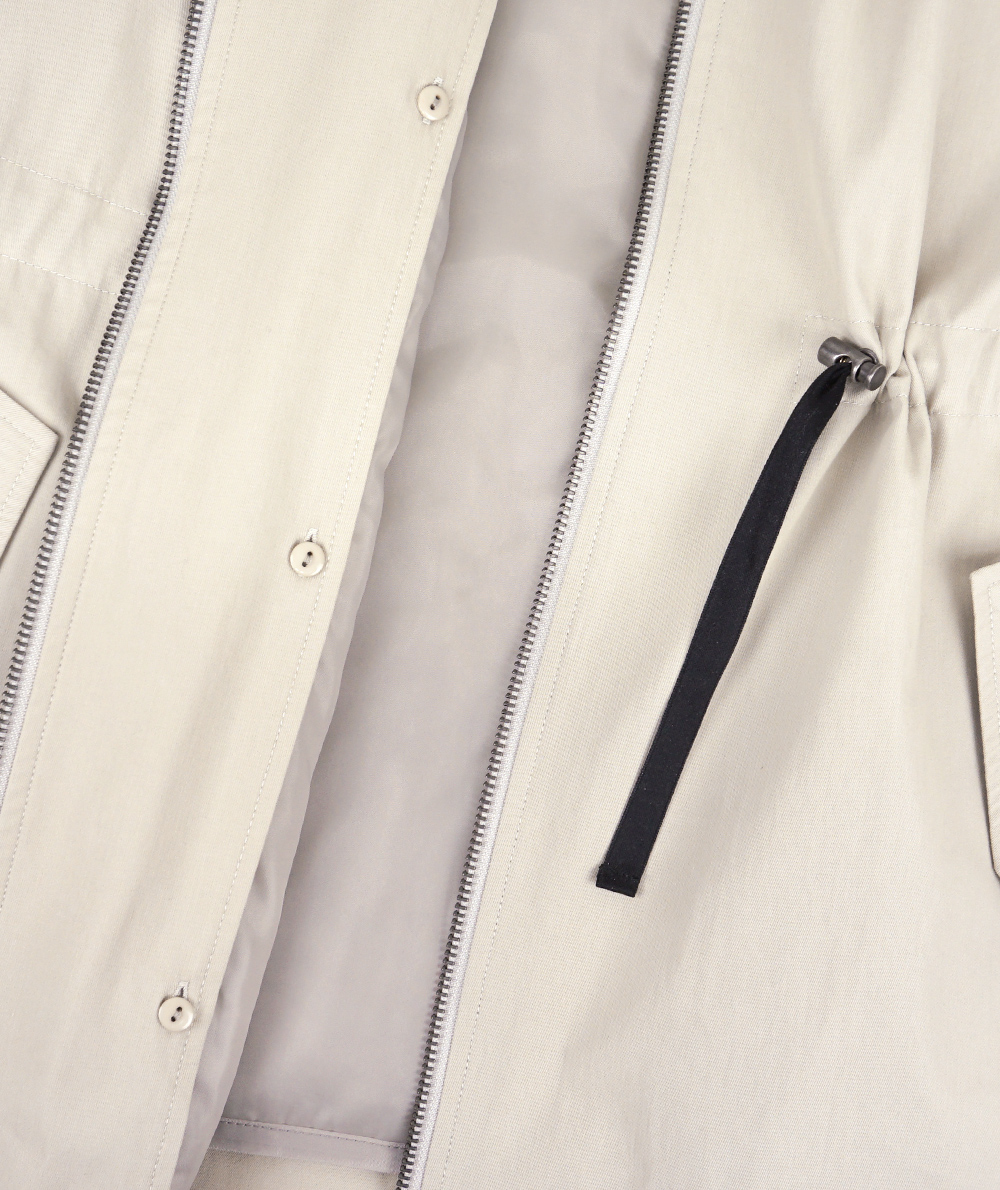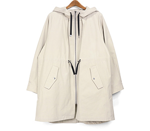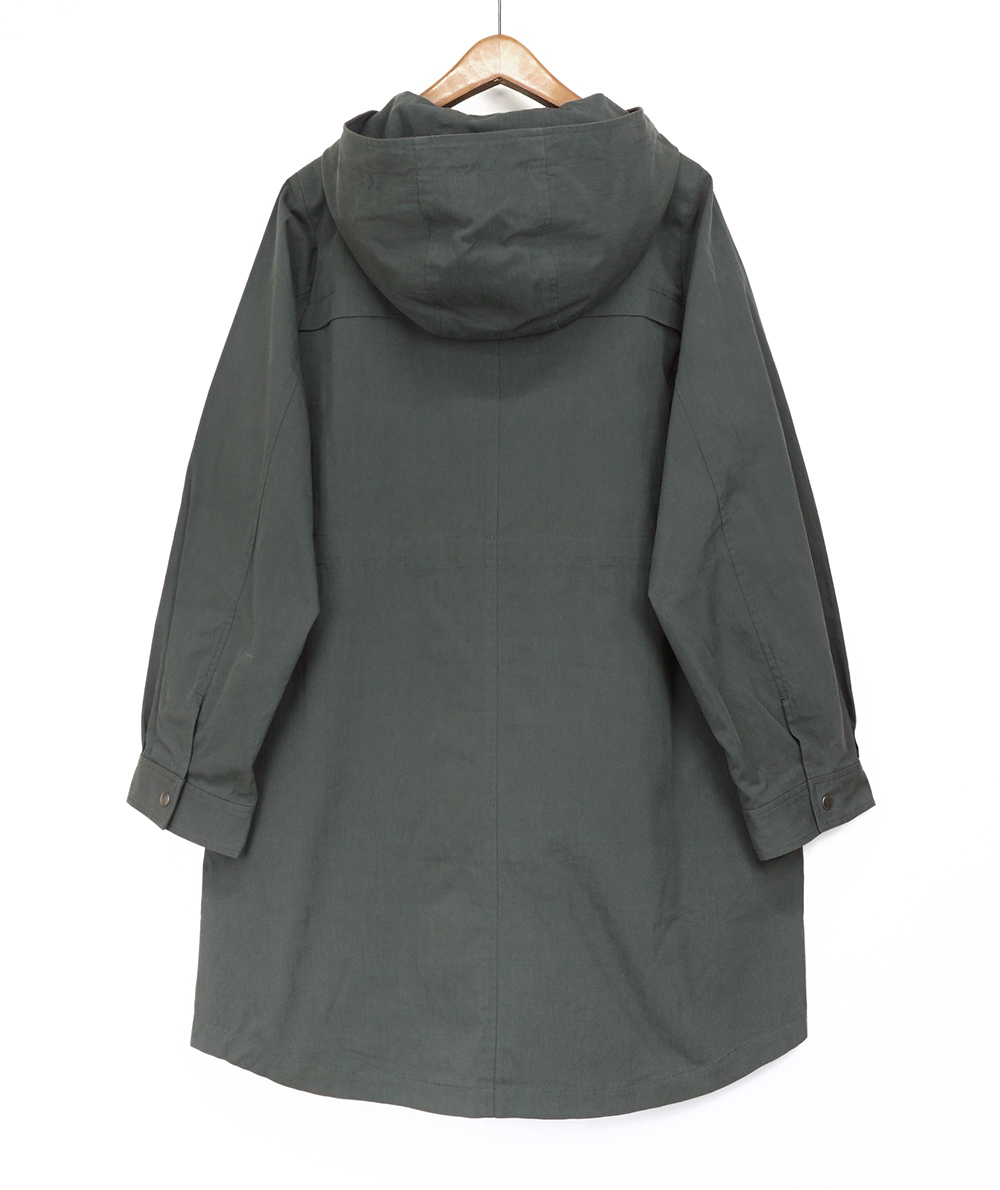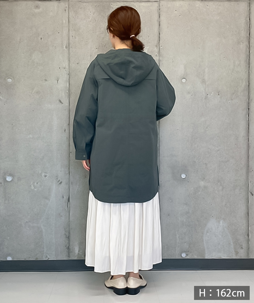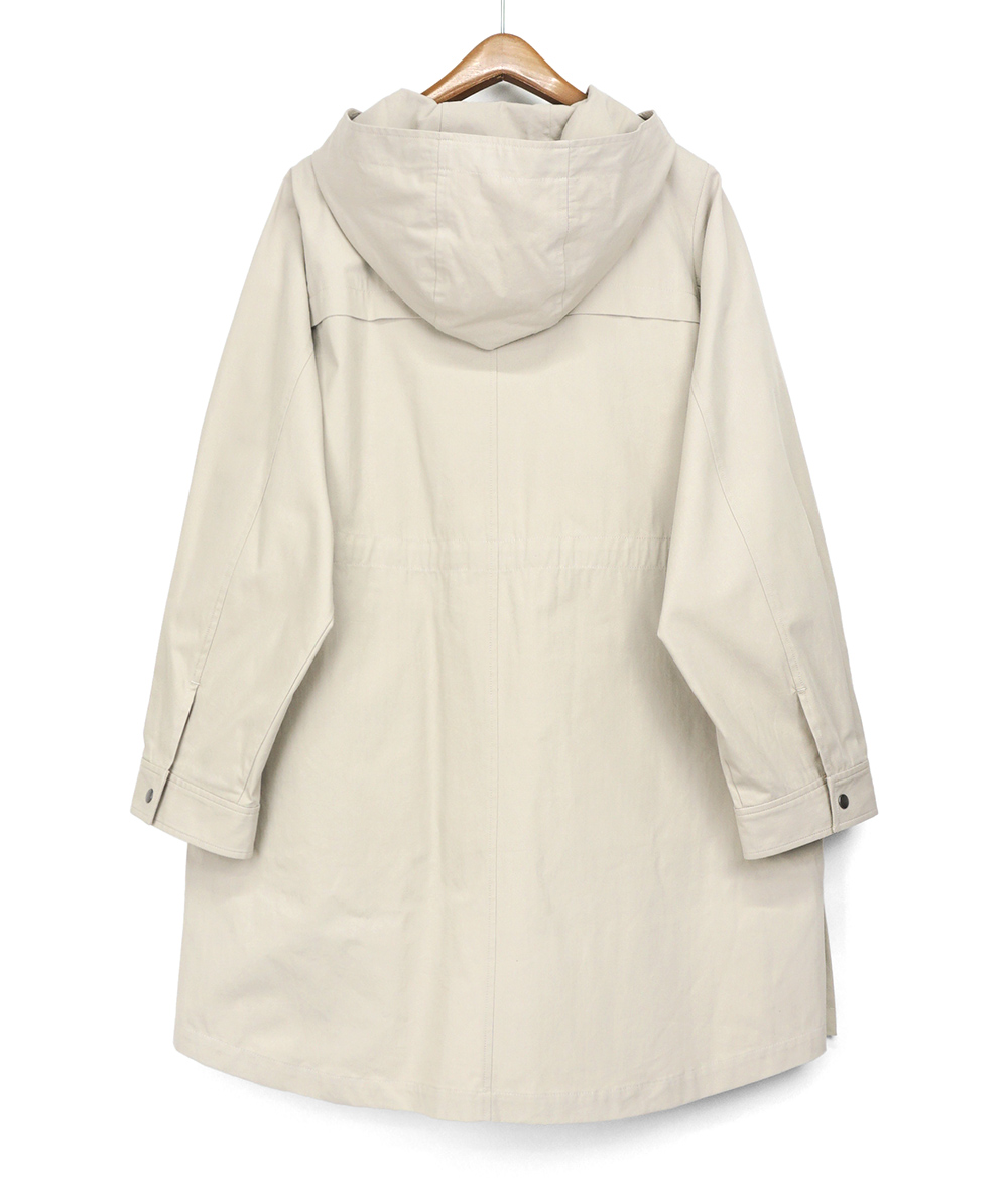 中わたライナーが付いた綿混素材のラフなフード付きコート。ロングマンパーのようなラフなデザインながら、生地やタック使いなどで大人の方がお仕事やデイリーに着回せるように仕上げています。ヒモのブラック配色がアクセントになっています。ライナーを着脱することで春や秋など長い期間活躍できるコートです。