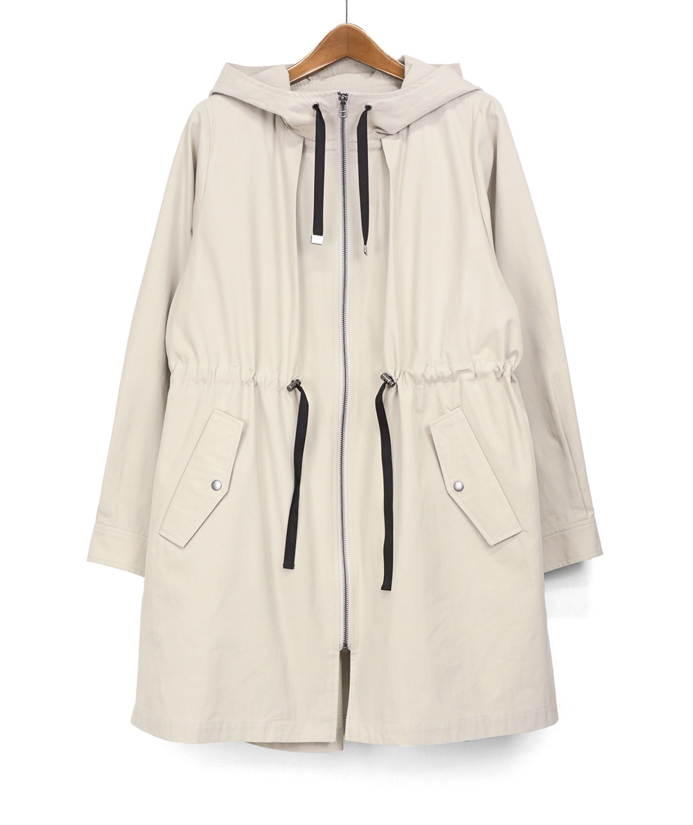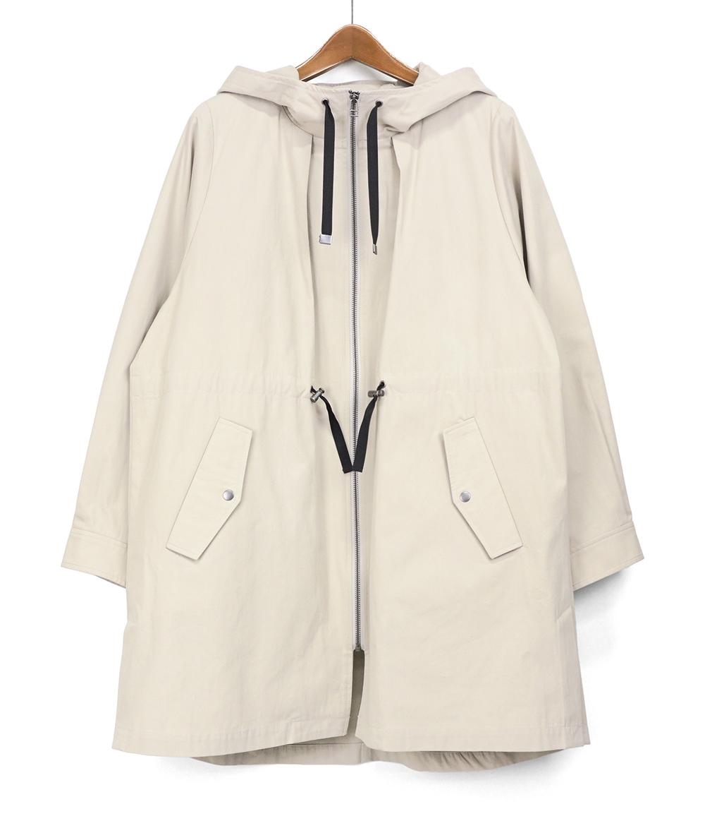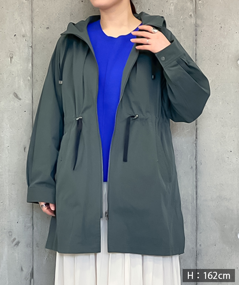 中わたライナーが付いた綿混素材のラフなフード付きコート。ロングマンパーのようなラフなデザインながら、生地やタック使いなどで大人の方がお仕事やデイリーに着回せるように仕上げています。ヒモのブラック配色がアクセントになっています。ライナーを着脱することで春や秋など長い期間活躍できるコートです。