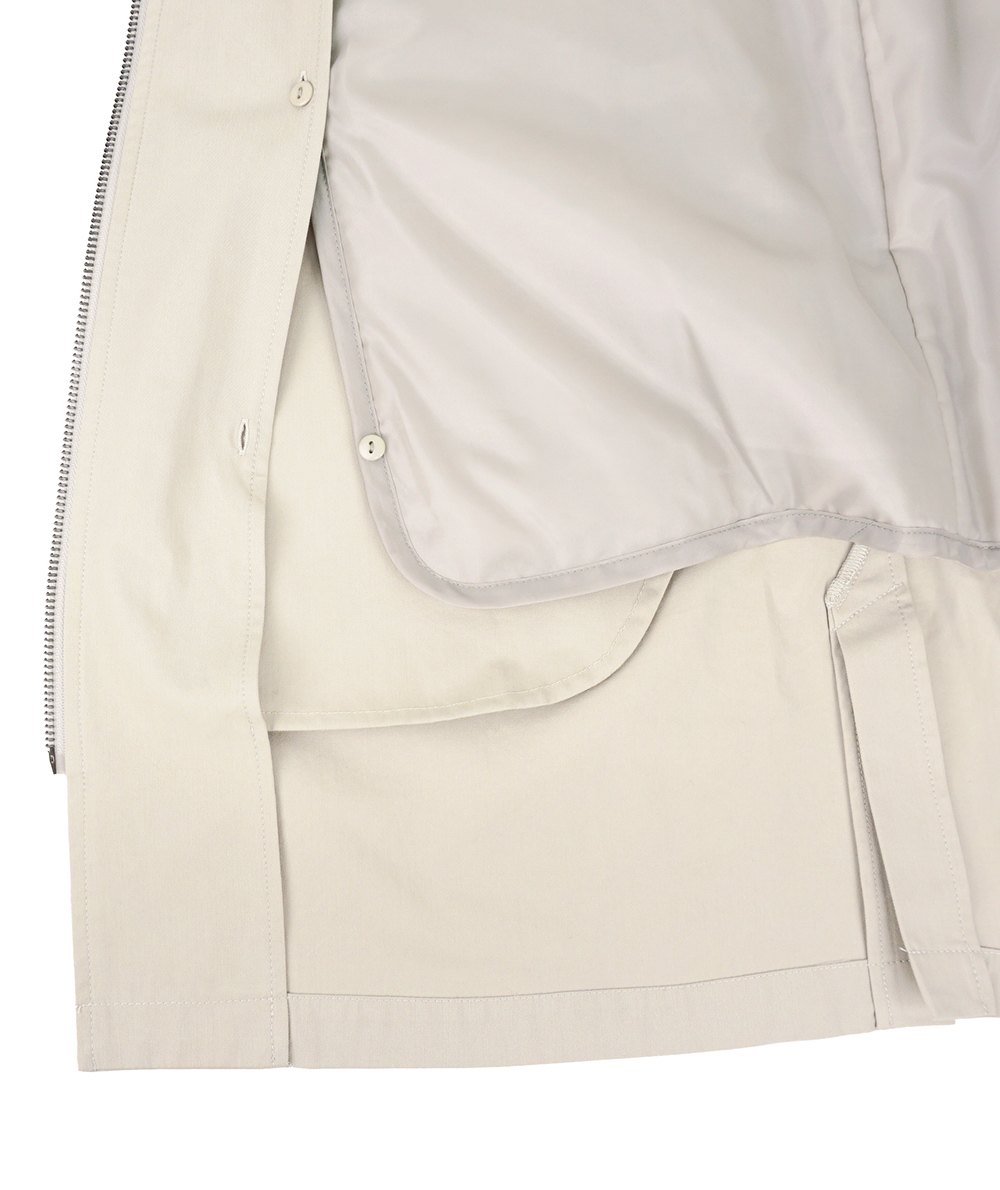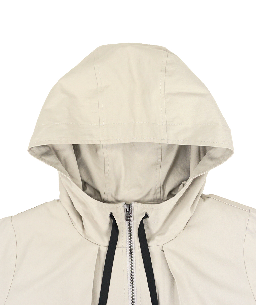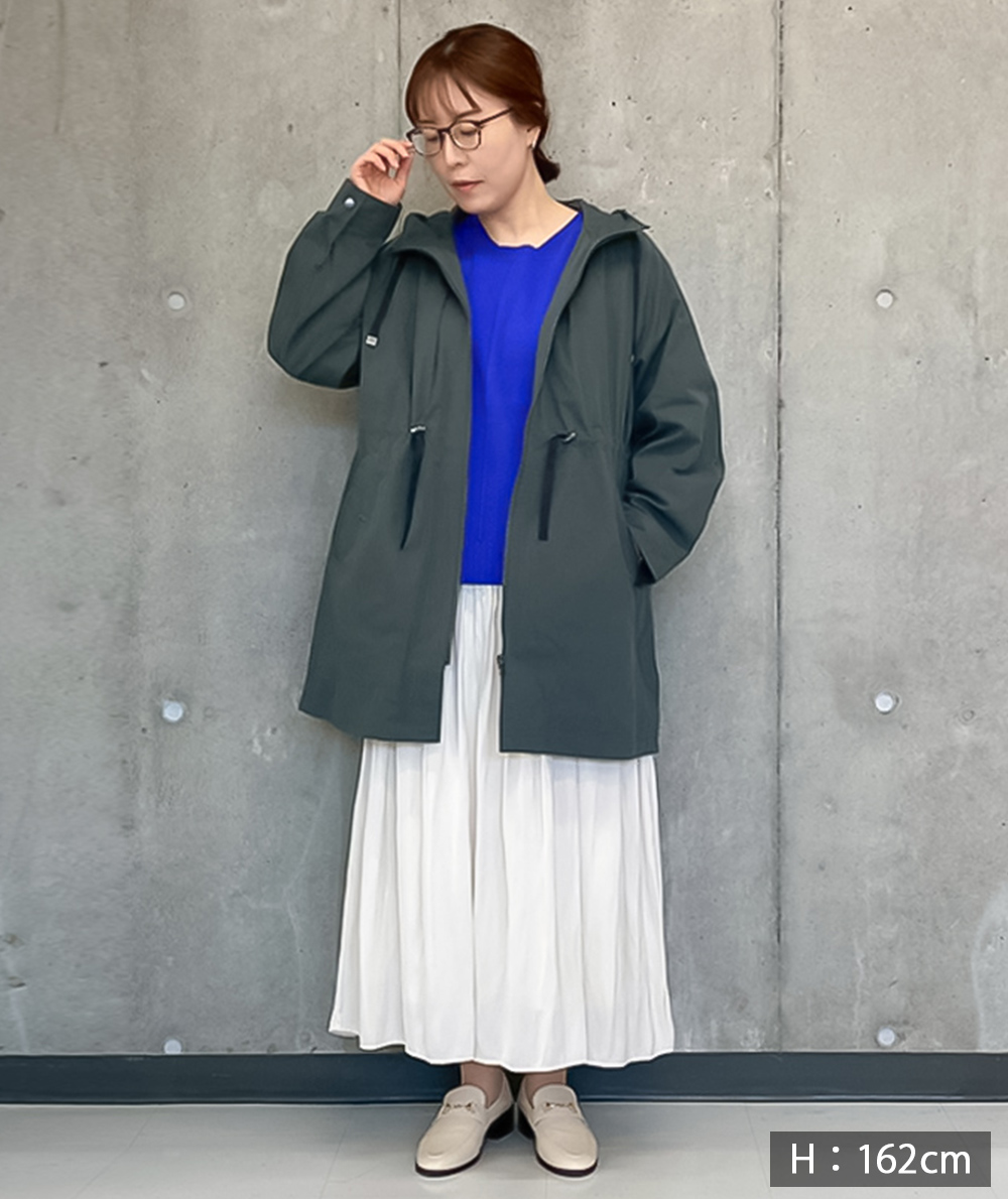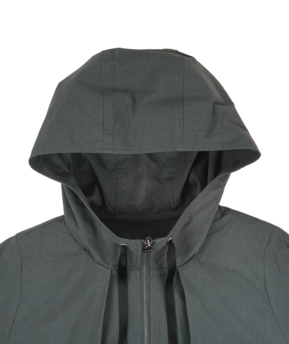 中わたライナーが付いた綿混素材のラフなフード付きコート。ロングマンパーのようなラフなデザインながら、生地やタック使いなどで大人の方がお仕事やデイリーに着回せるように仕上げています。ヒモのブラック配色がアクセントになっています。ライナーを着脱することで春や秋など長い期間活躍できるコートです。