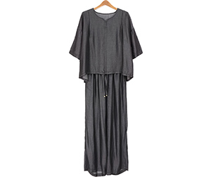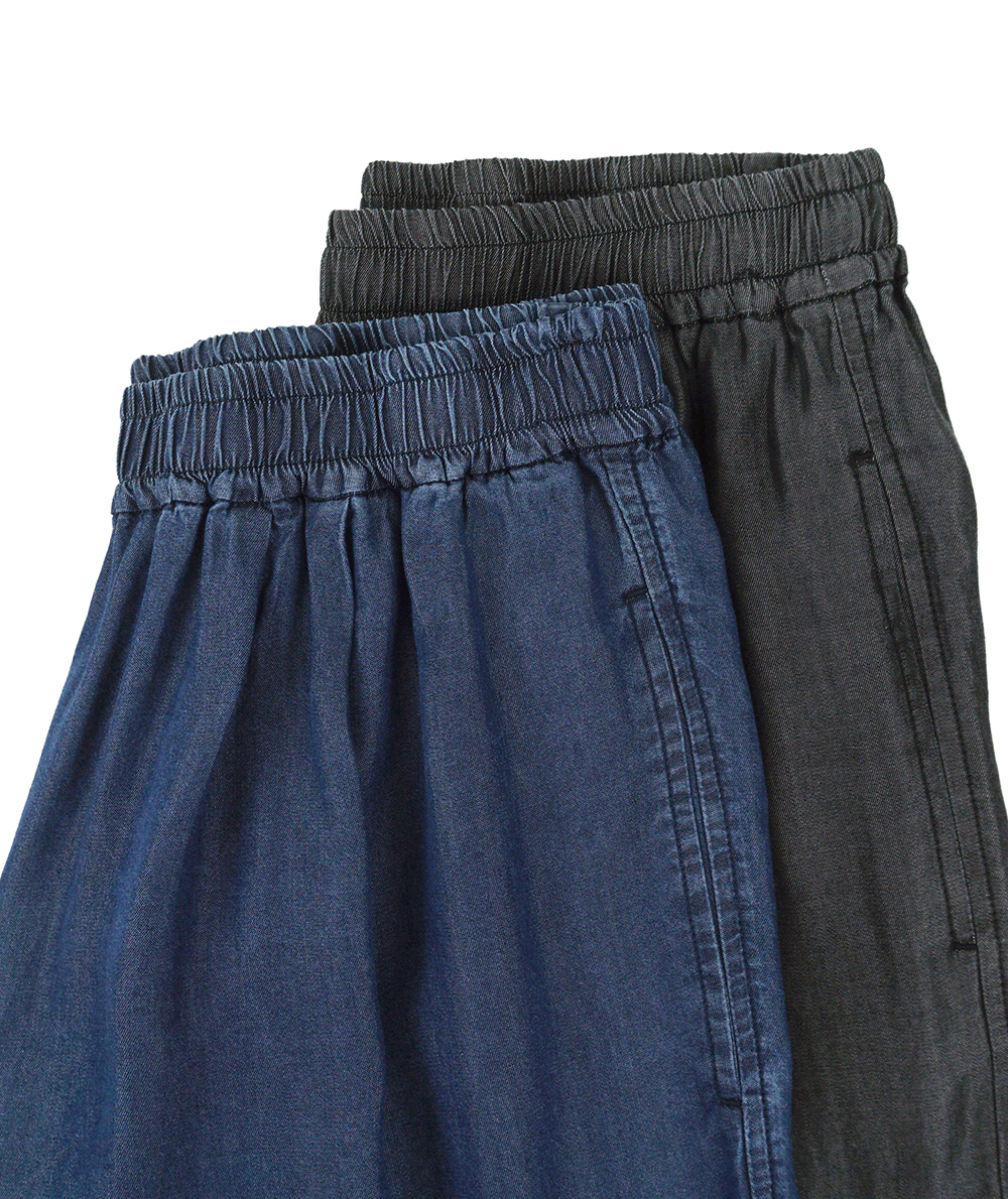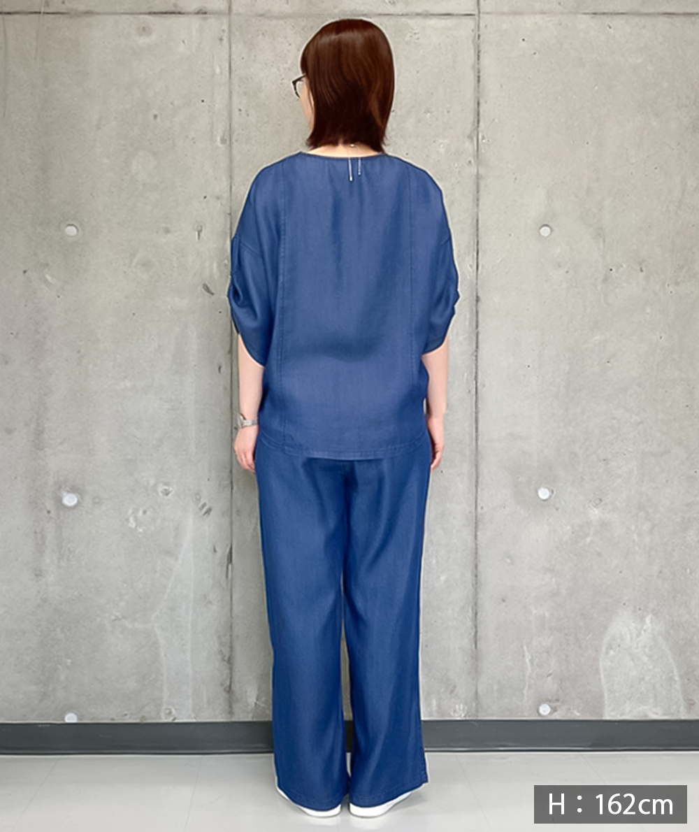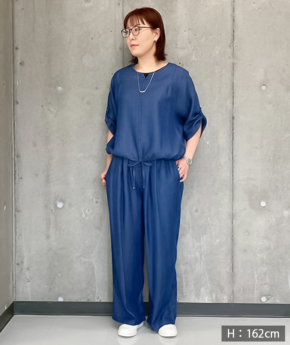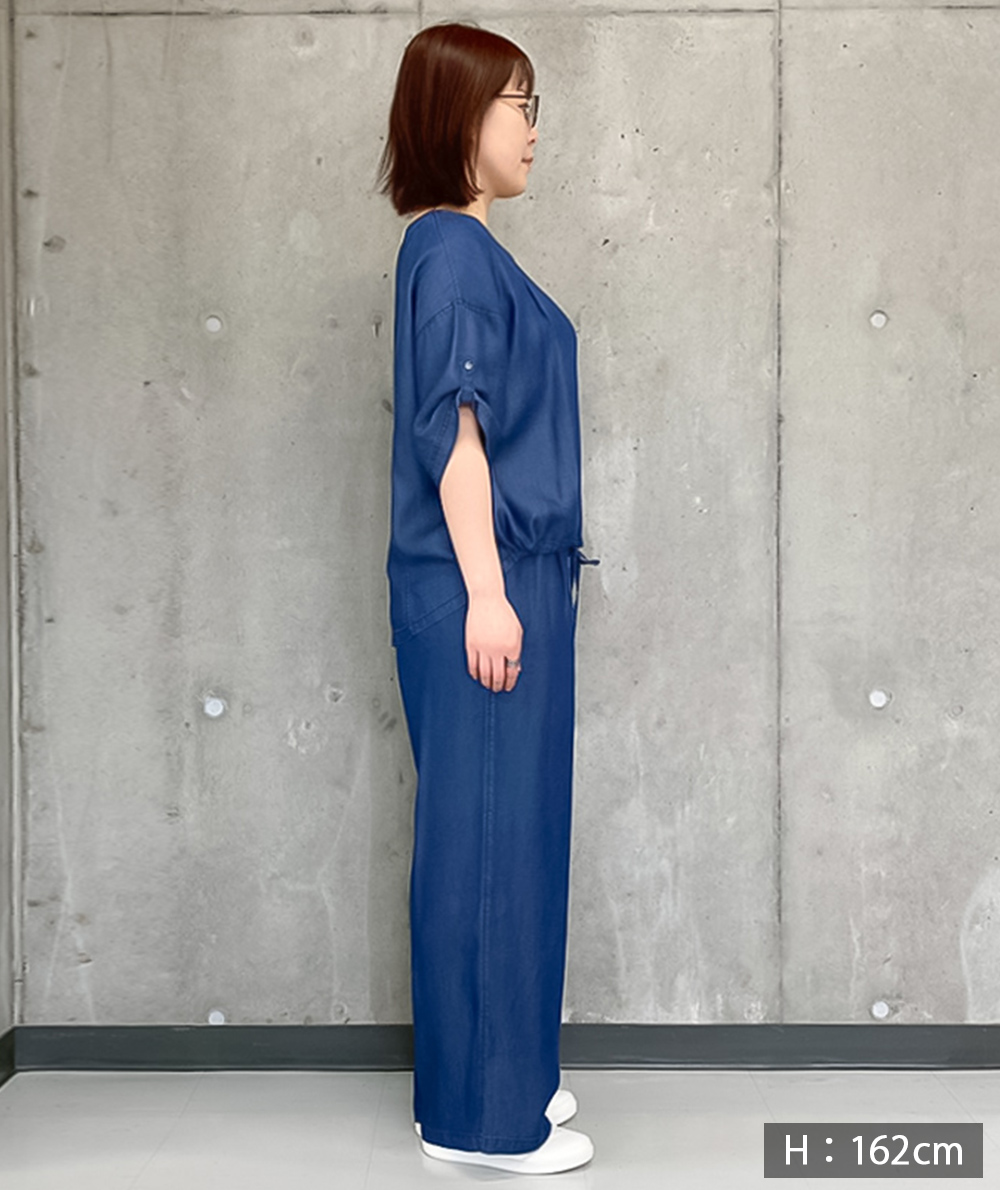 柔らかくほんのり光沢があるテンセルデニム生地を使用したブラウスとワイドパンツのセットアップ。ブラウスはキーネックデザインで首元がスッキリ見えします。前裾のみに共生地のヒモが通っているので、裾を絞ってインしなくてもバランスが取りやすくなっています。パンツはタックやゴムギャザーでゆとりがあるのにスッキリ見えるシルエットが魅力。ウエストがオールゴムになっているのでスッと着脱しやすいイージータイプです。デニムをセットアップで着ることによってどこかきちんと感もあるコーデになるので、旅行などにもおすすめです。