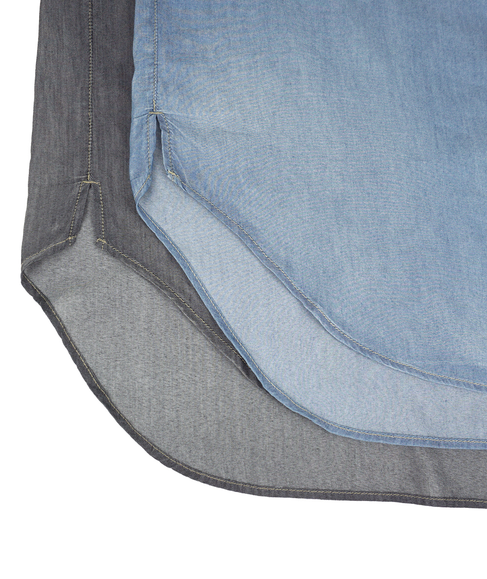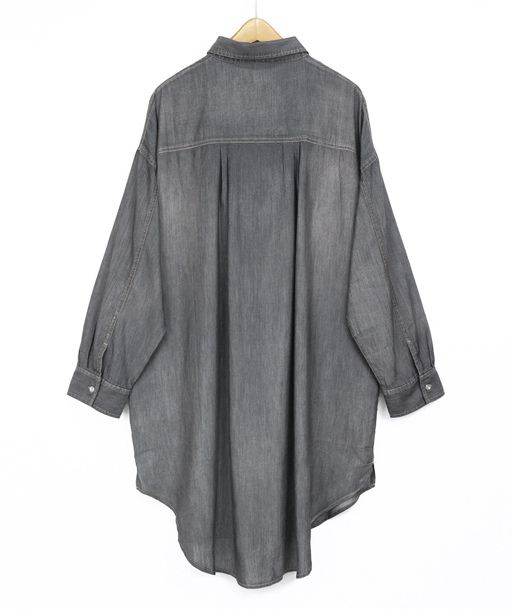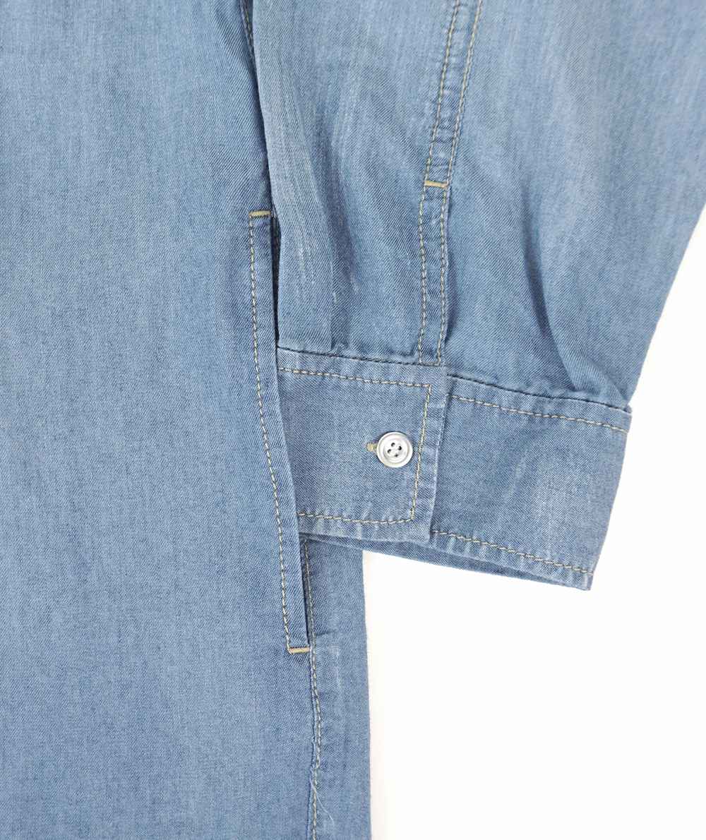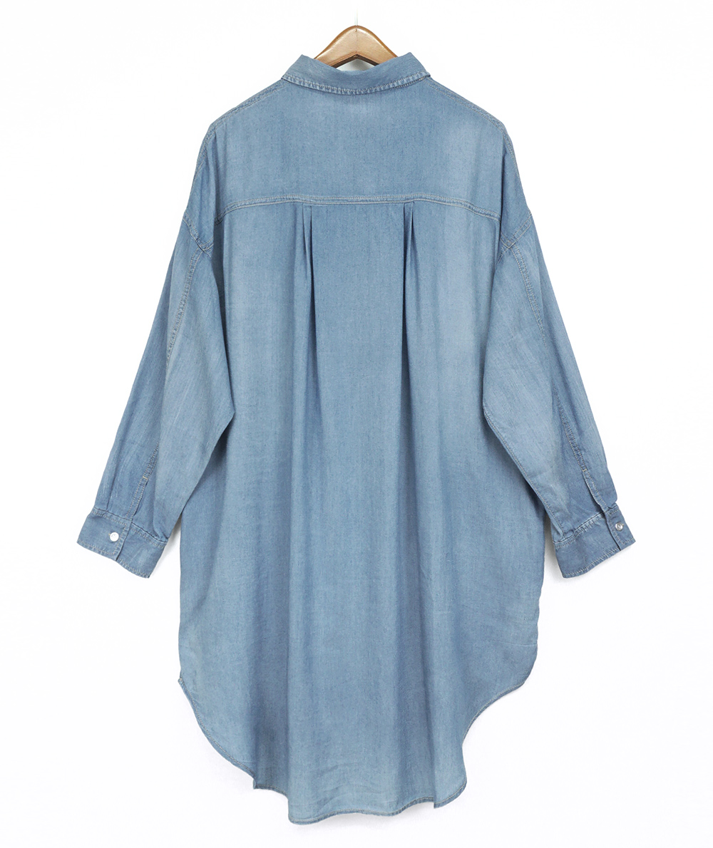 トレンドのシアーデニムを使用した羽織シャツワンピース。薄い素材に加工を施し柔らかく雰囲気のある風合いに仕上げました。透けすぎない薄さで、春から夏・秋と長く着ていただけます。短めの着丈でボトムスとのレイヤードコーデがおすすめ。薄く柔らかな素材に触感冷感の加工を施しているので暑い夏の羽織りにピッタリ。加工は手作業でしているため、見え方が1枚ずつ違います。