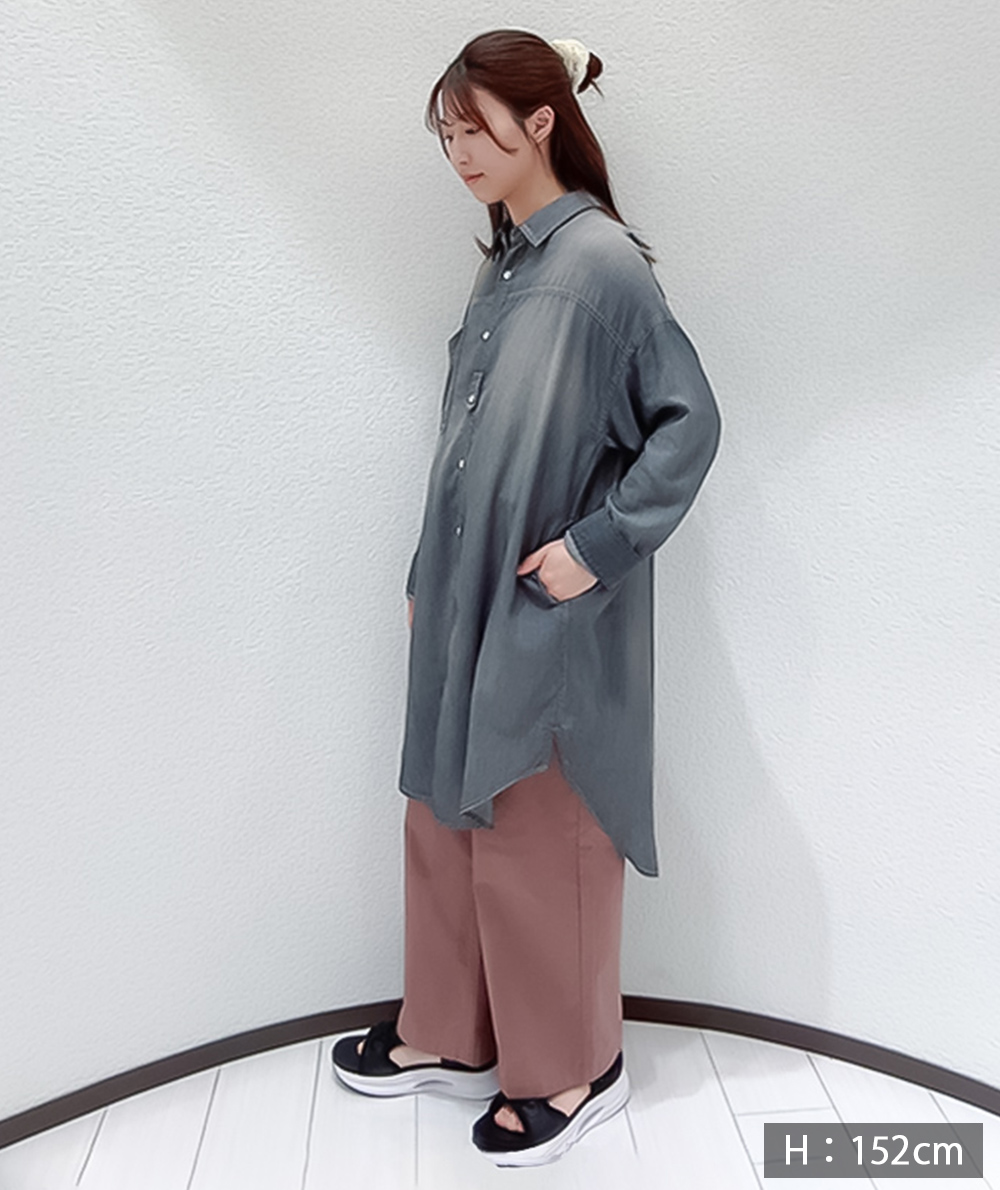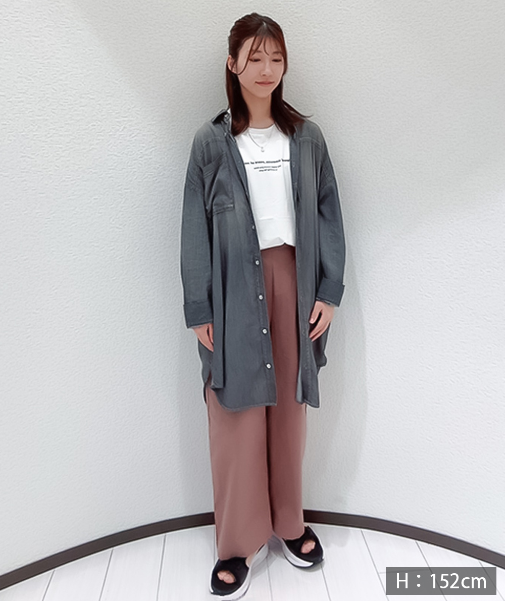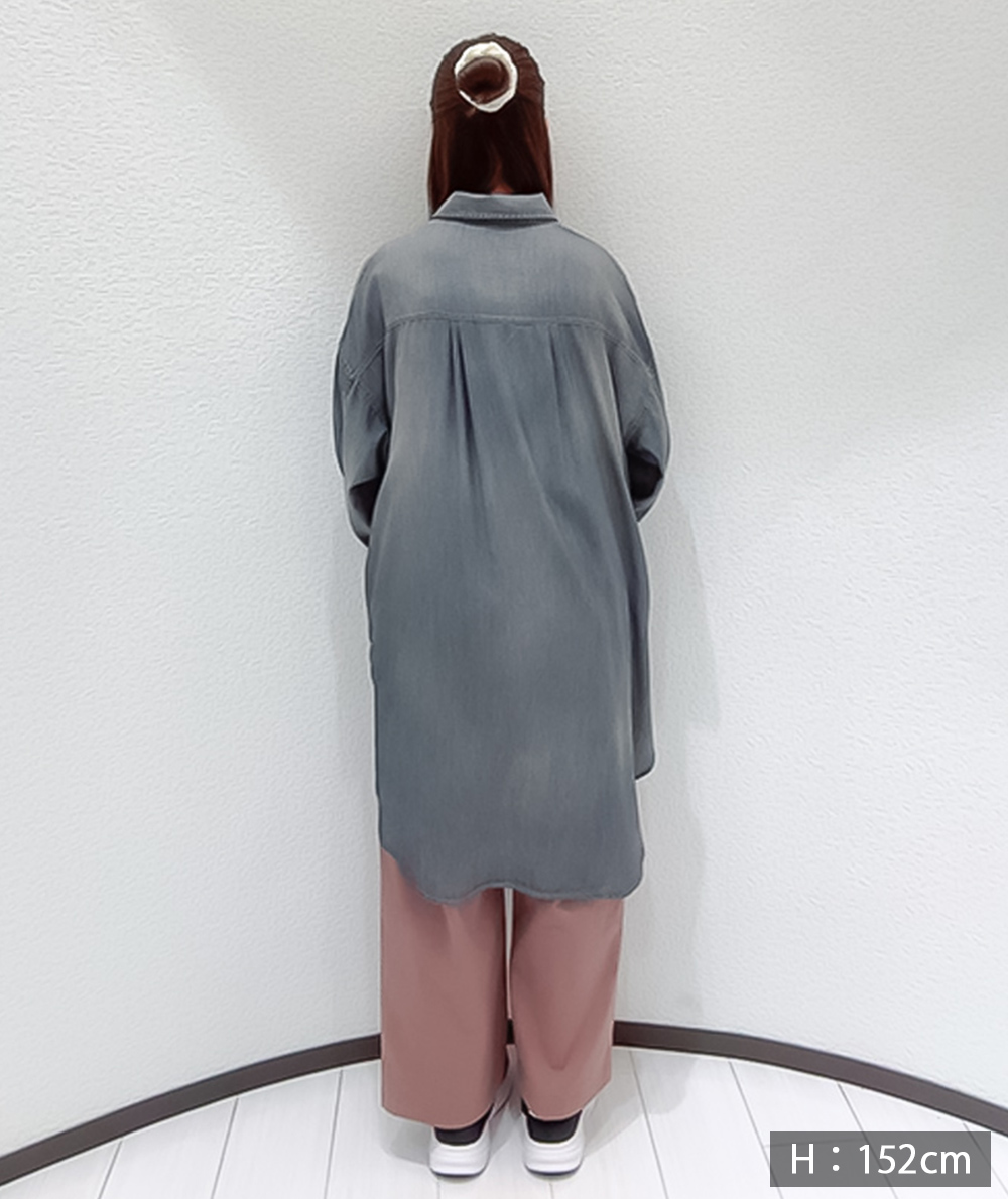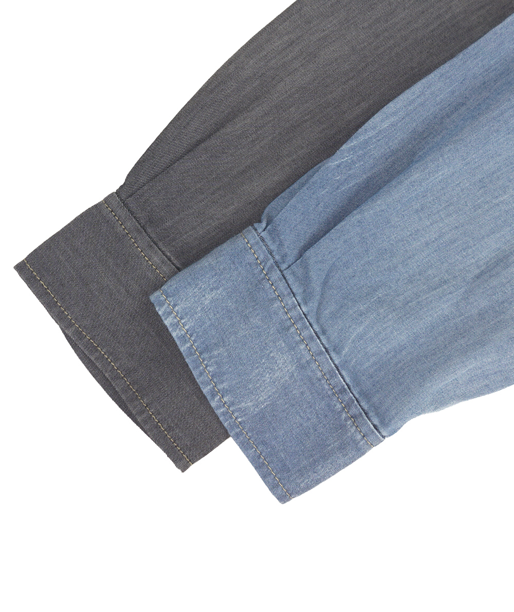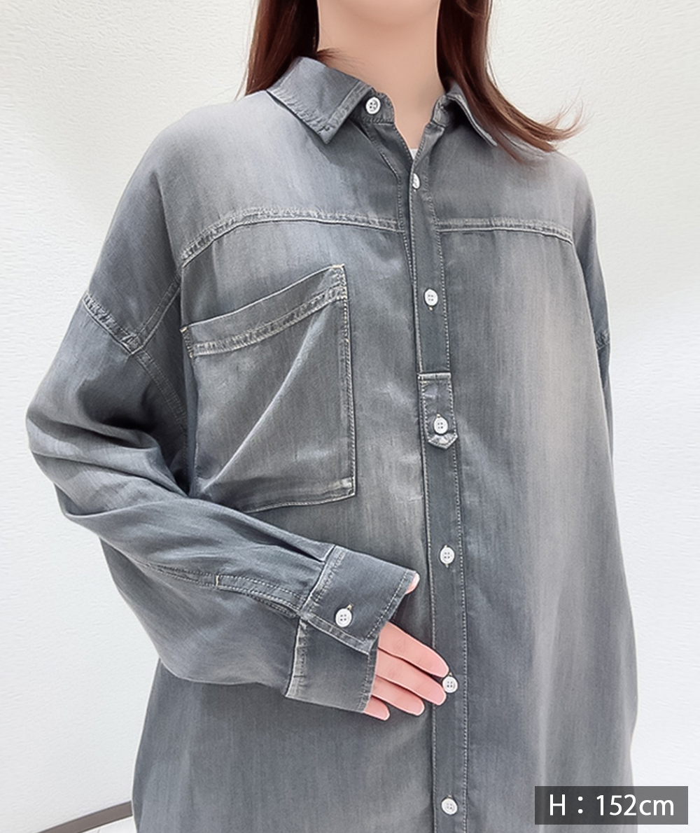 トレンドのシアーデニムを使用した羽織シャツワンピース。薄い素材に加工を施し柔らかく雰囲気のある風合いに仕上げました。透けすぎない薄さで、春から夏・秋と長く着ていただけます。短めの着丈でボトムスとのレイヤードコーデがおすすめ。薄く柔らかな素材に触感冷感の加工を施しているので暑い夏の羽織りにピッタリ。加工は手作業でしているため、見え方が1枚ずつ違います。
