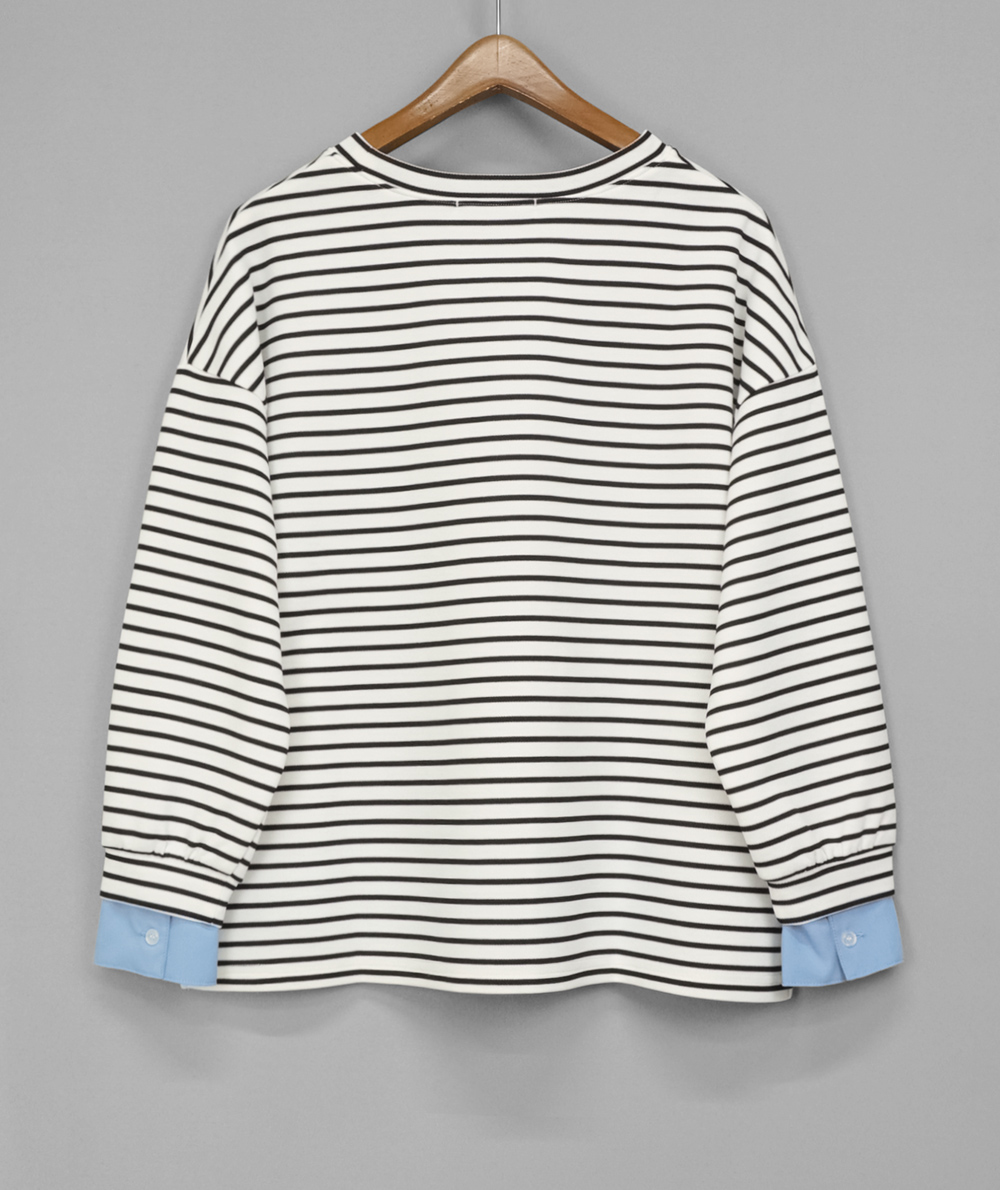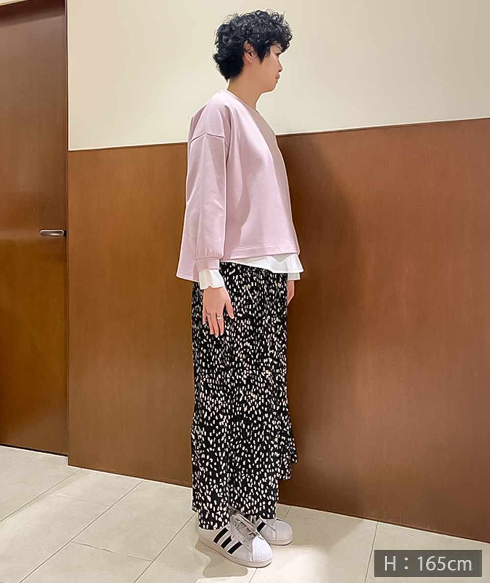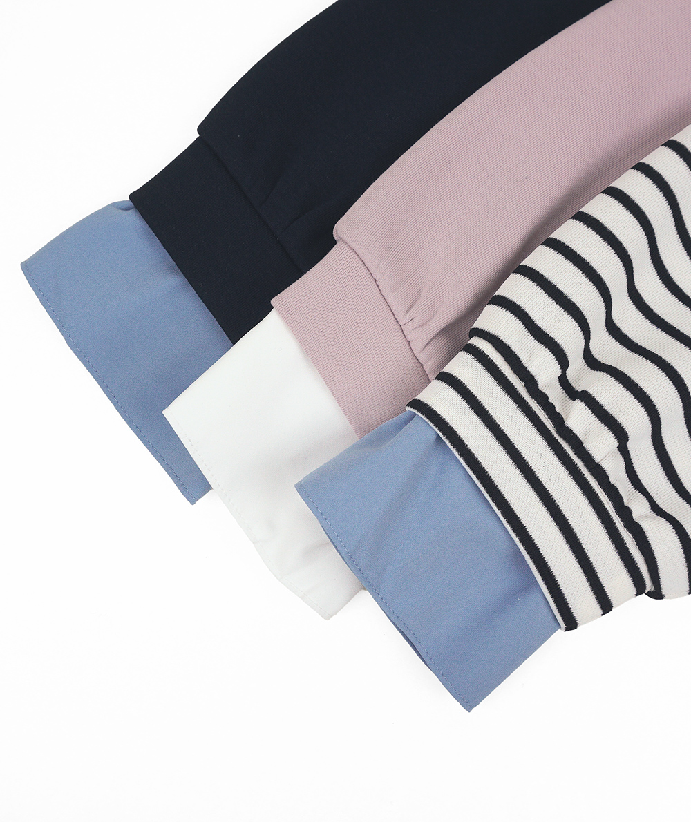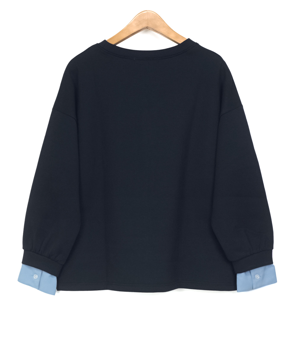重ね着したようなレイヤード風トップスは袖口と裾にドッキングされたシャツが旬なデザインで、一気にトレンドライクな印象に。カジュアルながらも大人な印象で遊び心のある1枚です。前裾は異素材部分がシャツテールデザインで、インせずワイドパンツやスカートを合わせやすいです。