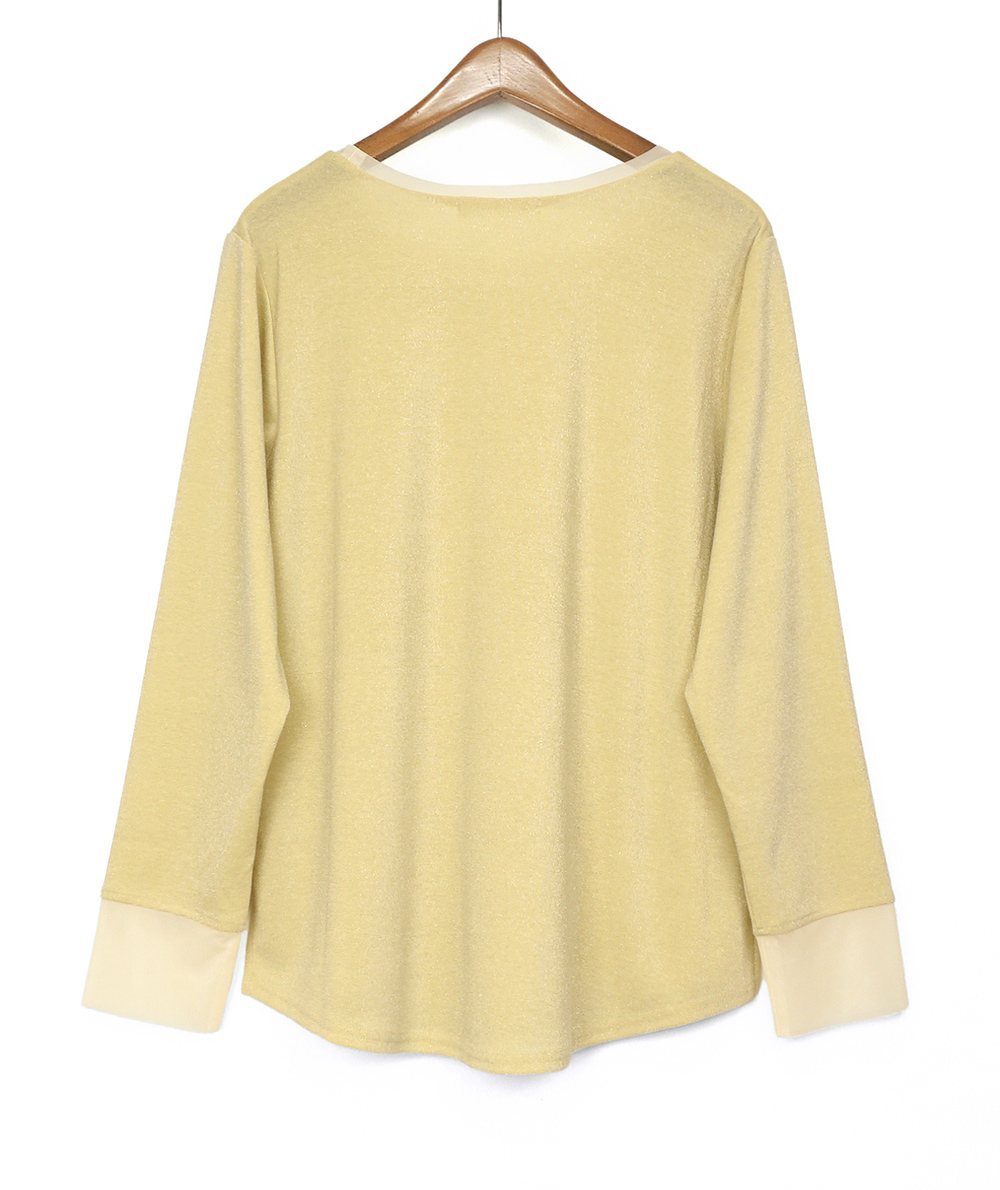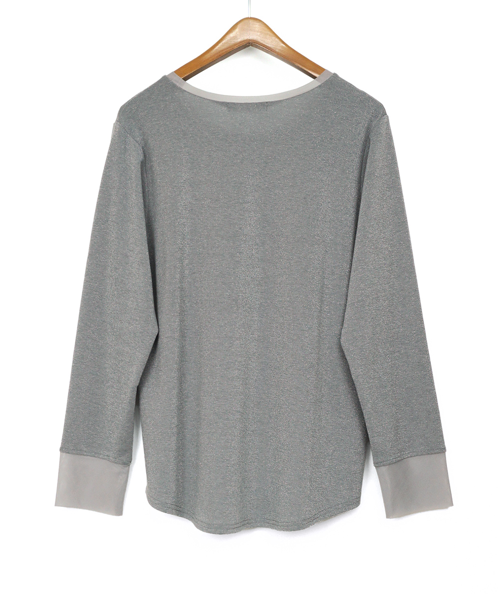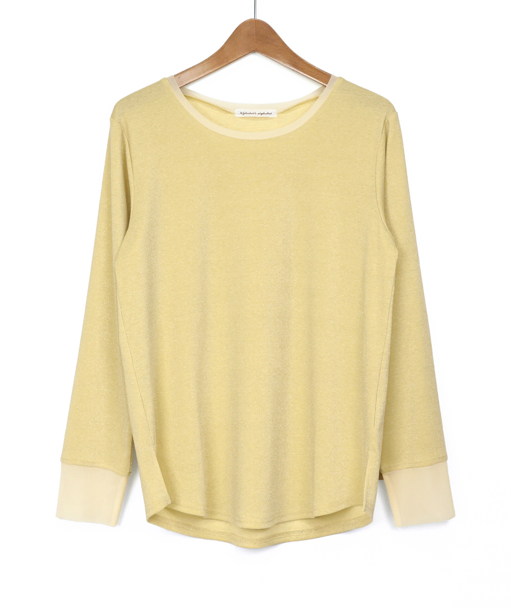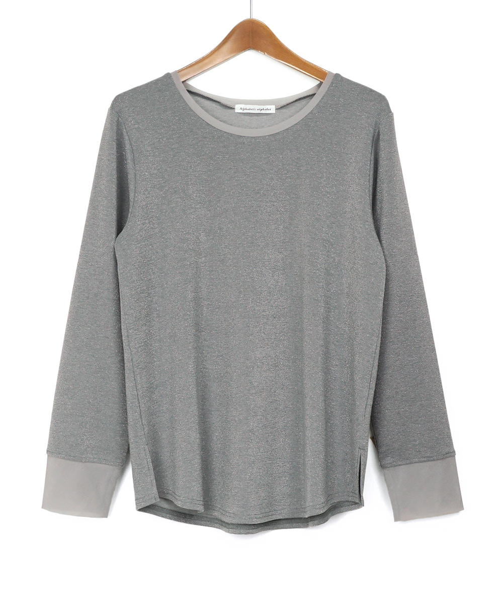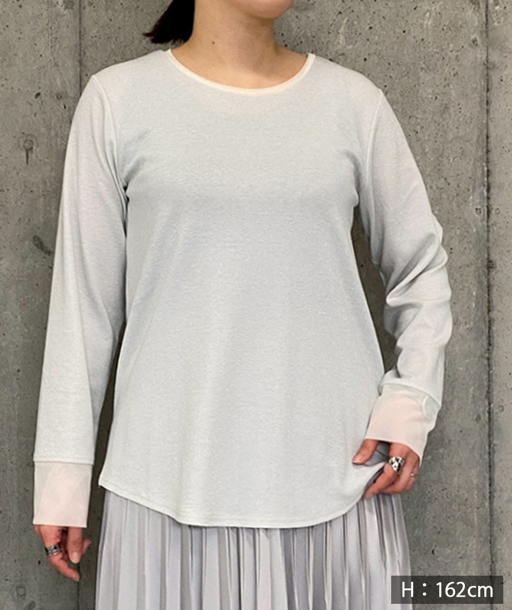ノースリーブで人気のさりげないラメ生地を使用したロンTは衿ぐりと袖口にチュールを施し、軽やかな雰囲気に仕上げました。伸縮性と肌触りの良い生地でインナーに重宝します。春先にシャツや羽織のインナーなど様々なコーディネートに映えるTシャツです。