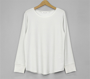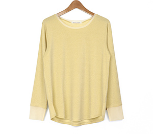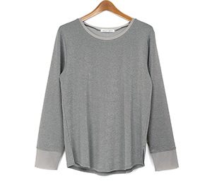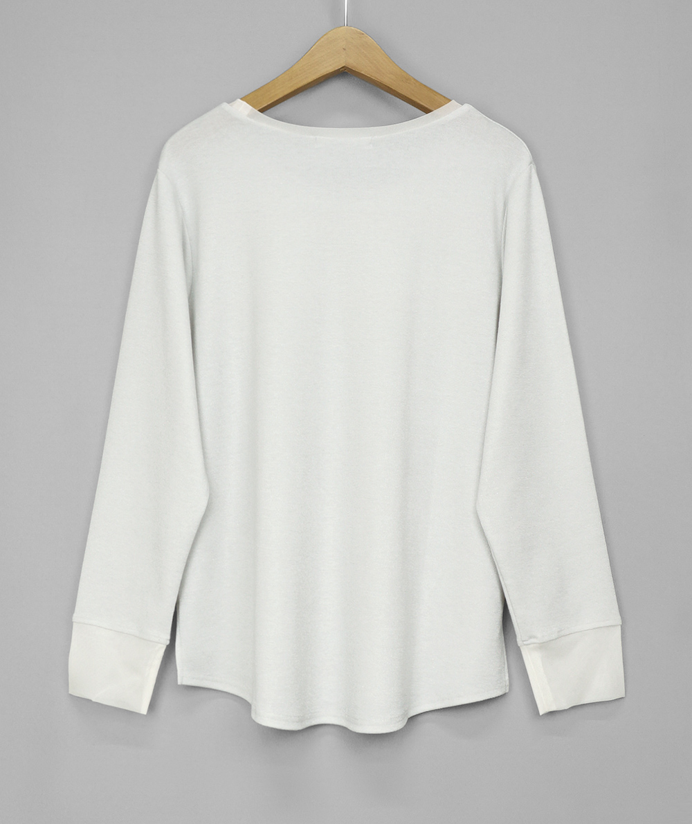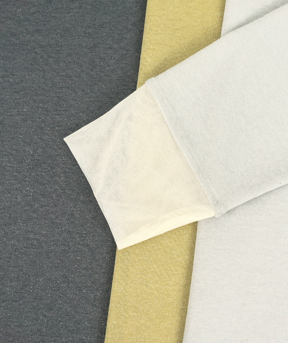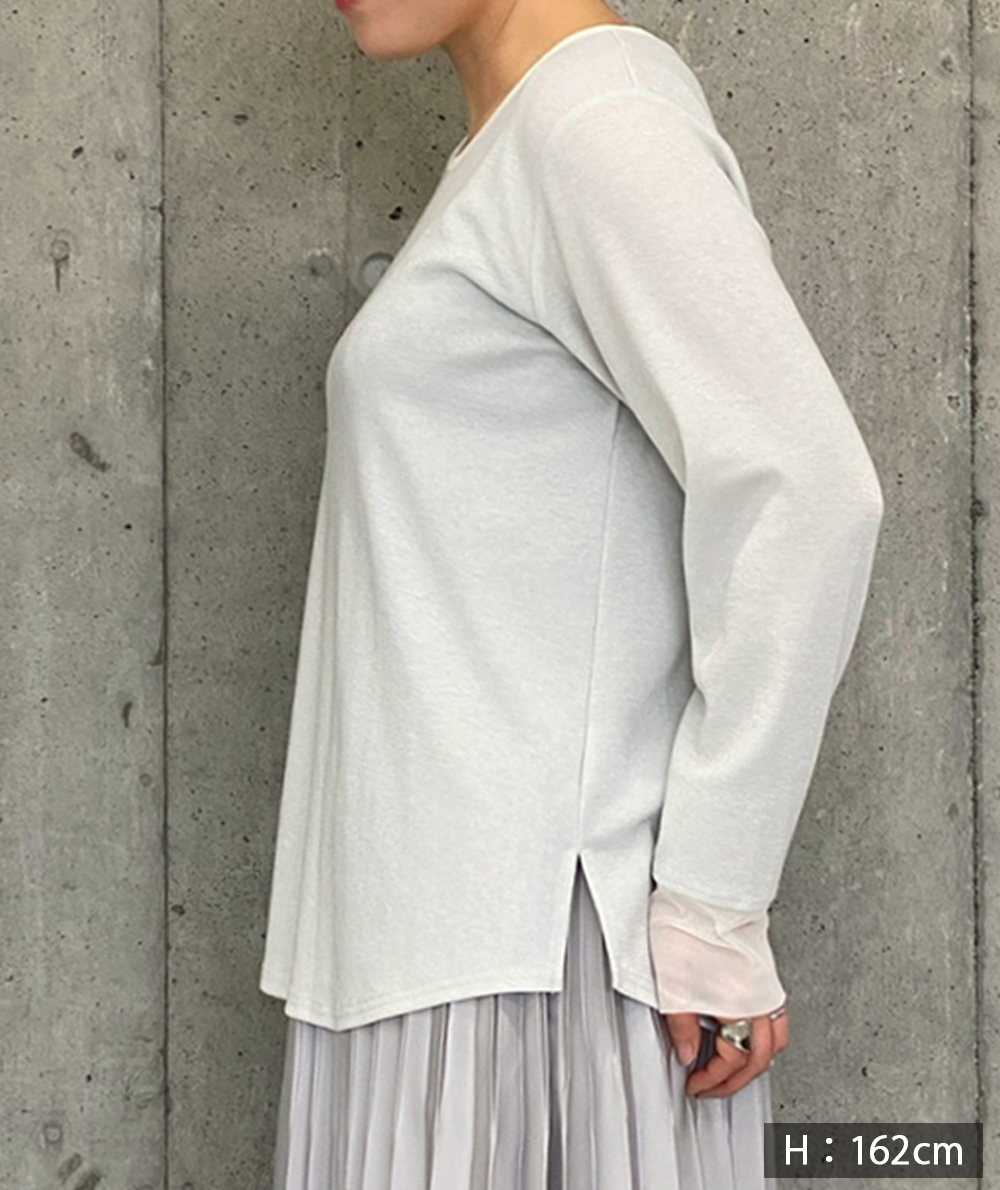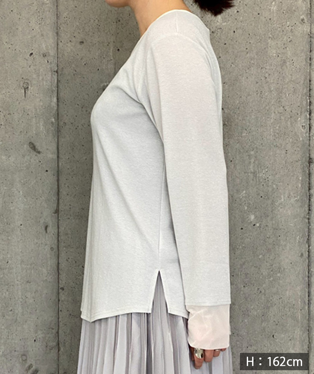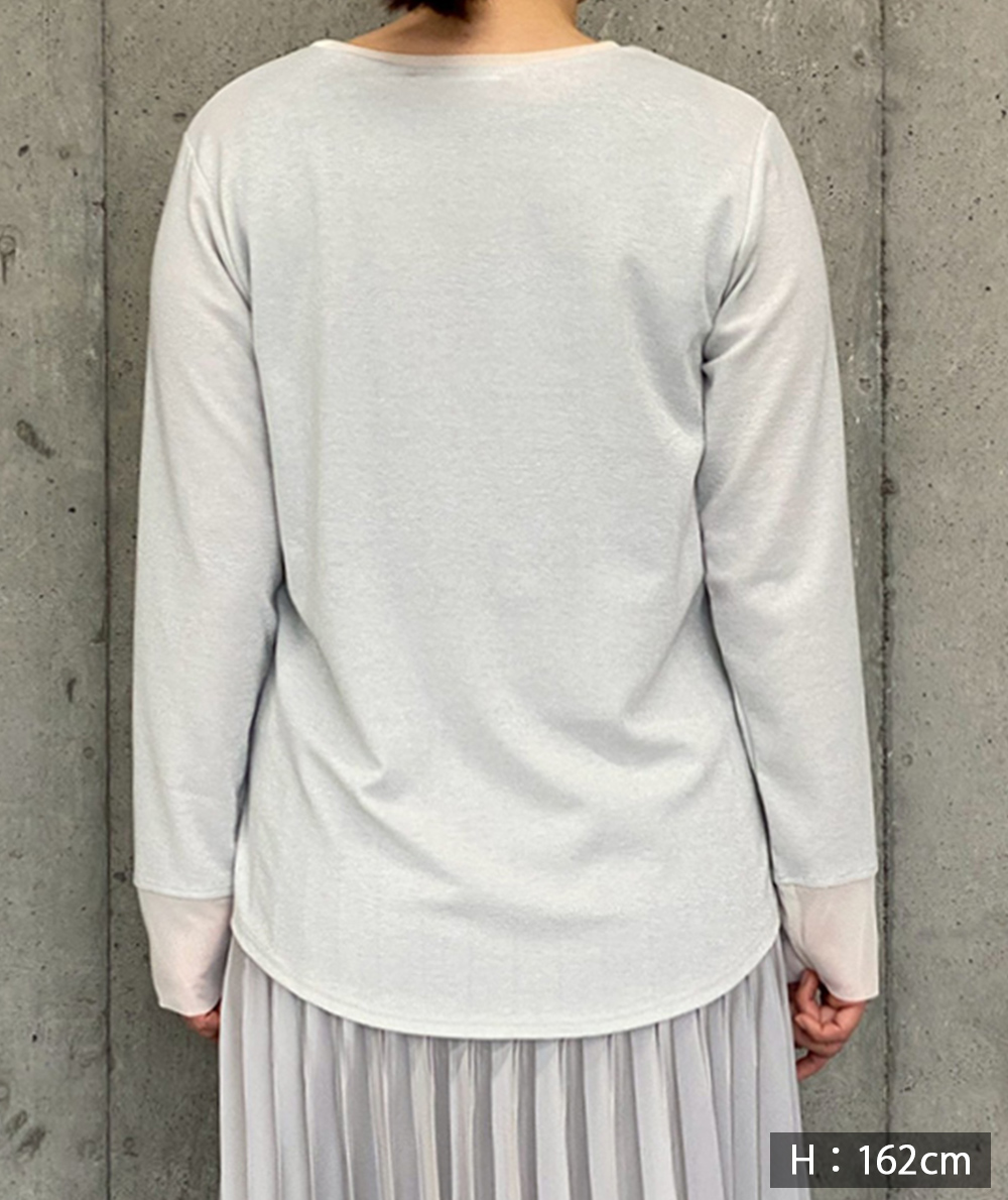 ノースリーブで人気のさりげないラメ生地を使用したロンTは衿ぐりと袖口にチュールを施し、軽やかな雰囲気に仕上げました。伸縮性と肌触りの良い生地でインナーに重宝します。春先にシャツや羽織のインナーなど様々なコーディネートに映えるTシャツです。