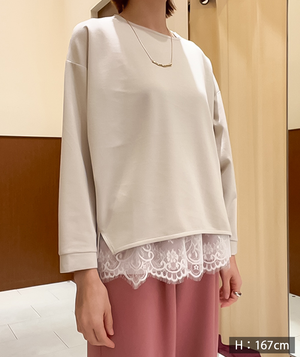 裾にレースとチュールをドッキングしたノースリーインナーがセットになったプルオーバーは、1枚でトレンド感のあるコーディネートが完成する便利アイテムです。トップスは薄手のボンディング素材を使用し、ゆったりとしたサイジングでストレスフリーに着ていただけます。デニムやワイドパンツと合わせたデイリースタイルがおすすめです。