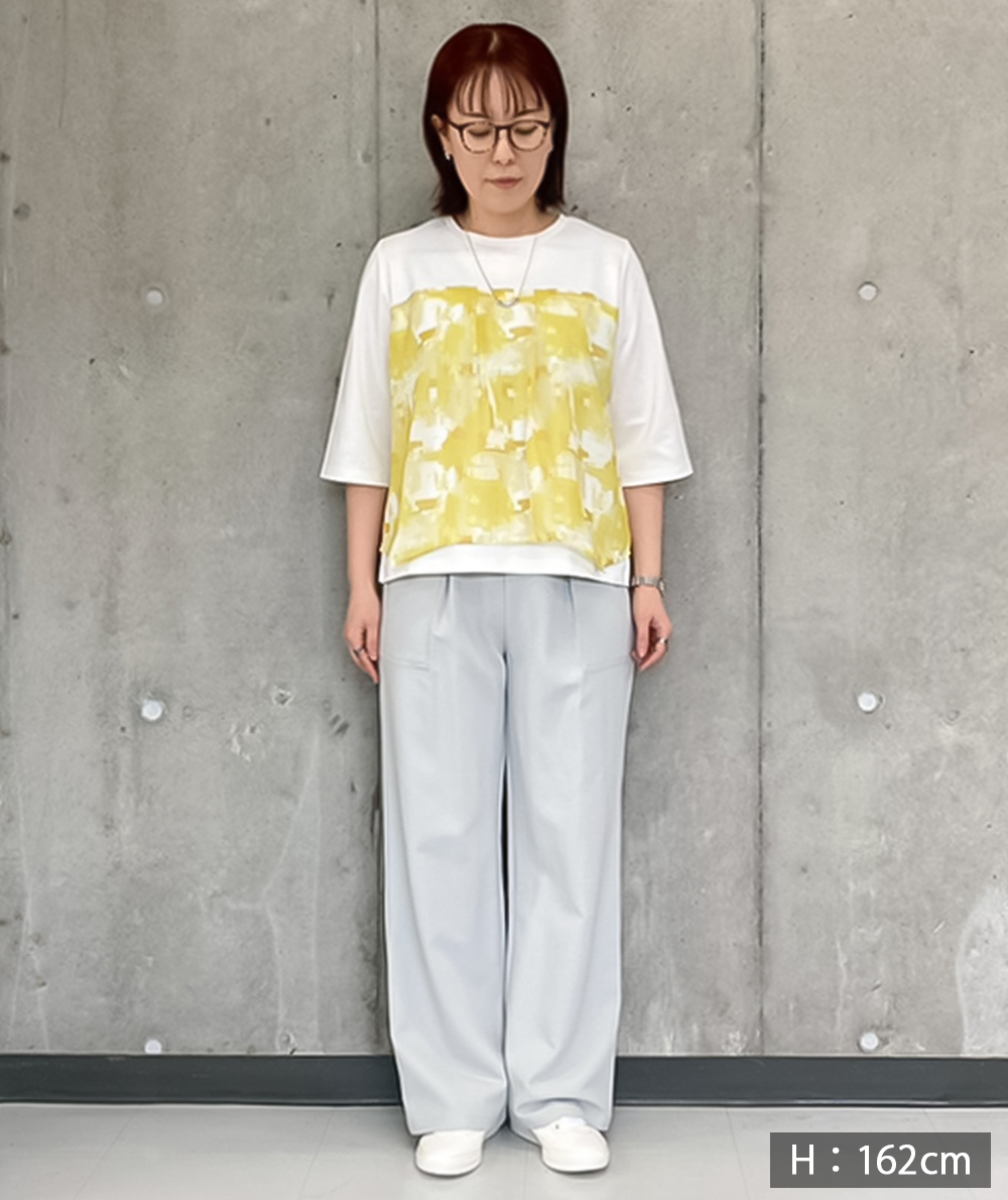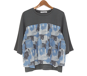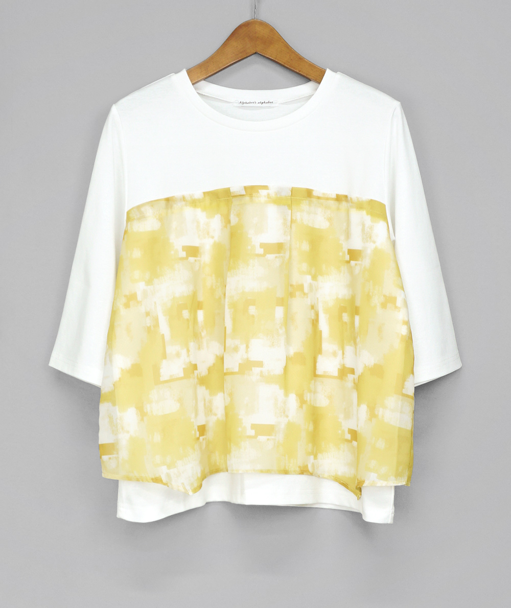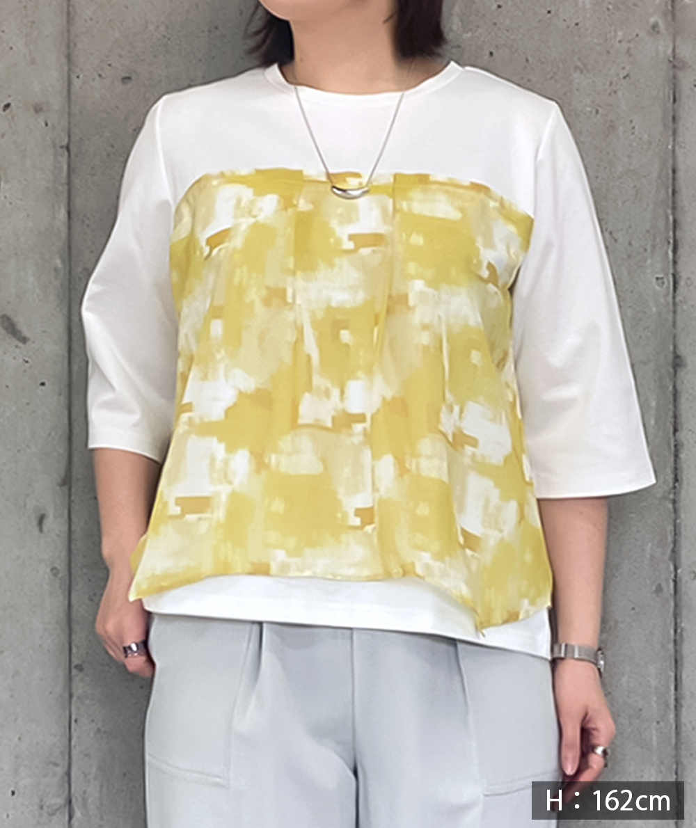 カットソーとシフォンをドッキングしたTシャツは程よく透け感があり涼しげに見えるTシャツです。上から羽織っても1枚でもサマになるデザインです。肘が隠れる袖丈で春から初夏まで長く着用いただけます。プリントのシフォンはオリジナルプリントで他にはないデザインです。