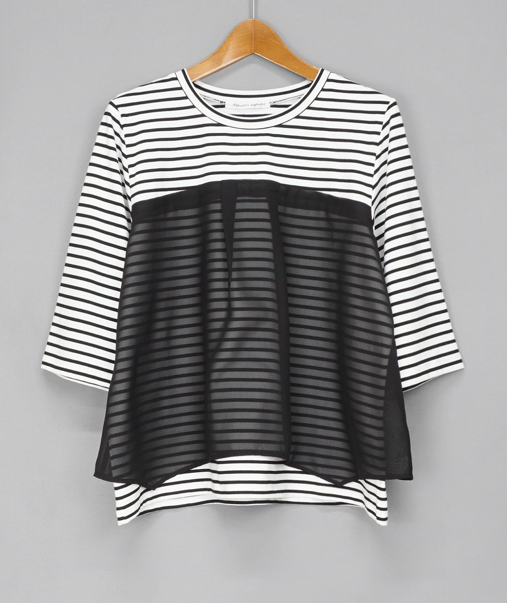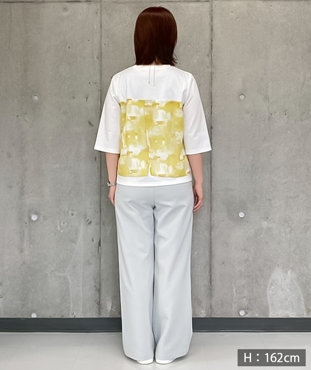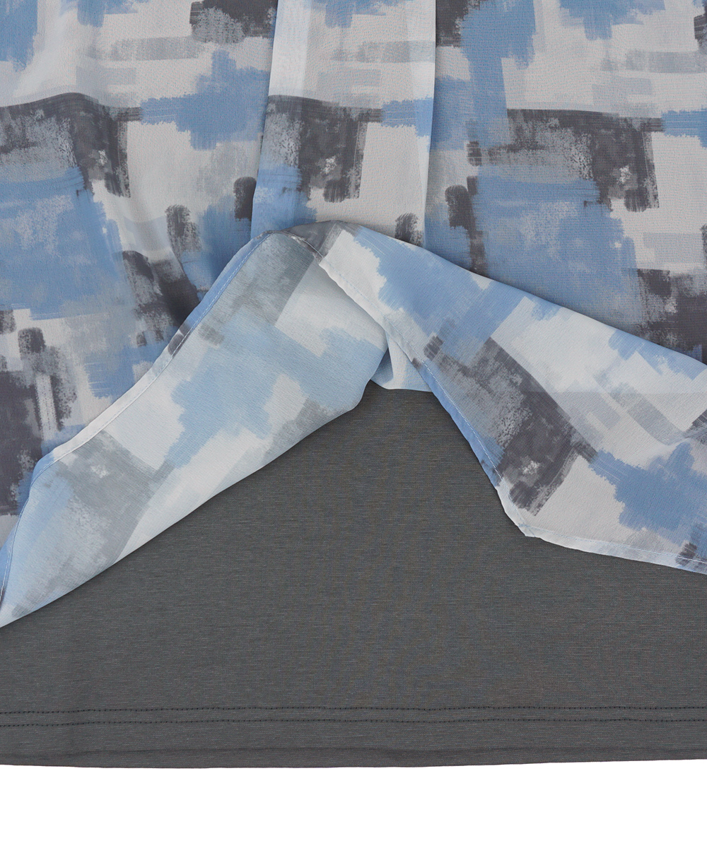 カットソーとシフォンをドッキングしたTシャツは程よく透け感があり涼しげに見えるTシャツです。上から羽織っても1枚でもサマになるデザインです。肘が隠れる袖丈で春から初夏まで長く着用いただけます。プリントのシフォンはオリジナルプリントで他にはないデザインです。