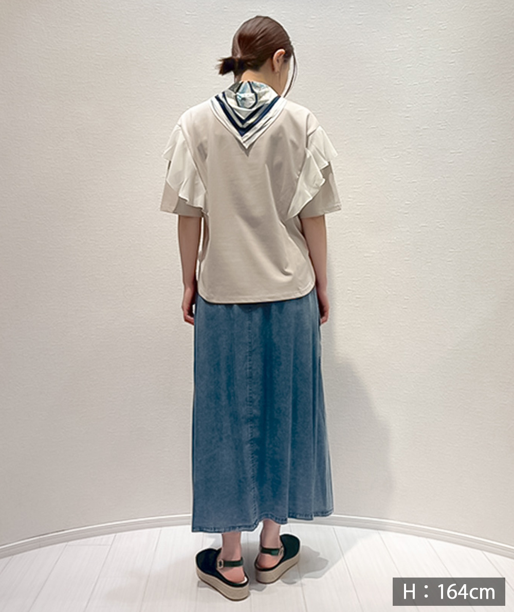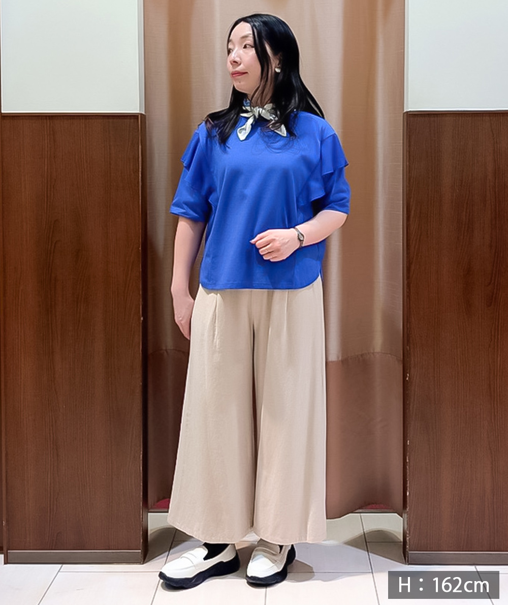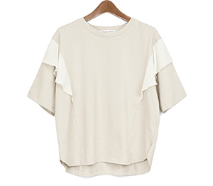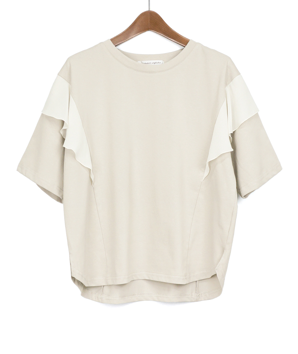 異素材の肩フリルが印象的なTシャツは、二の腕周りもカバーできる嬉しいデザインです。接触冷感で取り扱いしやすいカット素材でシンプル派さんも挑戦しやすい、着映えTシャツです。スカートやワイドパンツにインせず合わせやすい着丈も魅力。