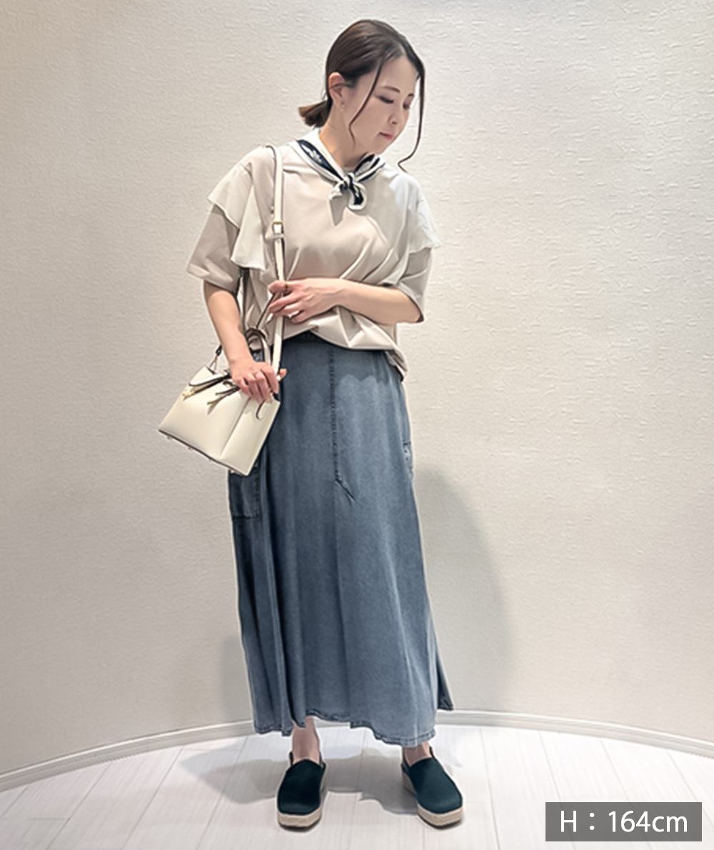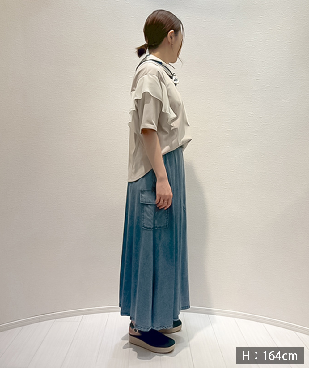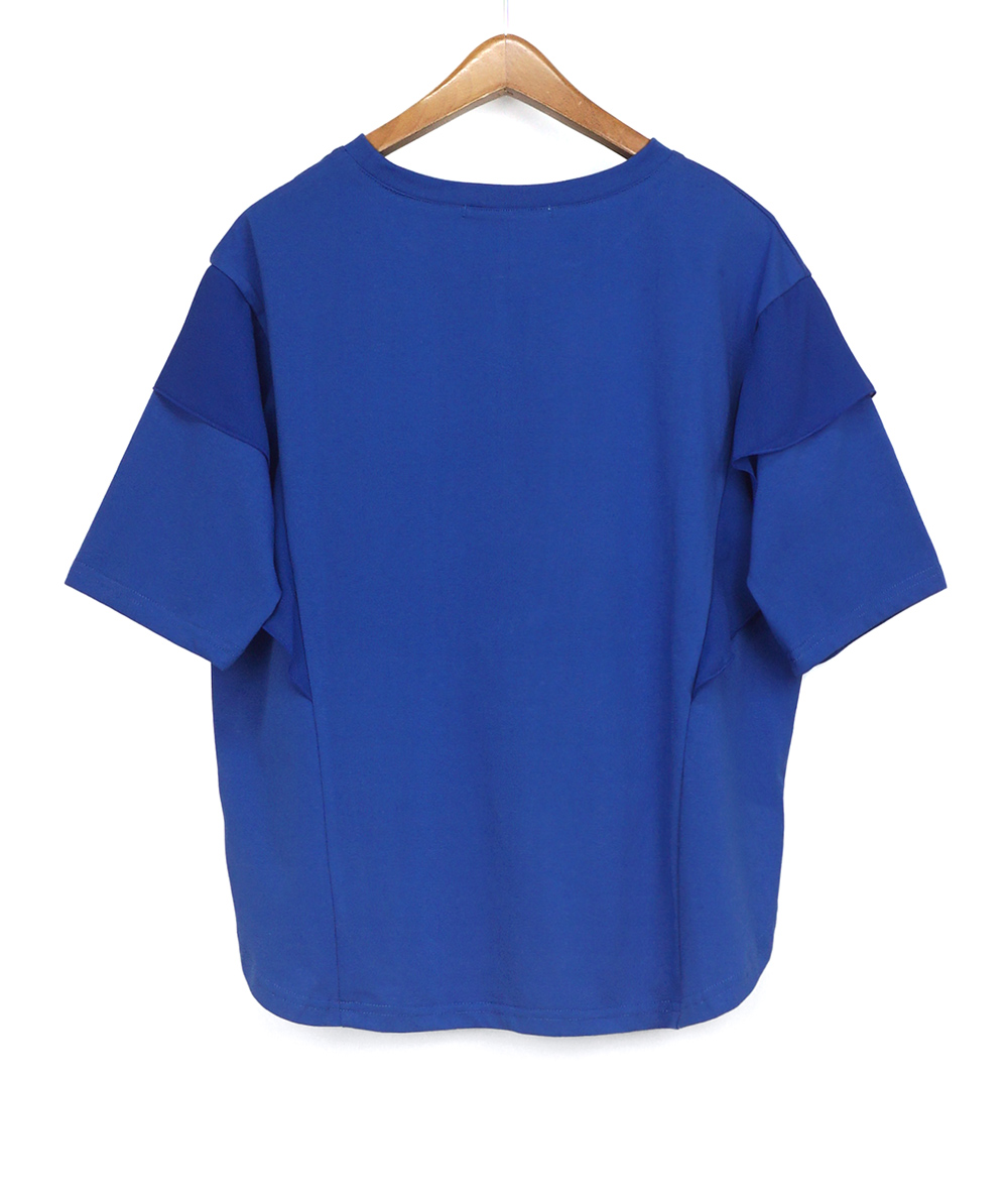 異素材の肩フリルが印象的なTシャツは、二の腕周りもカバーできる嬉しいデザインです。接触冷感で取り扱いしやすいカット素材でシンプル派さんも挑戦しやすい、着映えTシャツです。スカートやワイドパンツにインせず合わせやすい着丈も魅力。