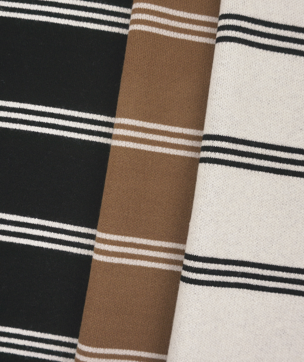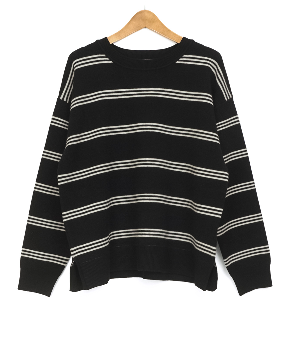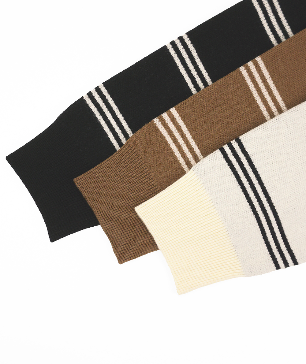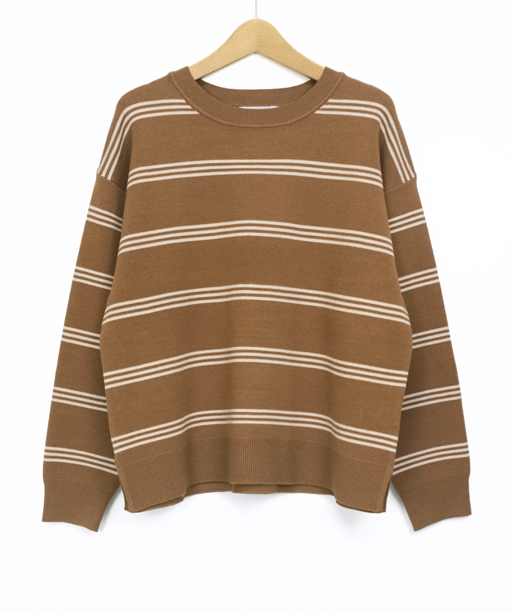 程よい厚さのマルチボーダーニットは、ボトムスとのバランスをとりやすいように腰くらいの丈に仕上げています。両脇にスリットを入れているので腰回りにゆとりがあり、気になるお腹もカバーしてくれます。ラフに見やすいボーダーもニットで仕上げているため、程よい大人カジュアルな雰囲気に仕上がっています。カジュアルなデニムからマニッシュなワイドパンツやレディライクなロングスカートまで幅広く合わせていただけます。