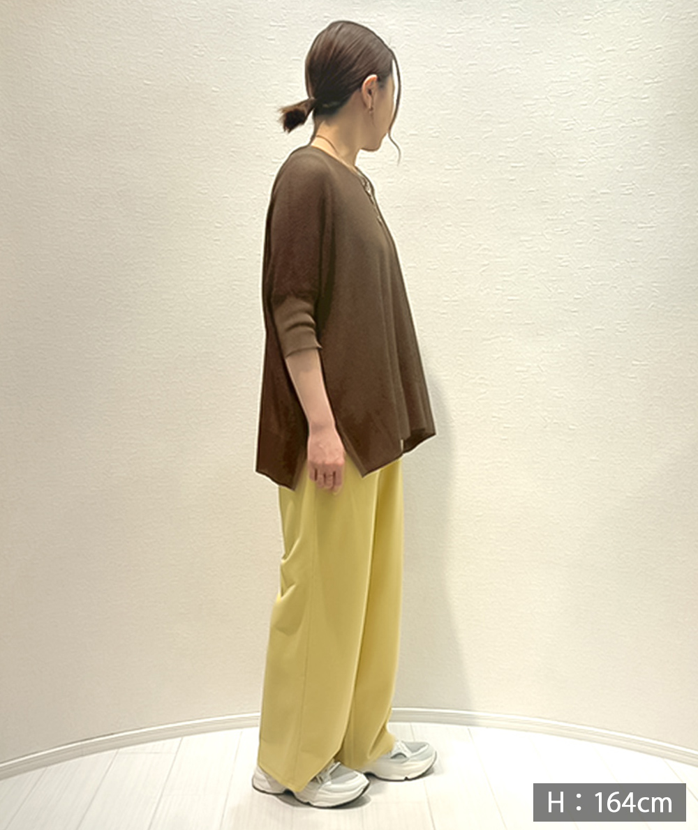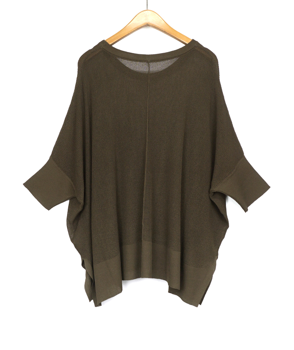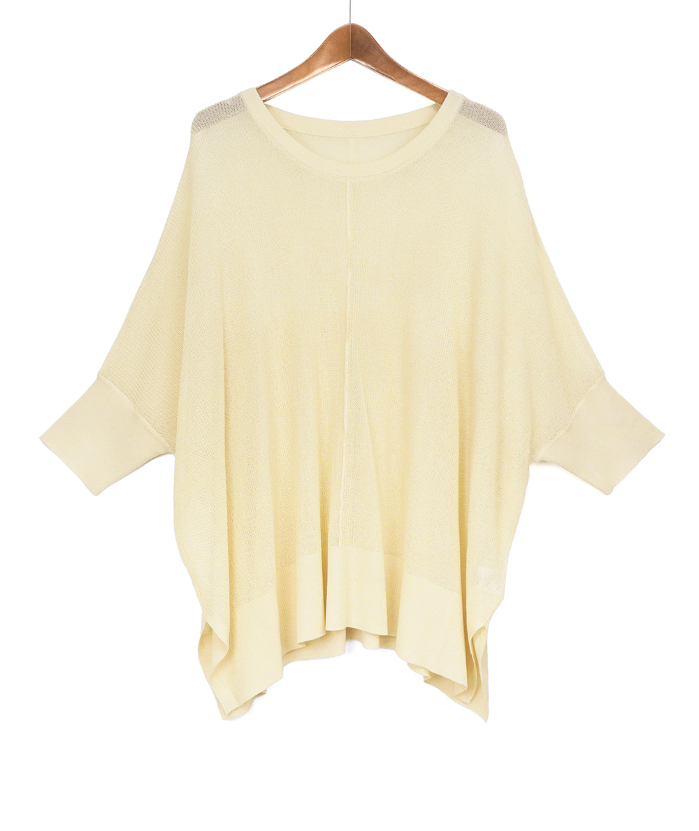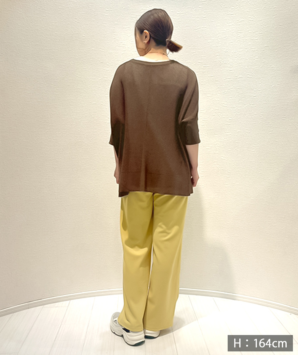 UVカット・接触冷感の機能糸で編んだニットはBOXシルエットで身体のラインをひろわないデザイン。お袖はソフトフィットのリブ仕様。身幅はゆとりがありますが、お袖はフィットしてるのですっきり見えします。やや透け感があるのでインに合わせるもの次第で着回しの幅が広がります。インナーは裾からレースを合わせるトレンドのコーディネートもおすすめです。ボトムスを選ばないので着回しのきくアイテムです。
