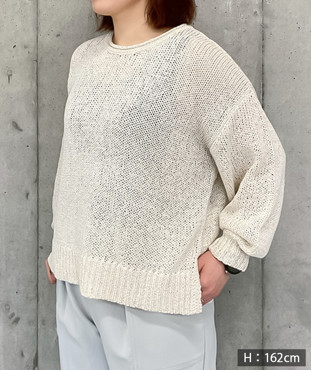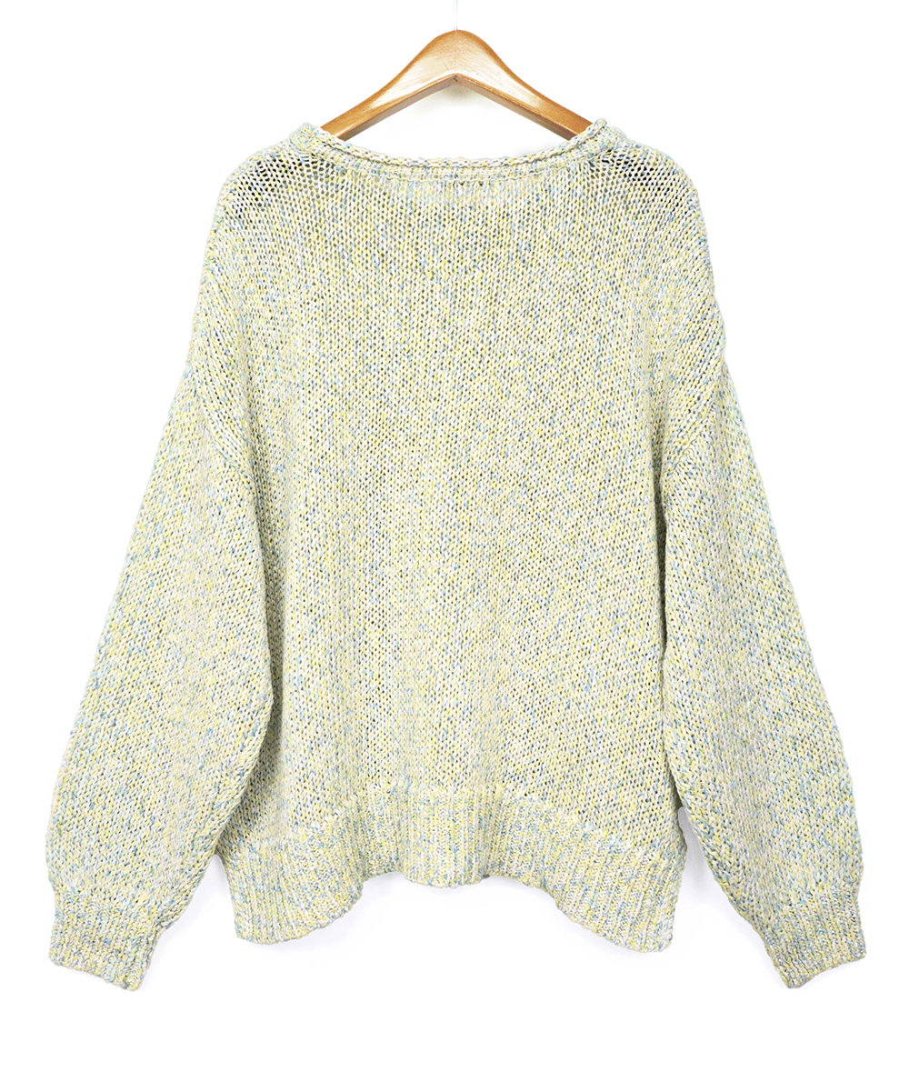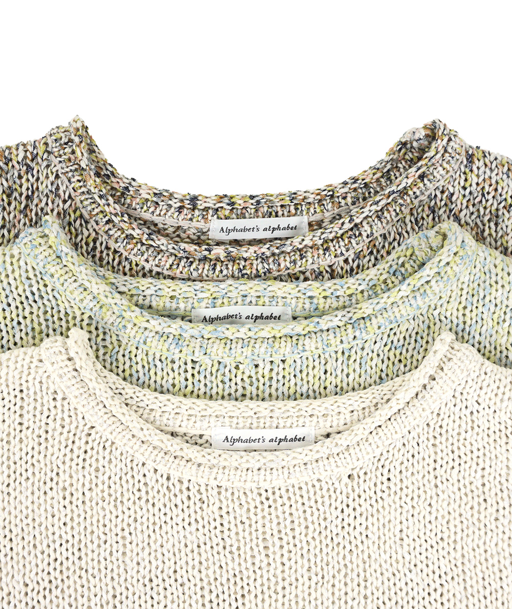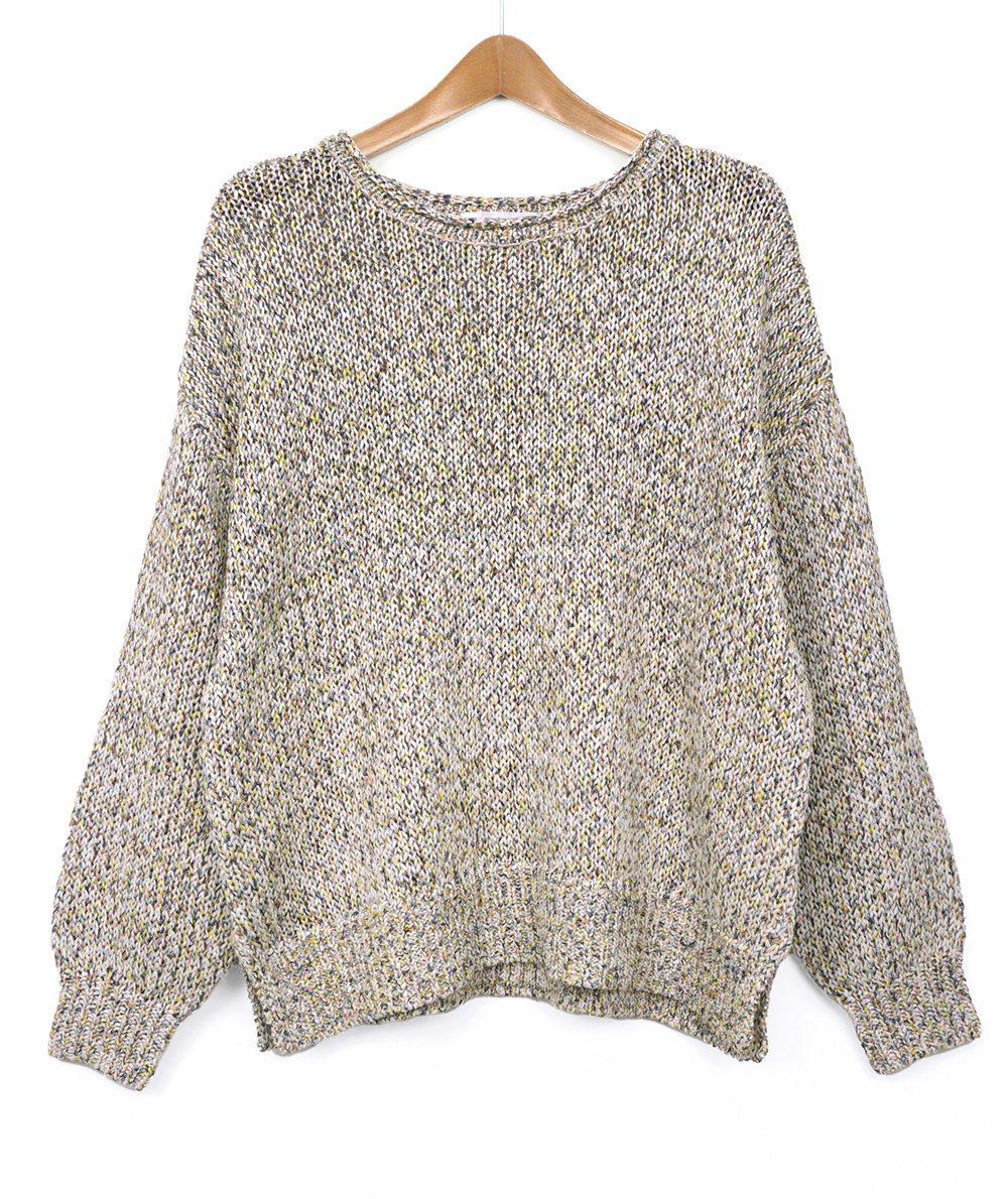 テープヤーンで編み立てたニット。程よくゆとりのあるシルエットでストレスフリーな着心地です。奥行きを感じる多色見えカラーも魅力的。日々のコーデに取り入れやすくスタイリングに重宝するアイテム。衿ぐりはスッキリとしたラウンドネックを採用。合わせやすいシンプルなデザインで、マルチに合わせられ重宝するアイテムです。