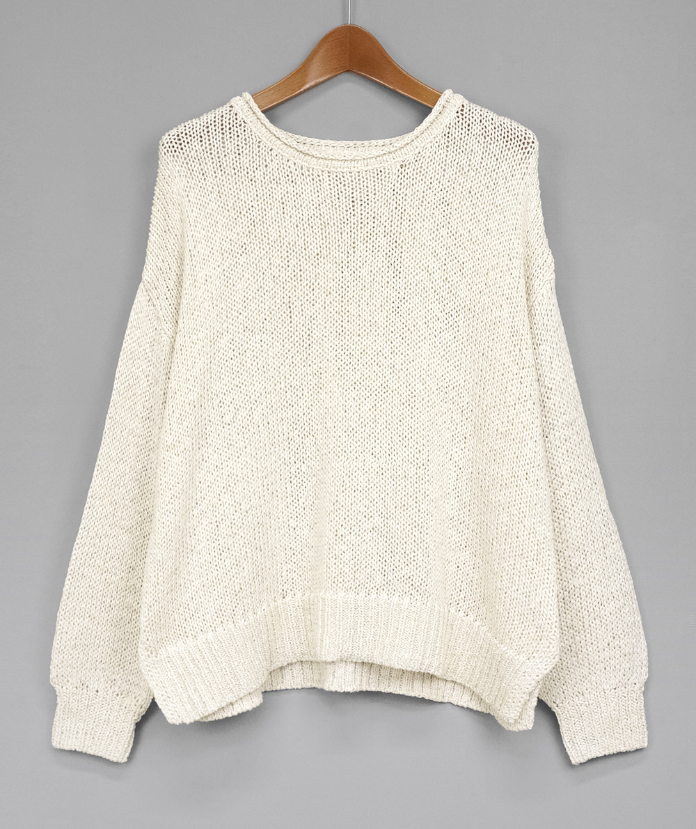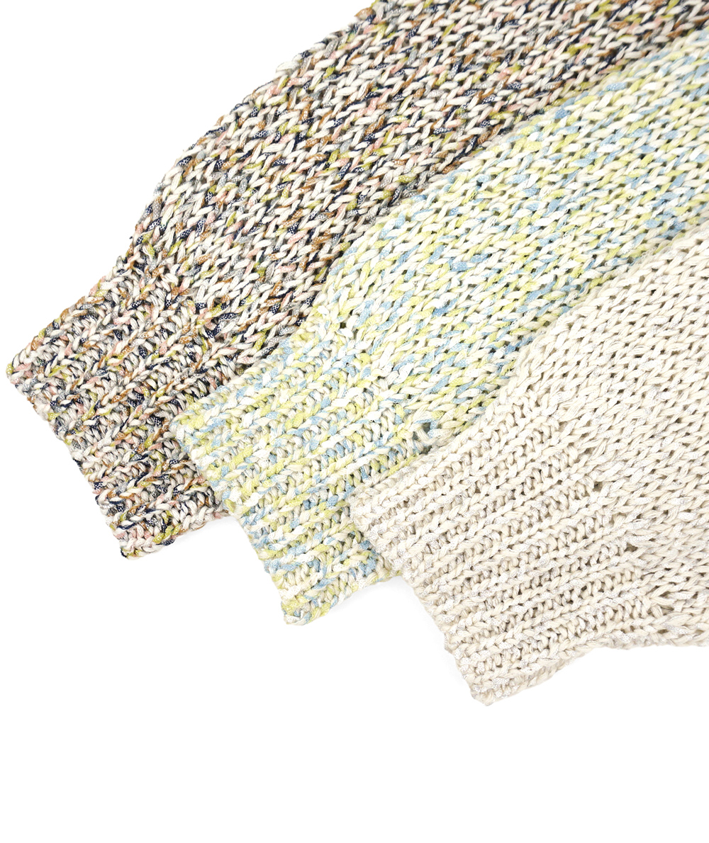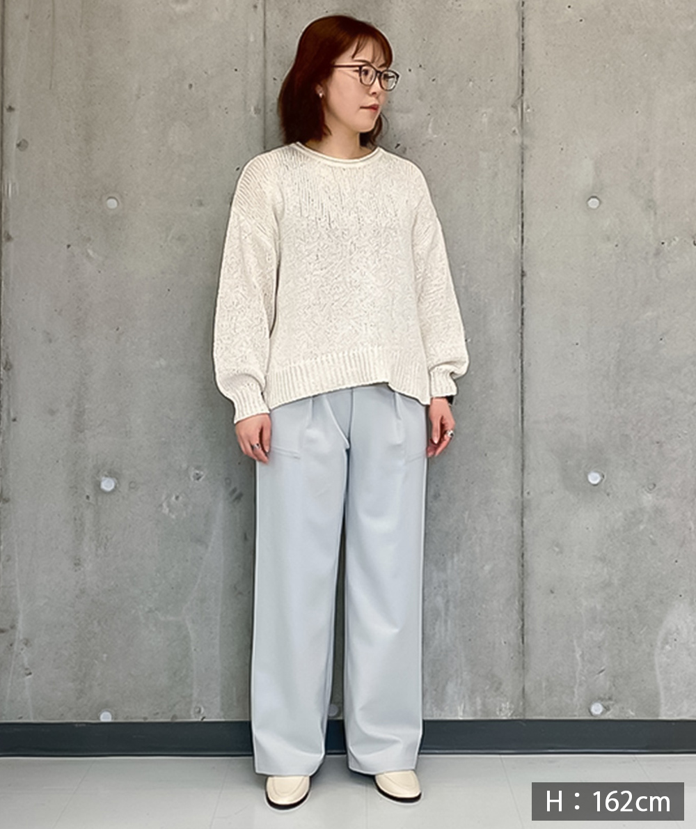 テープヤーンで編み立てたニット。程よくゆとりのあるシルエットでストレスフリーな着心地です。奥行きを感じる多色見えカラーも魅力的。日々のコーデに取り入れやすくスタイリングに重宝するアイテム。衿ぐりはスッキリとしたラウンドネックを採用。合わせやすいシンプルなデザインで、マルチに合わせられ重宝するアイテムです。